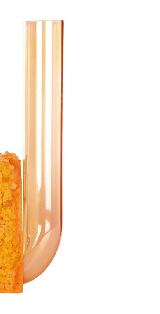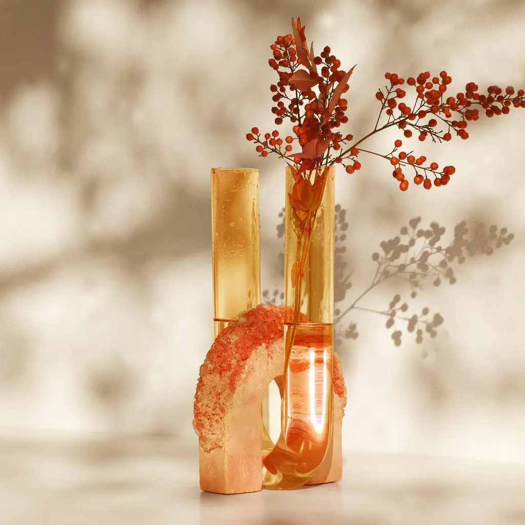 Autumn Cochlea Della Liberazione Seasons edition vase by Coki BarbieriDimensions: W 14 x D 14 x H 30 cm.Materials: Handcrafted stone made with Matera stone fragments, sedimentary rocks of the Italian Apennines and pure water, Italian rock salt crystals, pink and yellow mineral pigments from Italian soils, orange painted borosilicate glass.Cochlea della Liberazione - SEASONS EDITION - Autumn Embellished with Italian rock salt crystals colored with natural pigments from the Italian subsoil, this vase from the Cochlea collection (inspired by the metamorphosis of snails) represents architecture and nature united together: curved and geometric shapes resulting from glass and sustainable stone.Like all COKI products, it is entirely made in Italy with raw materials processed according to the highest standards of recovery of virgin stones and using only substances that are not harmful to humans and the environment, without components of animal origin.The particular technique Glaciazione makes it possible to unite crystals and the handcrafted stone created from fragments of historical stones found in Matera (Città dei Sassi, UNESCO World Heritage, European Capital of Culture) and sedimentary rocks of the Italian Apennines, recovered and reprocessed following a sustainable production cycle. This material research is originalfrom the COKI studio and uses a natural chemical and physical adhesion process between the two materials. The result is a composite material, biodegradable in water, so it is recommended not to wet the stone part and always keep it away from sources of humidity.A precious objects collection made in Italy with natural and vegan origin materials, conceived by architectural and product designer Coki Barbieri and created by the local craftsmen to expand a new slow living awareness and surround oneself with a few objects, capable of staying alongside us over time.The climate emergency and increased future anxiety push our work to imagine alternative ways of living, producing, and consuming. For that Coki Barbieri uses notions of geology, chemistry, and design culture to create new products (and materials) from fragments and waste from natural products (such as stone and minerals).Coki Barbieri established her eponymous studio-workshop in Rimini in 2017, bringing to life a sustainable way of conceiving the product design for home. Nature inspires her environmentally conscious creations, which are imbued with emotional energy while maintaining their aesthetic impact and practical functionality. Coki collaborates with talented Italian craftsmen to produce one-of-a-kind homeware objects capable of unlocking new synergies between concepts, materials, and use.