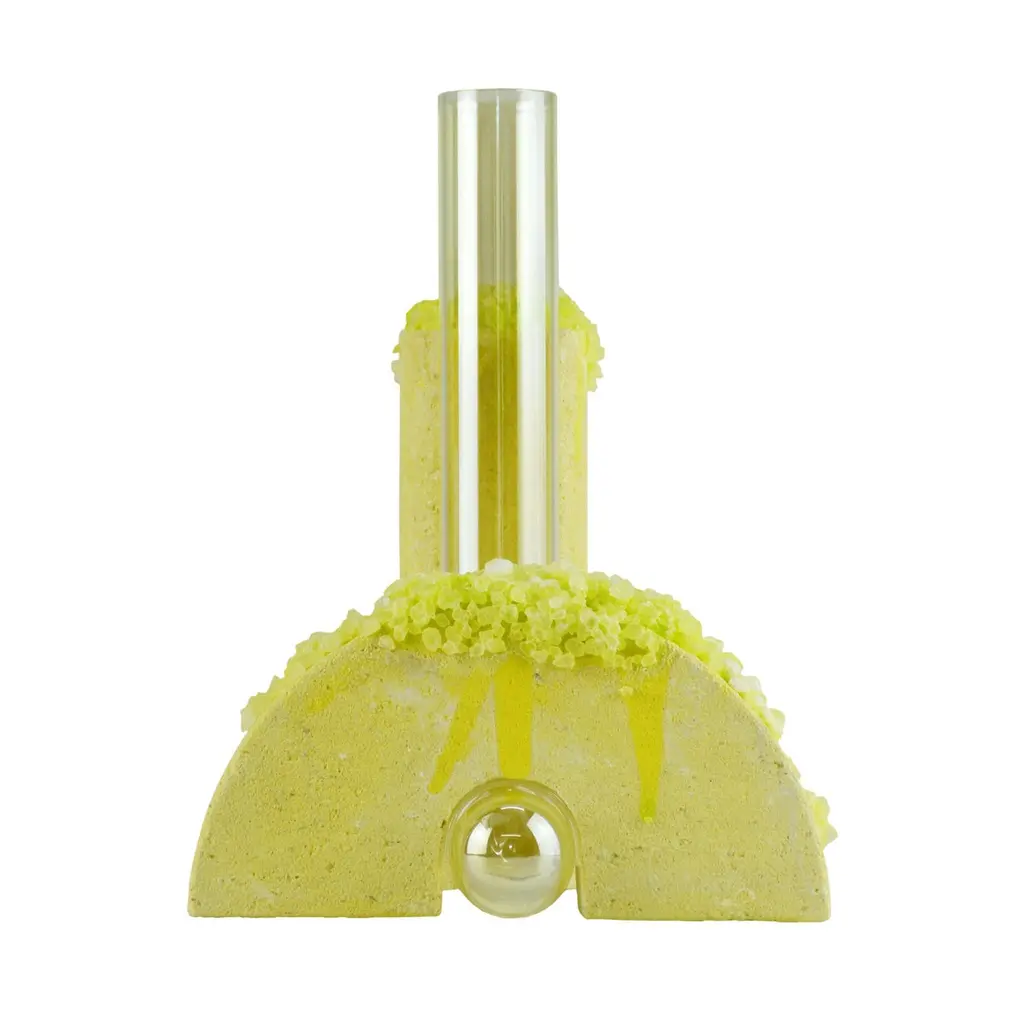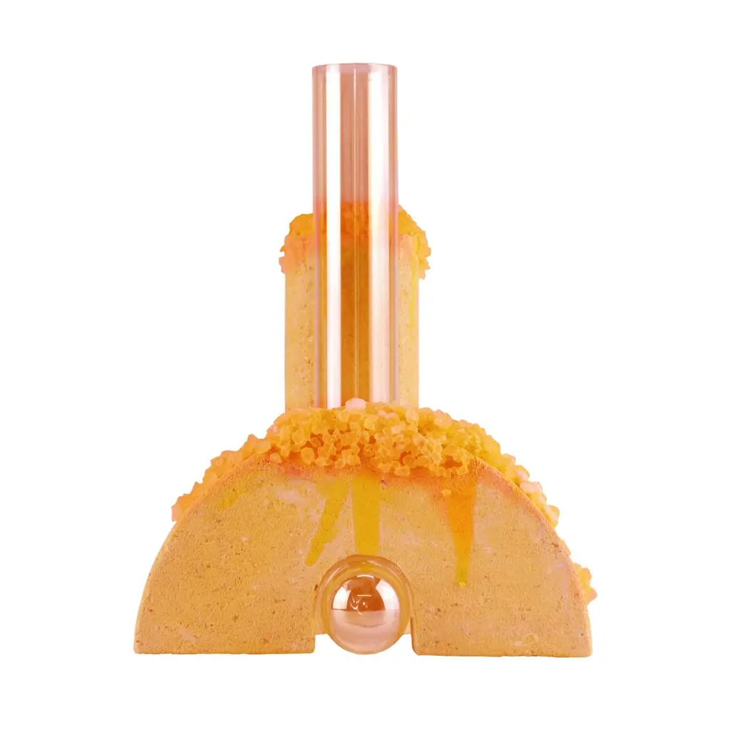 Spring Cochlea della Metamorfosi 1 seasons edition vase by Coki Barbieri.Dimensions: W 18,5 x D 15 x H 24 cm.Materials: Handcrafted stone made with Matera stone fragments, sedimentary rocks of the Italian Apennines and pure water, Italian rock salt crystals, pink and yellow mineral pigments from Italian soils, orange painted borosilicate glass.Cochlea della Metamorfosi 1 - SEASONS EDITION - AutumnEmbellished with Italian rock salt crystals colored with natural pigments from the Italian subsoil, this vase from the Cochlea collection (inspired by the metamorphosis of snails) represents architecture and nature united together: curved and geometric shapes resulting from glass and sustainable stone.Like all COKI products, it is entirely made in Italy with raw materials processed according to the highest standards of recovery of virgin stones and using only substances that are not harmful to humans and the environment, without components of animal origin.The particular technique Glaciazione makes it possible to unite crystals and the handcrafted stone created from fragments of historical stones found in Matera (Città dei Sassi, UNESCO World Heritage, European Capital of Culture) and sedimentary rocks of the Italian Apennines, recovered and reprocessed following a sustainable production cycle. This material research is originalfrom the COKI studio and uses a natural chemical and physical adhesion process between the two materials. The result is a composite material, biodegradable in water, so it is recommended not to wet the stone part and always keep it away from sources of humidity.A precious objects collection made in Italy with natural and vegan origin materials, conceived by architectural and product designer Coki Barbieri and created by the local craftsmen to expand a new slow living awareness and surround oneself with a few objects, capable of staying alongside us over time.The climate emergency and increased future anxiety push our work to imagine alternative ways of living, producing, and consuming. For that Coki Barbieri uses notions of geology, chemistry, and design culture to create new products (and materials) from fragments and waste from natural products (such as stone and minerals).Coki Barbieri established her eponymous studio-workshop in Rimini in 2017, bringing to life a sustainable way of conceiving the product design for home. Nature inspires her environmentally conscious creations, which are imbued with emotional energy while maintaining their aesthetic impact and practical functionality. Coki collaborates with talented Italian craftsmen to produce one-of-a-kind homeware objects capable of unlocking new synergies between concepts, materials, and use.