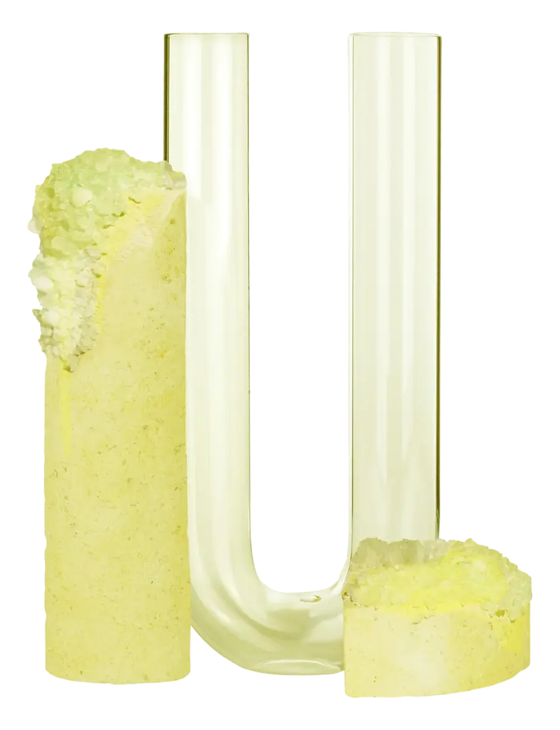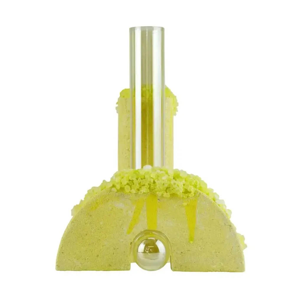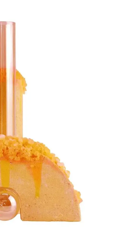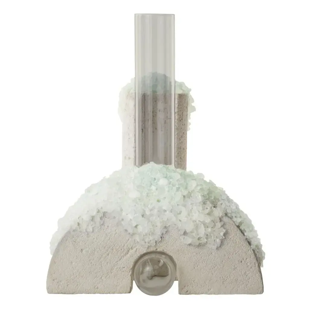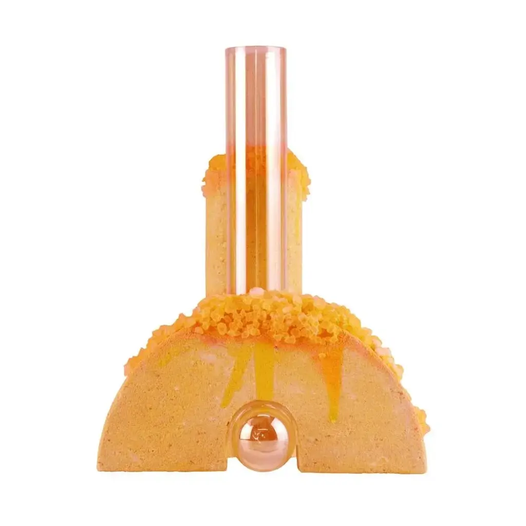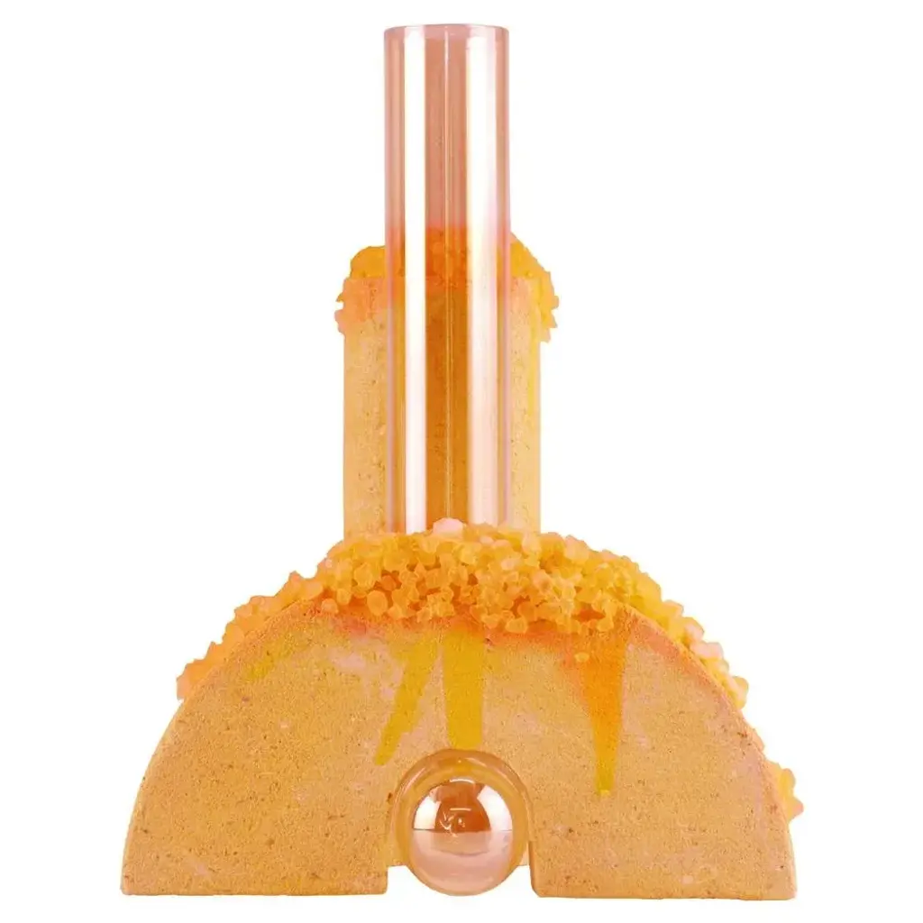 Spring cochlea della metamorfosi 1 seasons edition vase by coki barbieri. Dimensions: w 18,5 x d 15 x h 24 cm. Materials: handcrafted stone made with matera stone fragments, sedimentary rocks of the italian apennines and pure water, italian rock salt crystals, pink and yellow mineral pigments from italian soils, orange painted borosilicate glass. Cochlea della metamorfosi 1 - seasons edition - autumn embellished with italian rock salt crystals colored with natural pigments from the italian subsoil, this vase from the cochlea collection (inspired by the metamorphosis of snails) represents architecture and nature united together: curved and geometric shapes resulting from glass and sustainable stone. Like all coki products, it is entirely made in italy with raw materials processed according to the highest standards of recovery of virgin stones and using only substances that are not harmful to humans and the environment, without components of animal origin. The particular technique glaciazione makes it possible to unite crystals and the handcrafted stone created from fragments of historical stones found in matera (città dei sassi, unesco world heritage, european capital of culture) and sedimentary rocks of the italian apennines, recovered and reprocessed following a sustainable production cycle. This material research is original from the coki studio and uses a natural chemical and physical adhesion process between the two materials. The result is a composite material, biodegradable in water, so it is recommended not to wet the stone part and always keep it away from sources of humidity. A precious objects collection made in italy with natural and vegan origin materials, conceived by architectural and product designer coki barbieri and created by the local craftsmen to expand a new slow living awareness and surround oneself with a few objects, capable of staying alongside us over time. The climate emergency and increased future anxiety push our work to imagine alternative ways of living, producing, and consuming.
