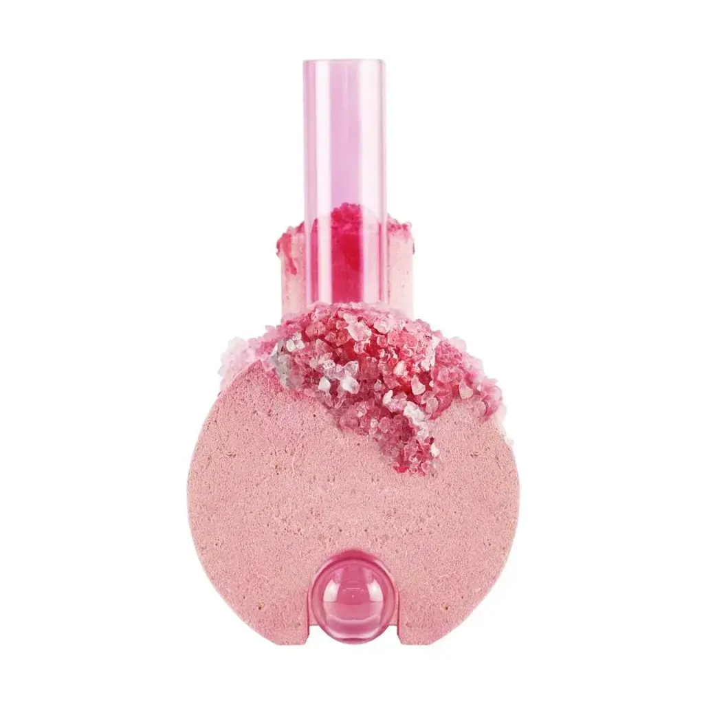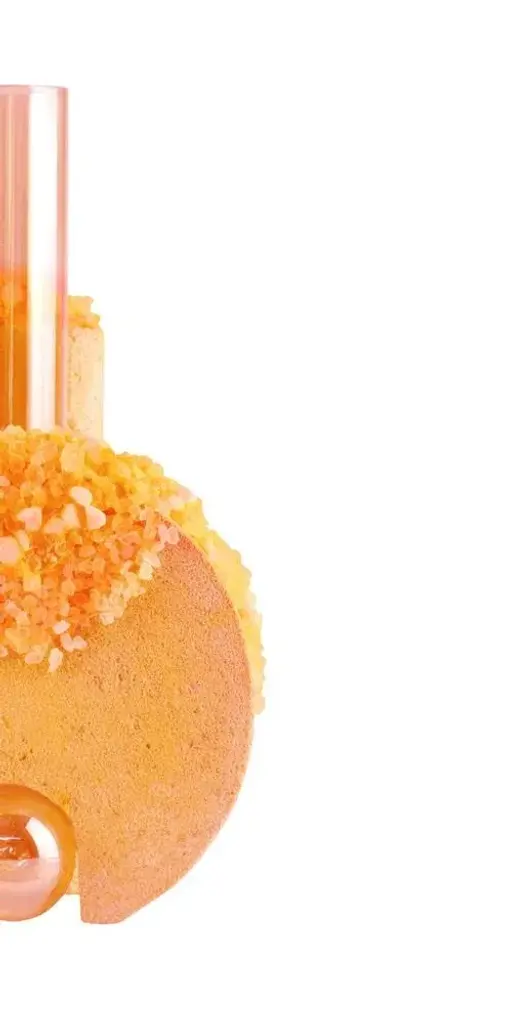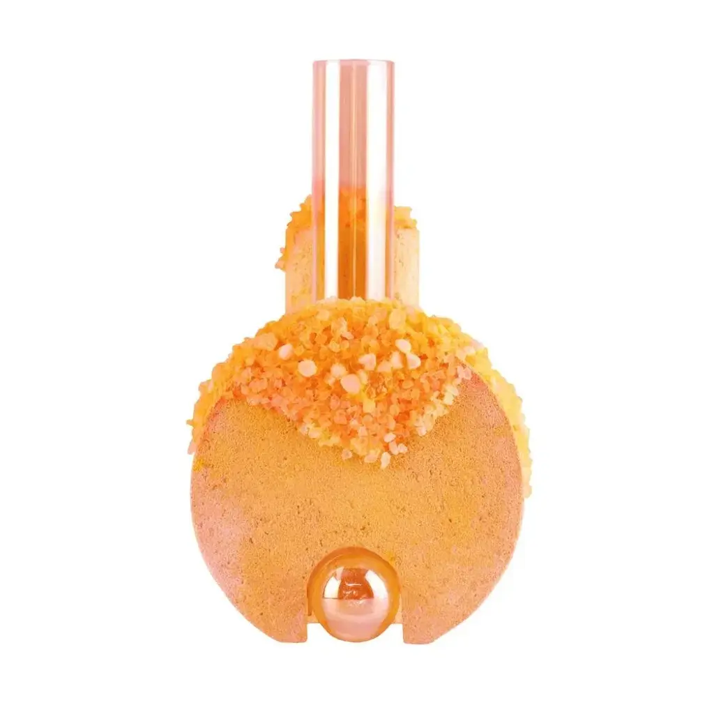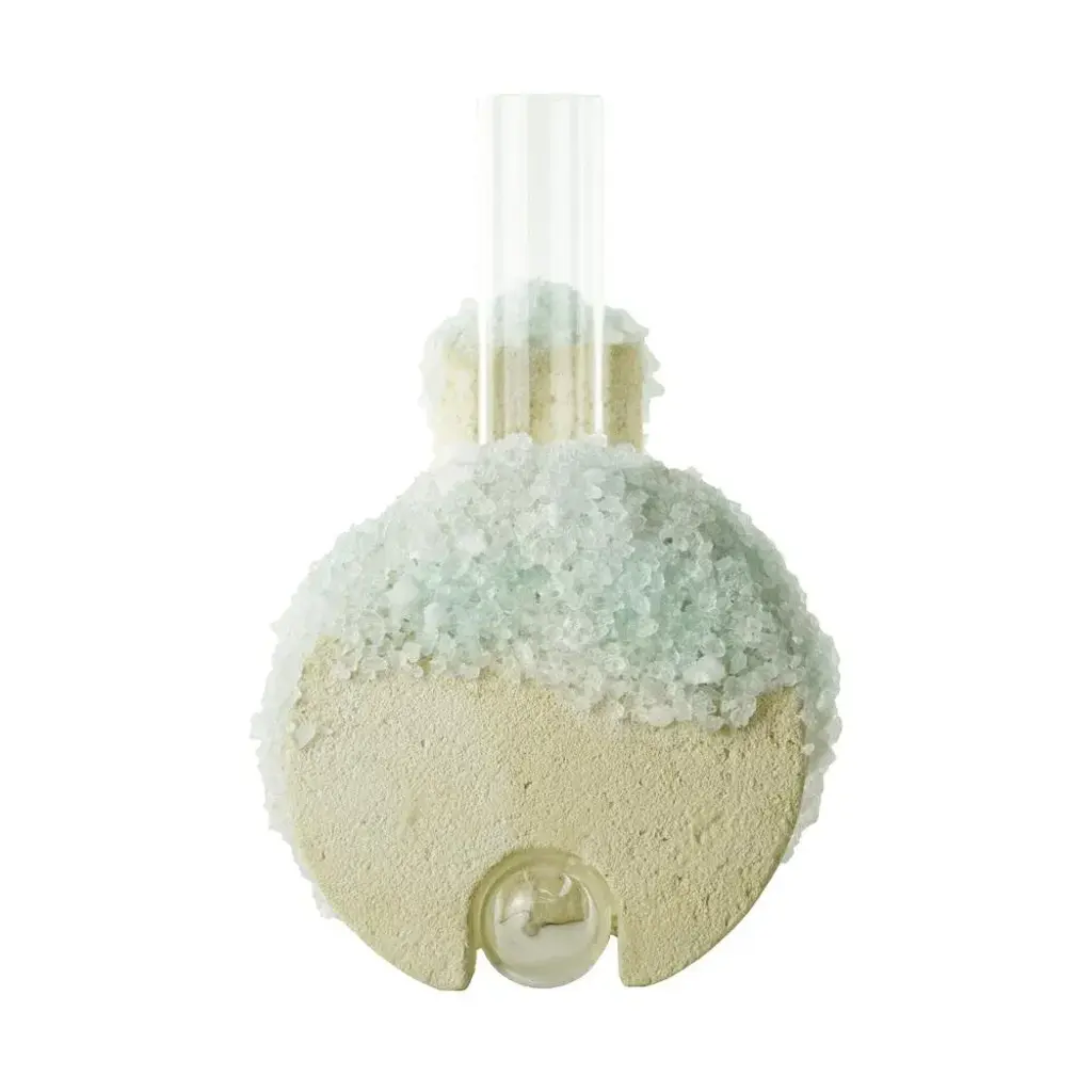 Autumn cochlea della metamorfosi 2 seasons edition vase by coki barbieri dimensions: w 14 x d 15 x h 24 cm. Materials: handcrafted stone made with matera stone fragments, sedimentary rocks of the italian apennines and pure water, italian rock salt crystals, pink and yellow mineral pigments from italian soils, orange painted borosilicate glass. Cochlea della metamorfosi 2 - seasons edition - autumn. Embellished with italian rock salt crystals colored with natural pigments from the italian subsoil, this vase from the cochlea collection (inspired by the metamorphosis of snails) represents architecture and nature united together: curved and geometric shapes resulting from glass and sustainable stone. Like all coki products, it is entirely made in italy with raw materials processed according to the highest standards of recovery of virgin stones and using only substances that are not harmful to humans and the environment, without components of animal origin. The particular technique glaciazione makes it possible to unite crystals and the handcrafted stone created from fragments of historical stones found in matera (città dei sassi, unesco world heritage, european capital of culture) and sedimentary rocks of the italian apennines, recovered and reprocessed following a sustainable production cycle. This material research is original from the coki studio and uses a natural chemical and physical adhesion process between the two materials. The result is a composite material, biodegradable in water, so it is recommended not to wet the stone part and always keep it away from sources of humidity. A precious objects collection made in italy with natural and vegan origin materials, conceived by architectural and product designer coki barbieri and created by the local craftsmen to expand a new slow living awareness and surround oneself with a few objects, capable of staying alongside us over time. The climate emergency and increased future anxiety push our work to imagine alternative ways of living, producing, and consuming.
