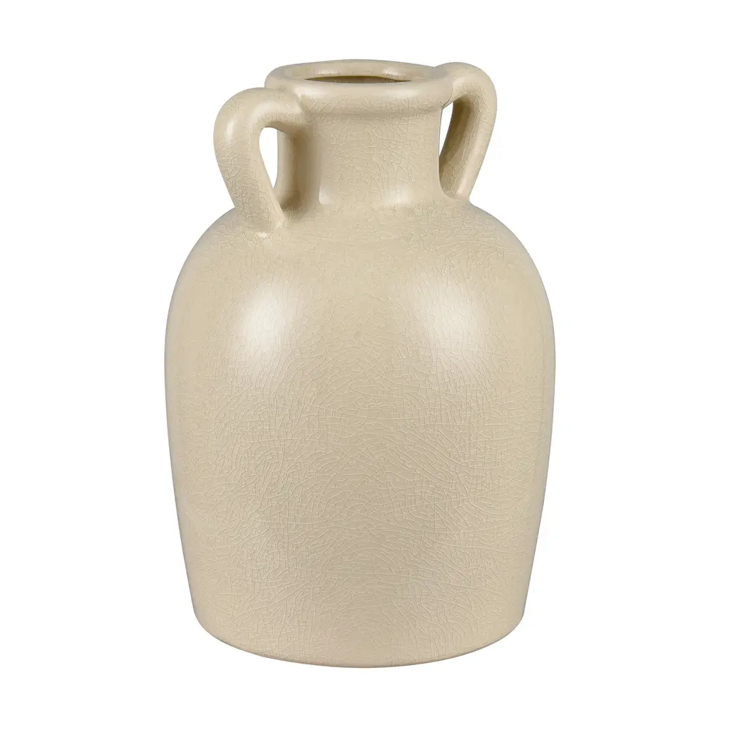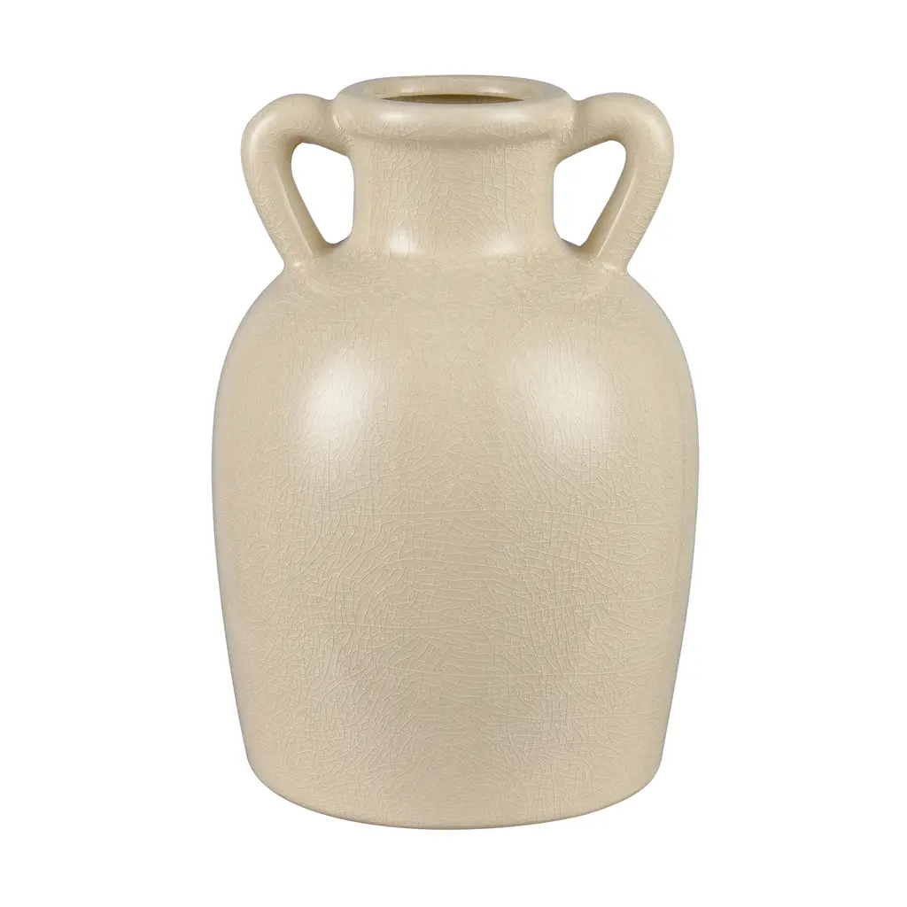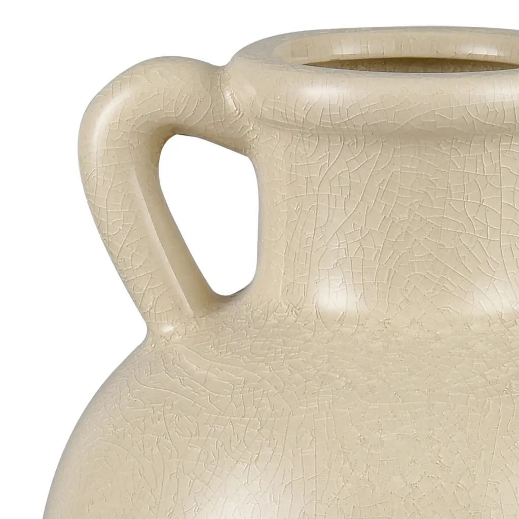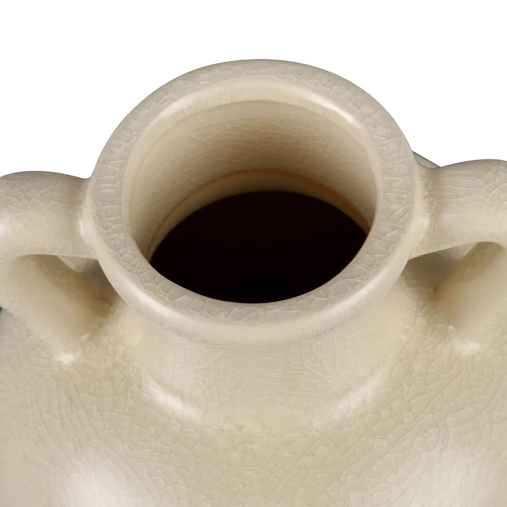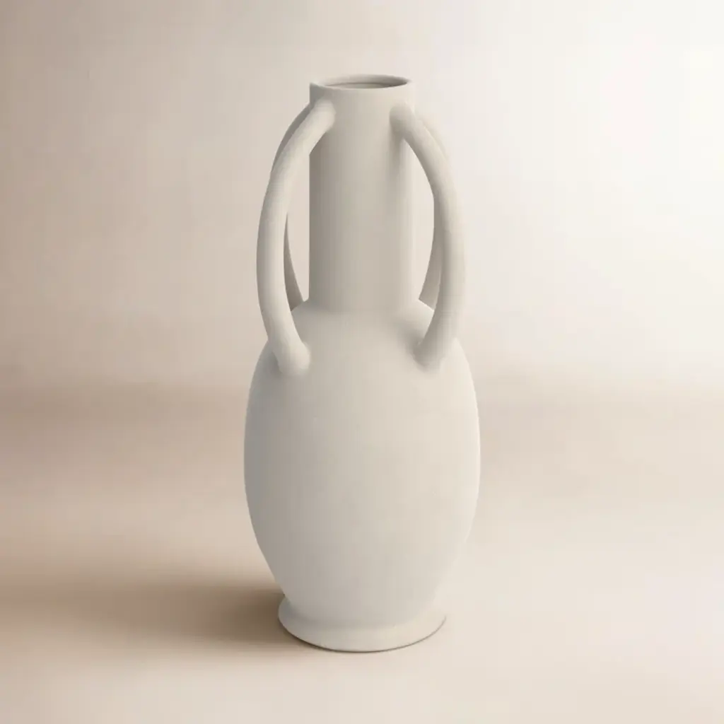 The Babin Small Vase is a modern take on a traditional Greek amphora-style vase, with a rounded body and two handles which connect at the body and at the neck. The earthenware vase is glazed in warm ivory.