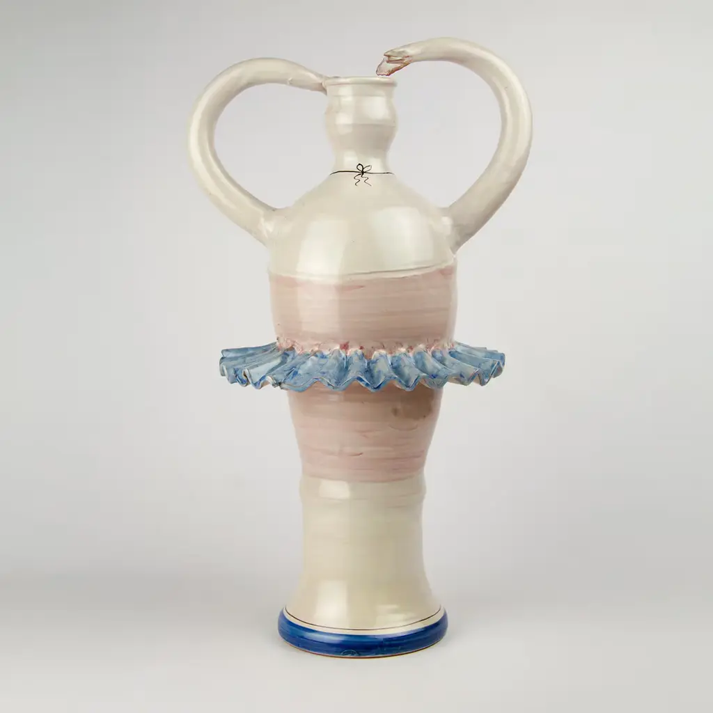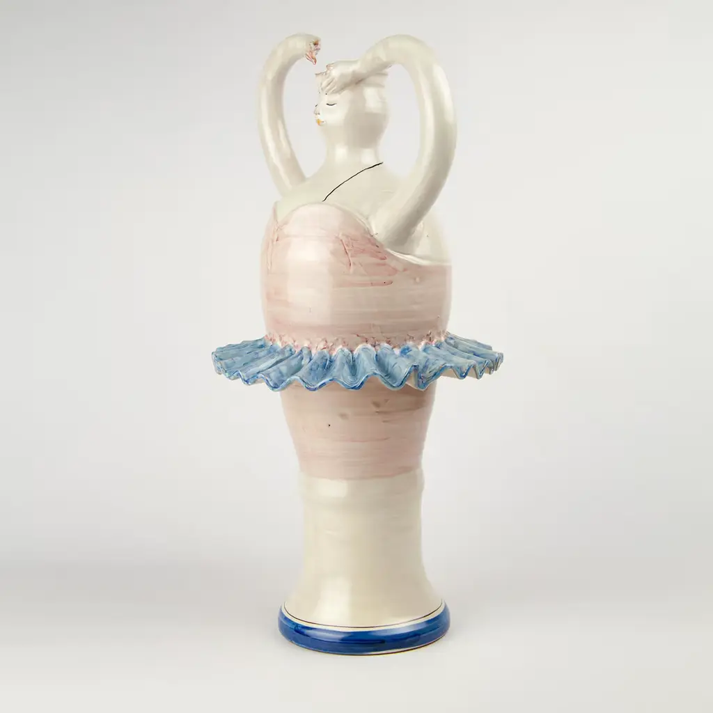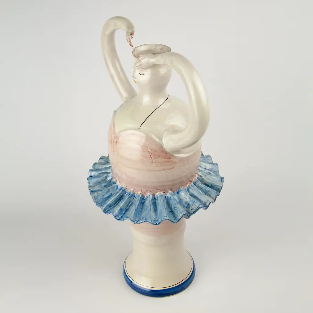 This beautiful and unique vase was achieved using a combination of a lathe, and hand modeling of the details. The vase depicts an elegant ballerina frozen mid-dance. Her arms stretch upwards, joining at the top of the vase to create an elegantly shaped handle for the vase.