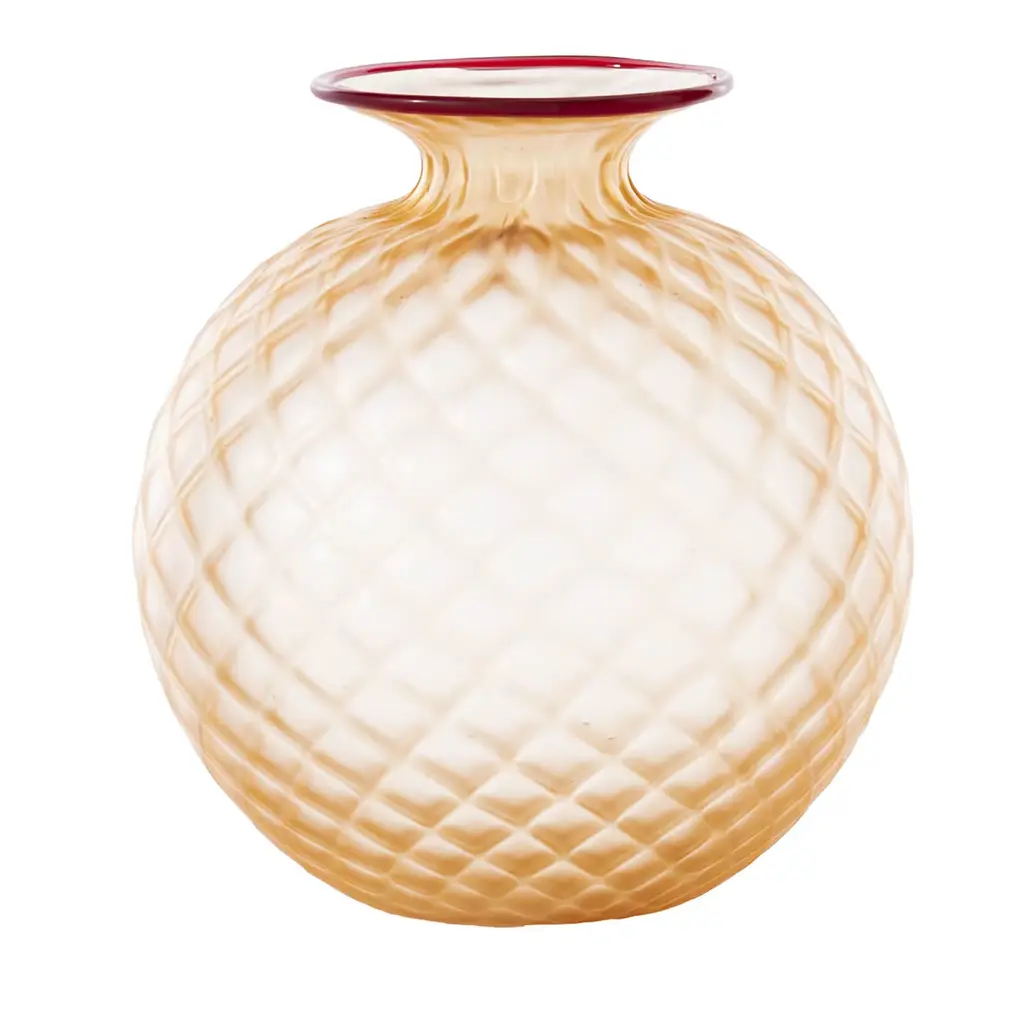 This smaller version of the balloton Fiori vase by Venini offers the same intricate quilted glass texture in a more compact form. The warm amber hue subtly shifts as it moves down the vase, creating a dynamic gradient that enhances the handcrafted design. Topped with the signature red rim, this petite vase is perfect for smaller floral arrangements or as a standalone decorative piece, showcasing Venini’s ability to combine timeless craftsmanship with modern elegance, even in smaller dimensions.