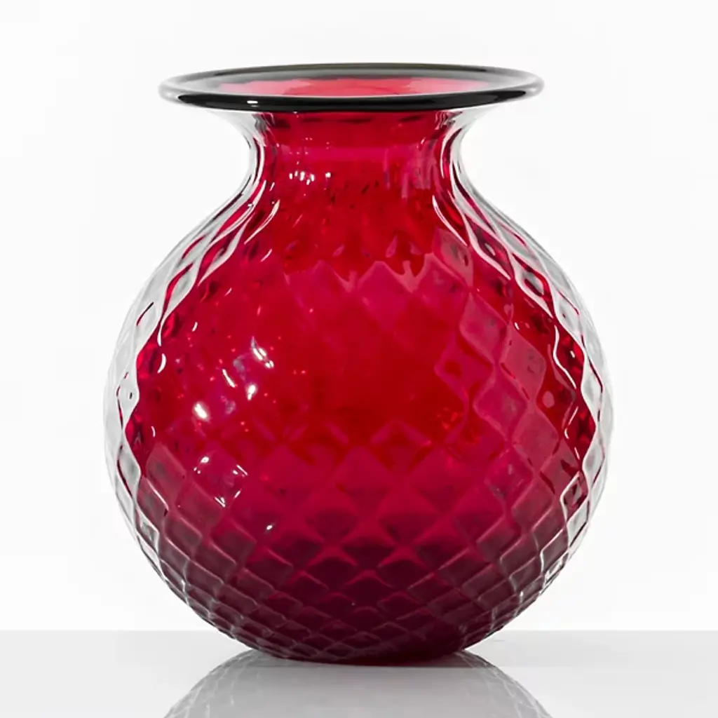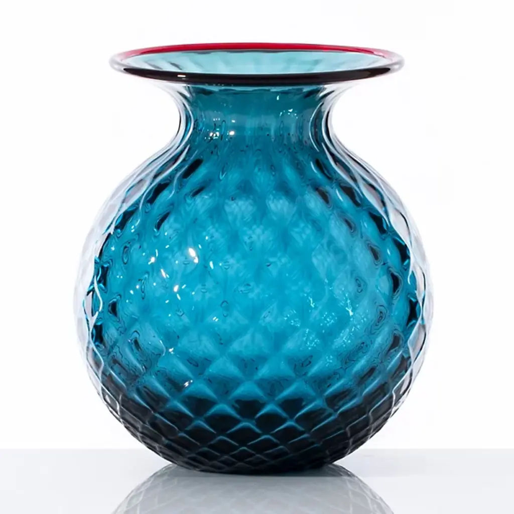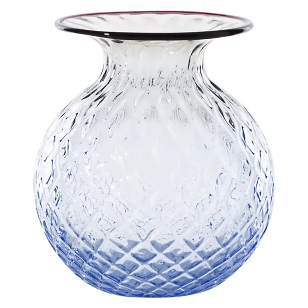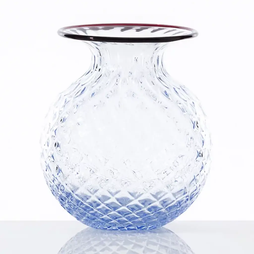 The Balloton Fiori Vase from Venini defies conventional glasswork with its matelassé effect—a technical achievement that mimics the appearance of quilted fabric. This 2024 design, handcrafted in Italy, pushes the boundaries of what's possible with Murano glass, incorporating blown glass ampules that rise like delicate blooms. Italian artisans craft each piece through precise manipulation, allowing the glass to take shape naturally. The result is a functional vessel that doubles as a celebration of time-honored Murano glassmaking techniques.