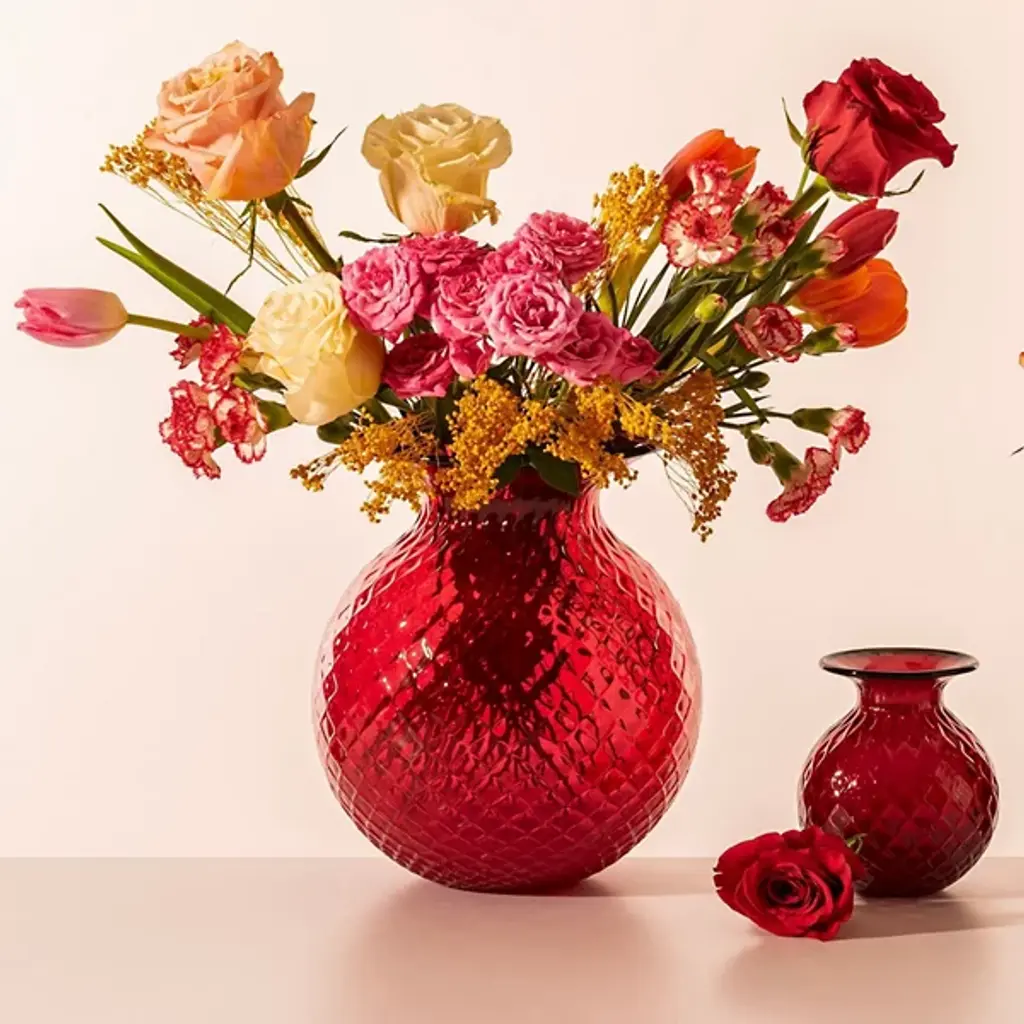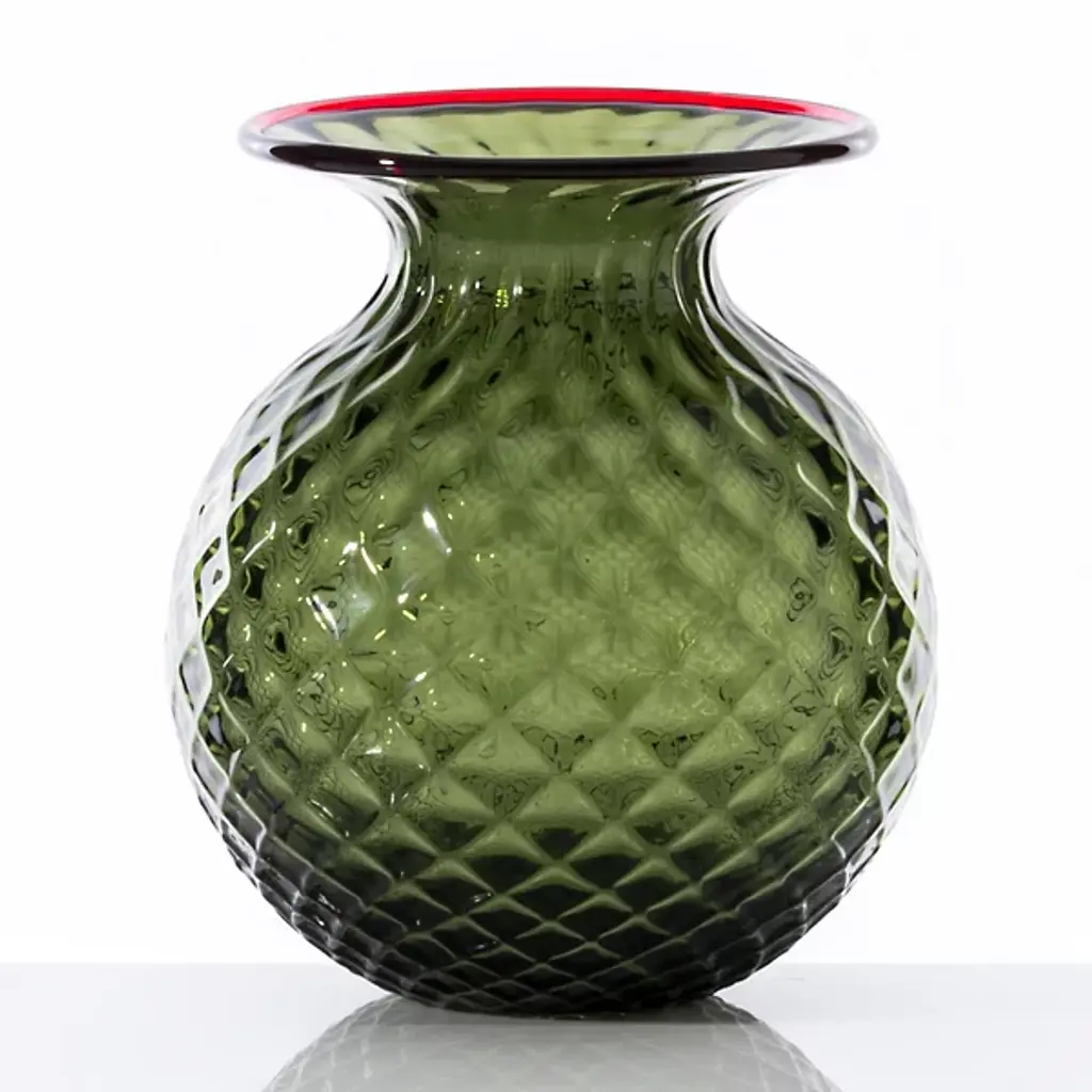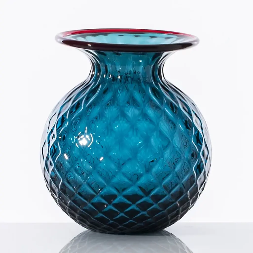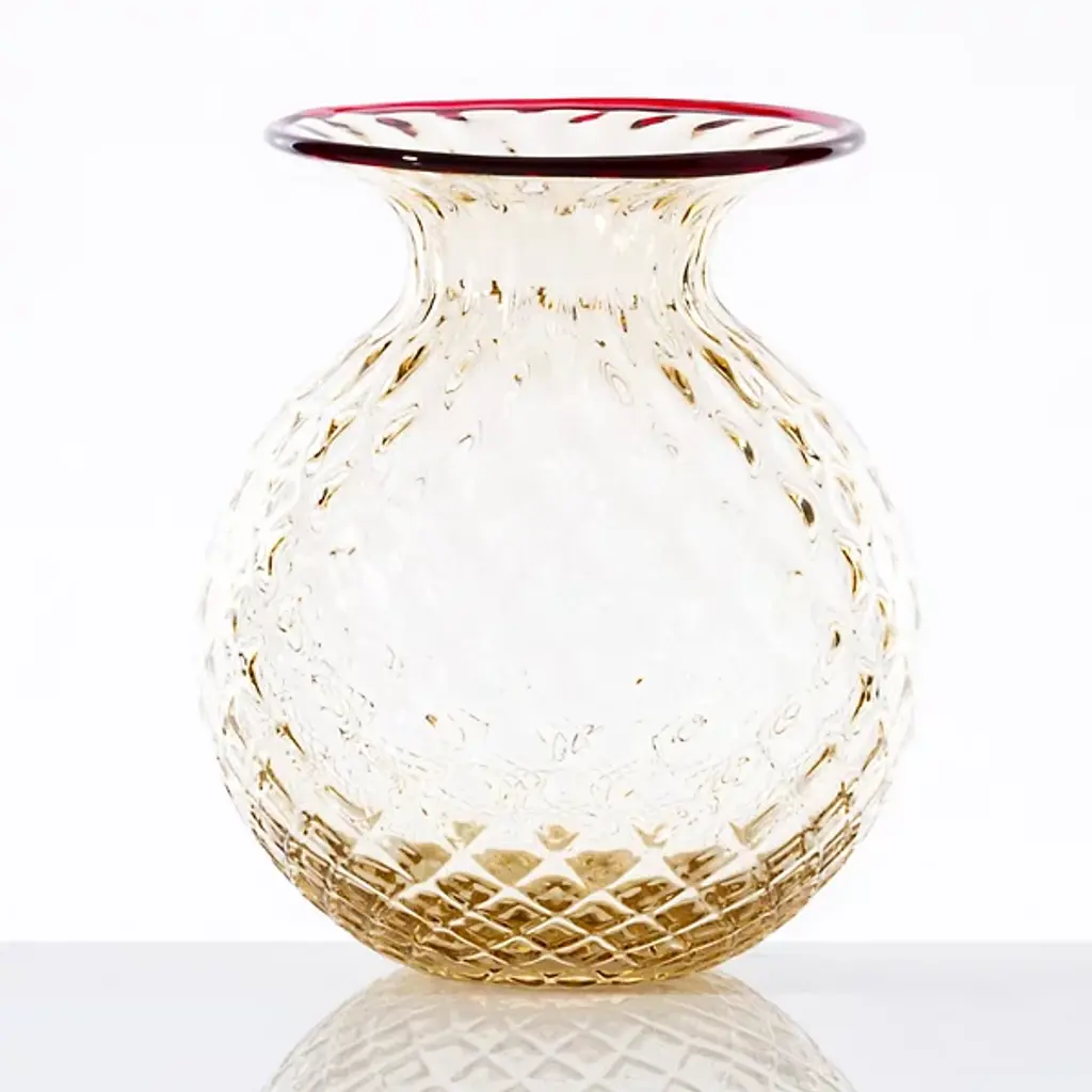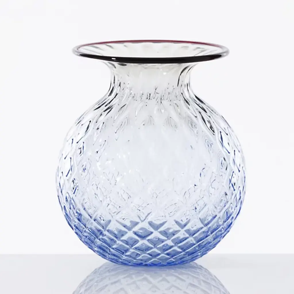The Balloton Fiori Vase from Venini defies conventional glasswork with its matelassé effect—a technical achievement that mimics the appearance of quilted fabric. This 2024 design, handcrafted in Italy, pushes the boundaries of what's possible with Murano glass, incorporating blown glass ampules that rise like delicate blooms. Italian artisans craft each piece through precise manipulation, allowing the glass to take shape naturally. The result is a functional vessel that doubles as a celebration of time-honored Murano glassmaking techniques.