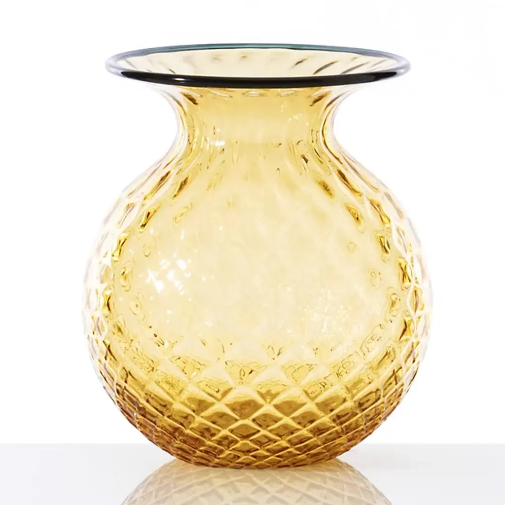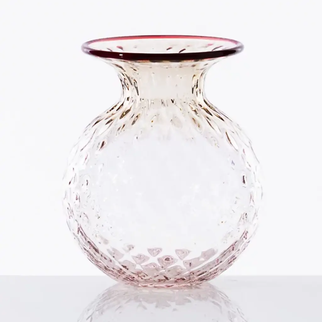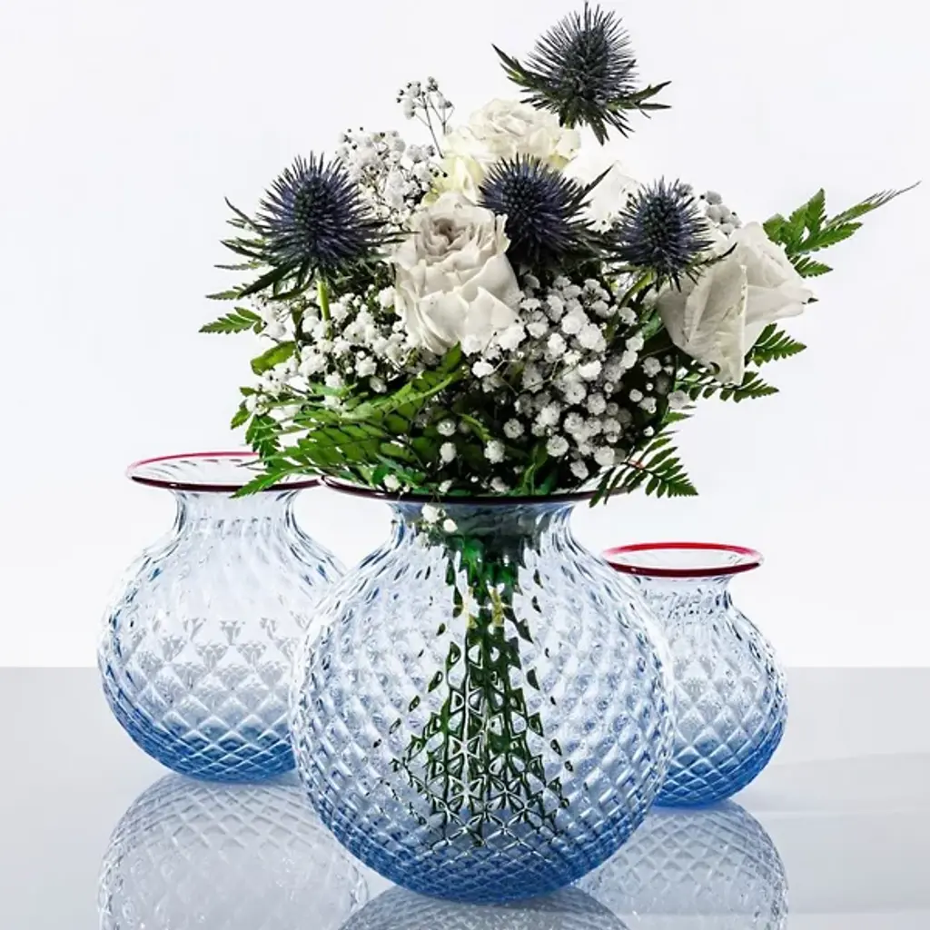 The Balloton Fiori Vase from Venini defies conventional glasswork with its matelassé effect—a technical achievement that mimics the appearance of quilted fabric. This 2024 design, handcrafted in Italy, pushes the boundaries of what's possible with Murano glass, incorporating blown glass ampules that rise like delicate blooms. Italian artisans craft each piece through precise manipulation, allowing the glass to take shape naturally. The result is a functional vessel that doubles as a celebration of time-honored Murano glassmaking techniques.