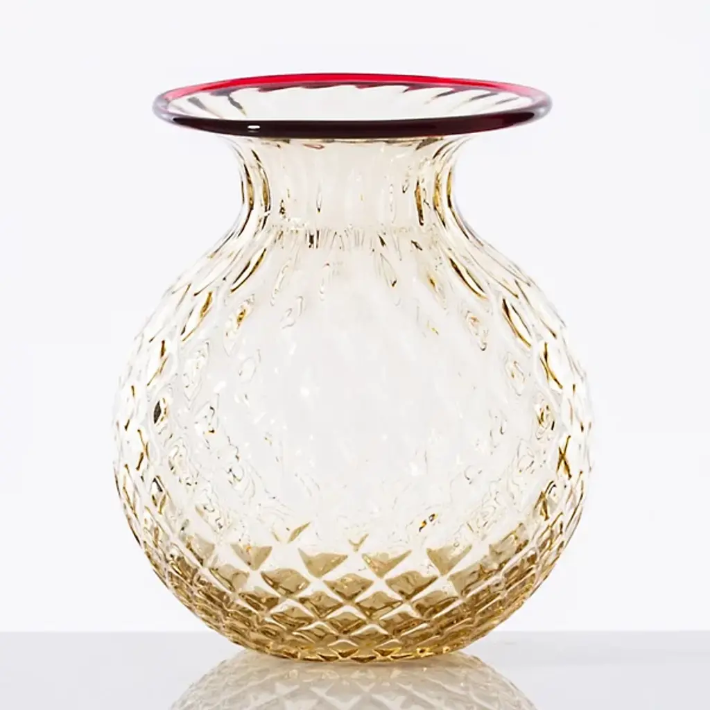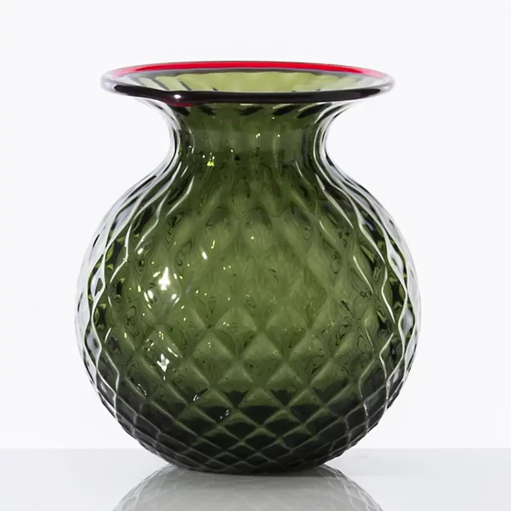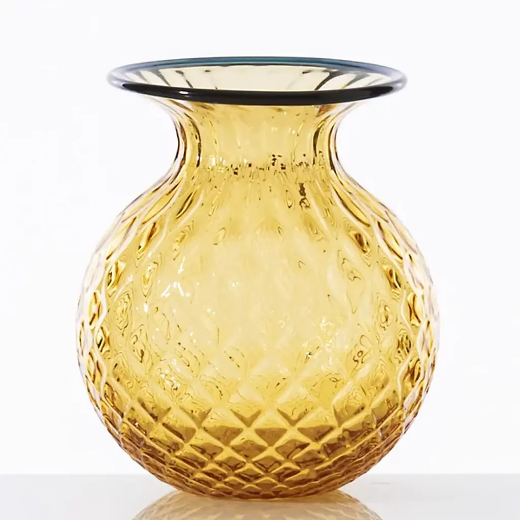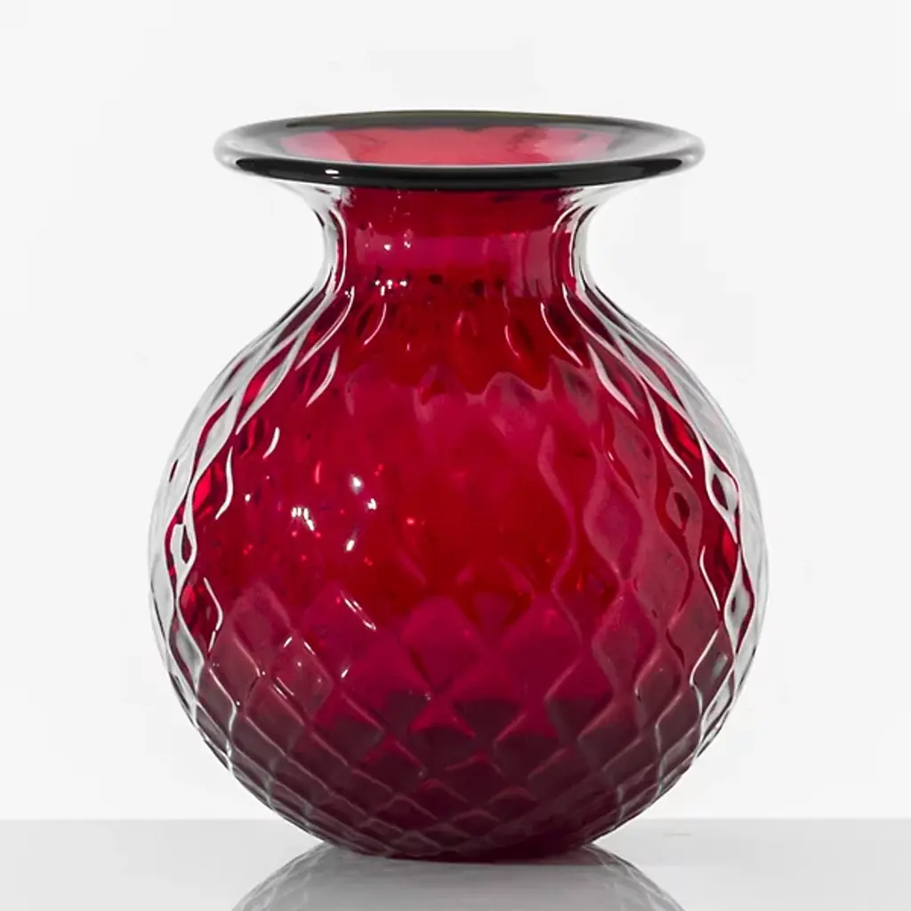 The Balloton Fiori Vase from Venini defies conventional glasswork with its matelassé effect—a technical achievement that mimics the appearance of quilted fabric. This 2024 design, handcrafted in Italy, pushes the boundaries of what's possible with Murano glass, incorporating blown glass ampules that rise like delicate blooms. Italian artisans craft each piece through precise manipulation, allowing the glass to take shape naturally. The result is a functional vessel that doubles as a celebration of time-honored Murano glassmaking techniques.
