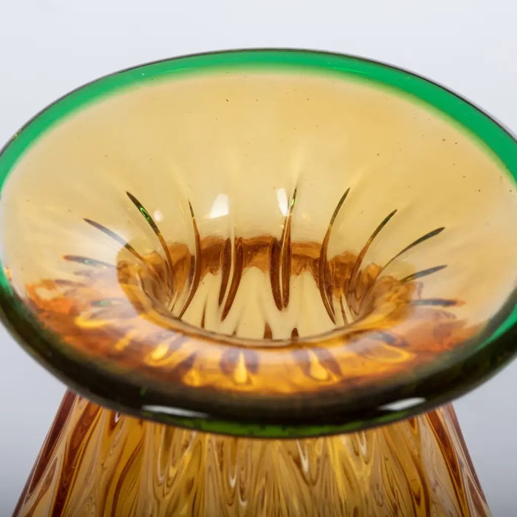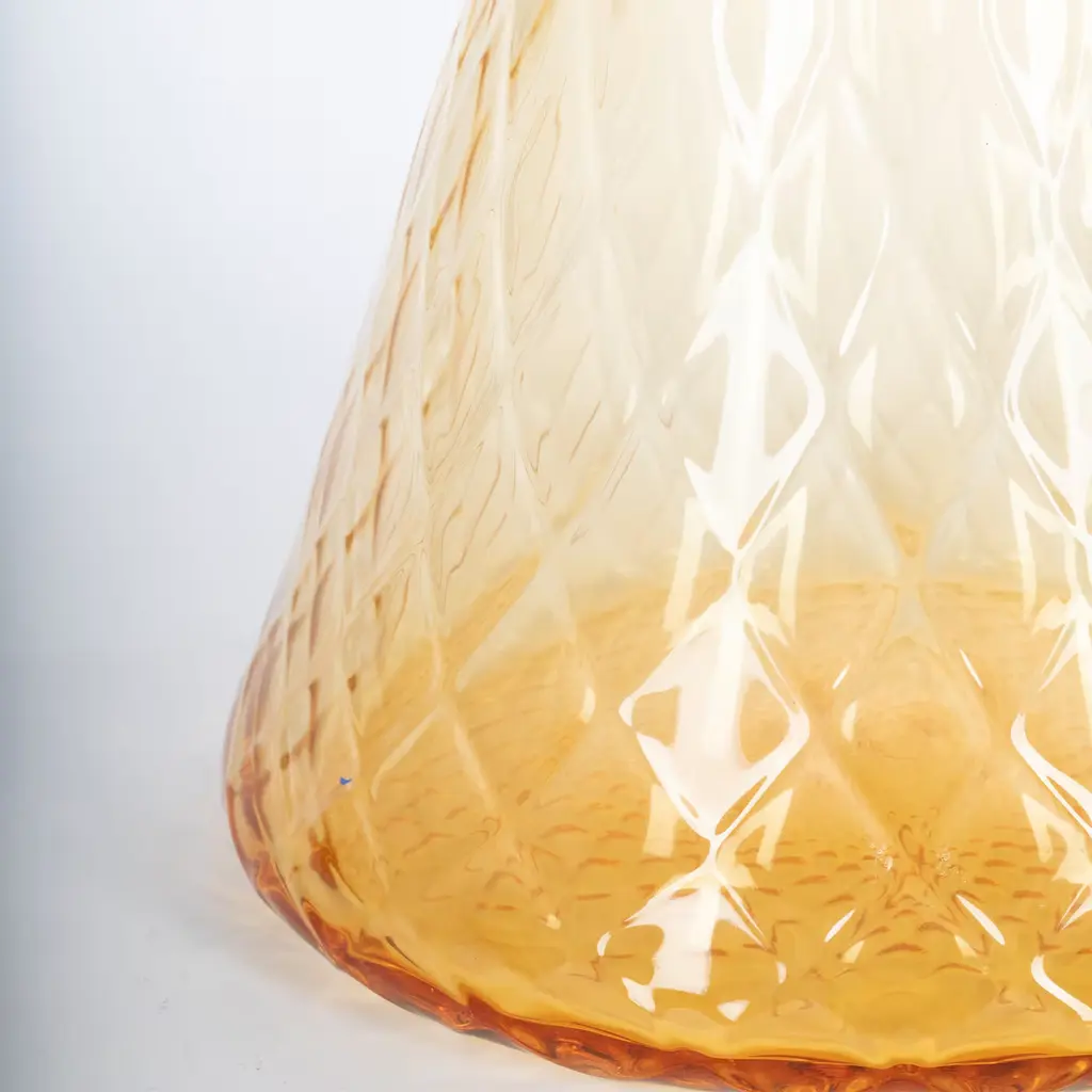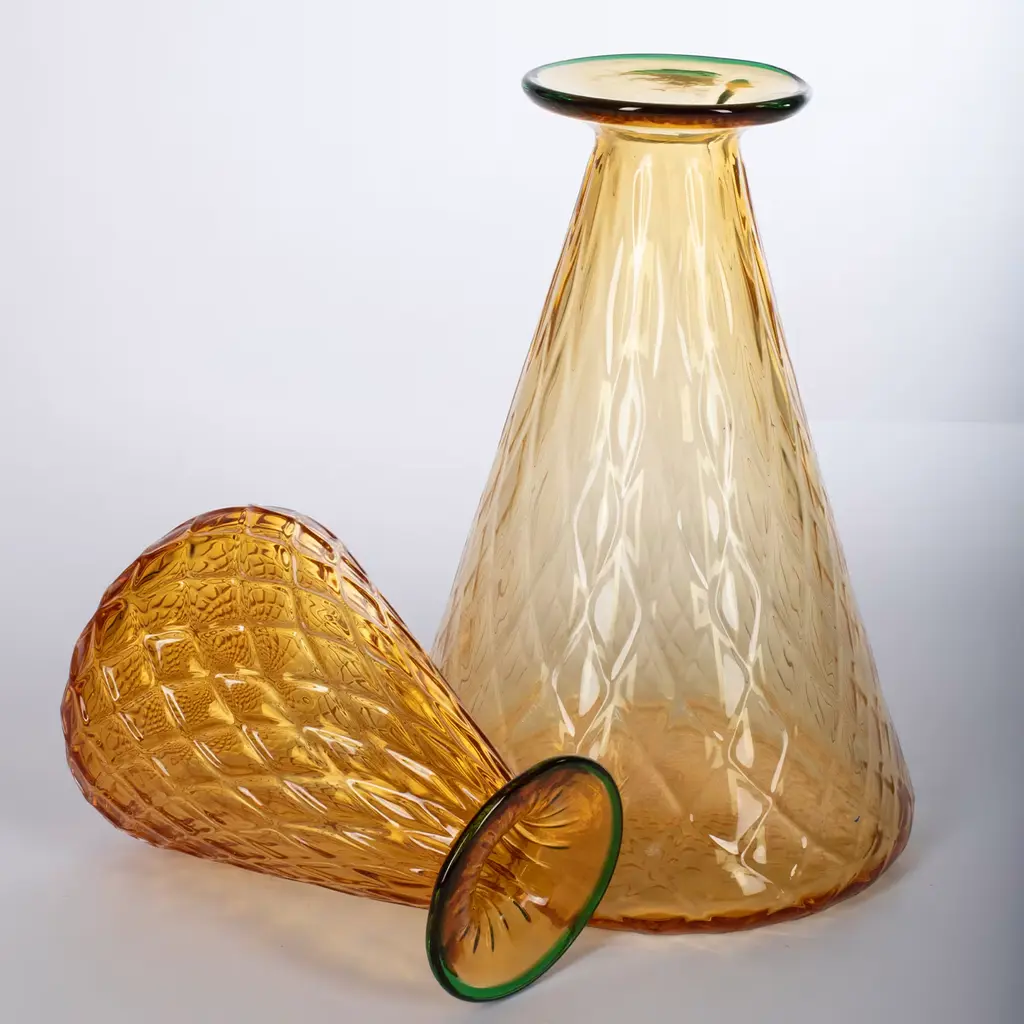 A precious addition to modern homes, this set of two conical vases pairs clean geometry to the preciousness of mouth-blown glass. A diamond texture - resulting from a deft following of the balloton technique - characterizes their bodies, marked by amber hues and sealed by thin rims incorporating green glass. They measure 20cm and 14cm in height and 24cm and 10cm in diameter, respectively.