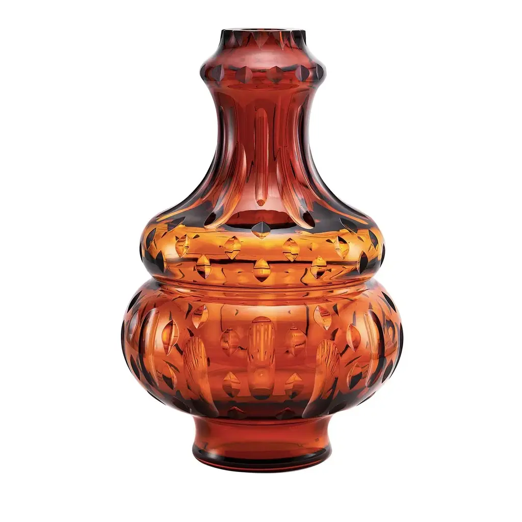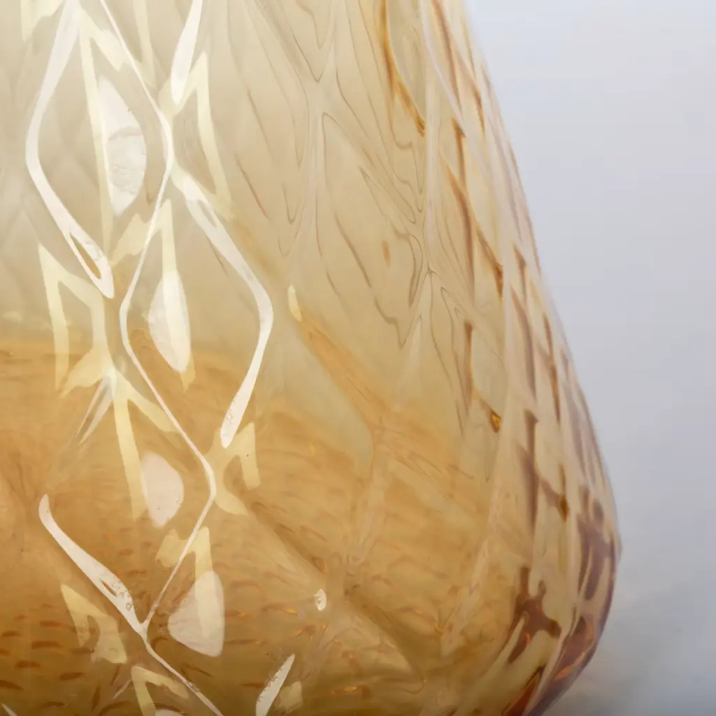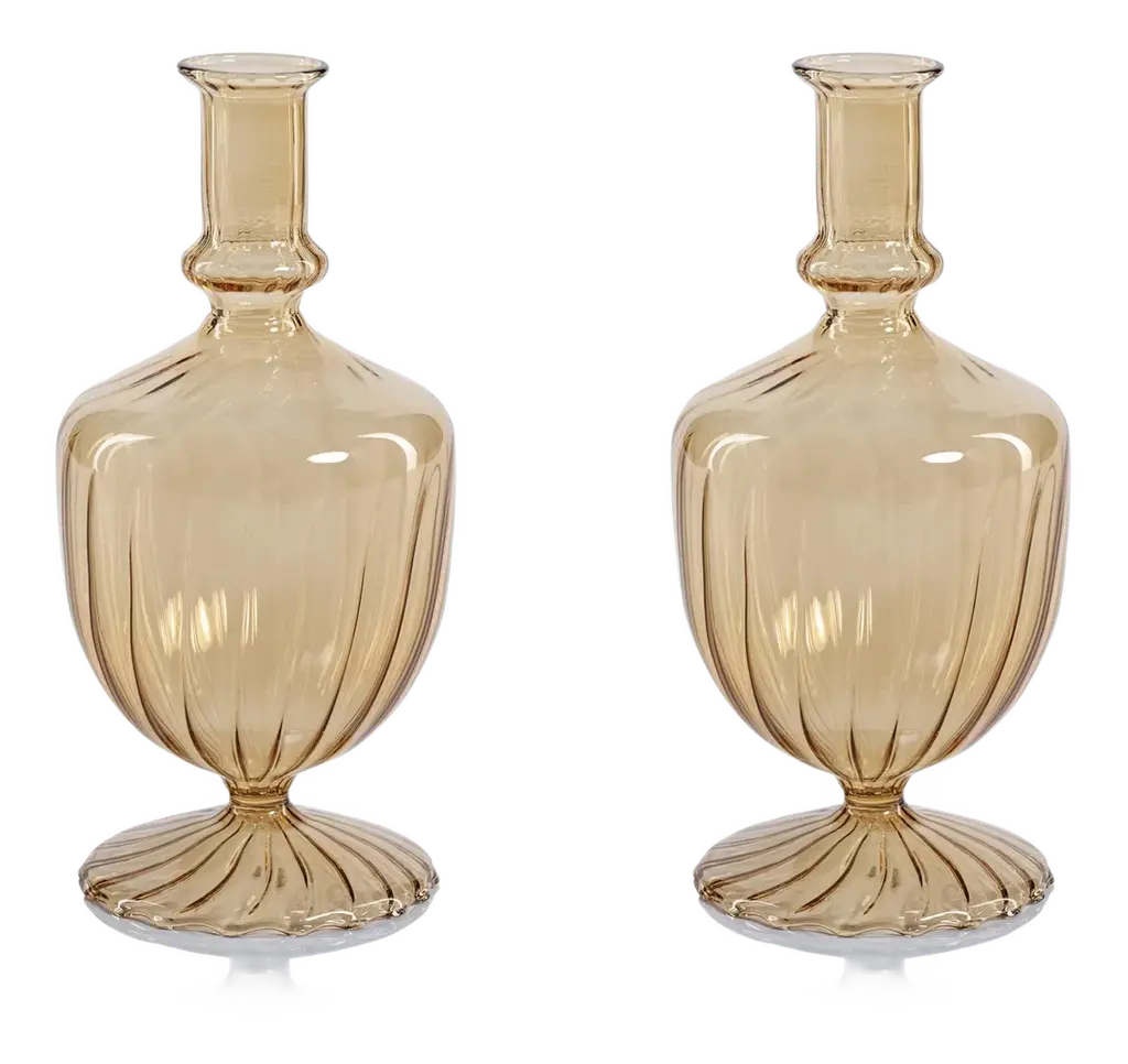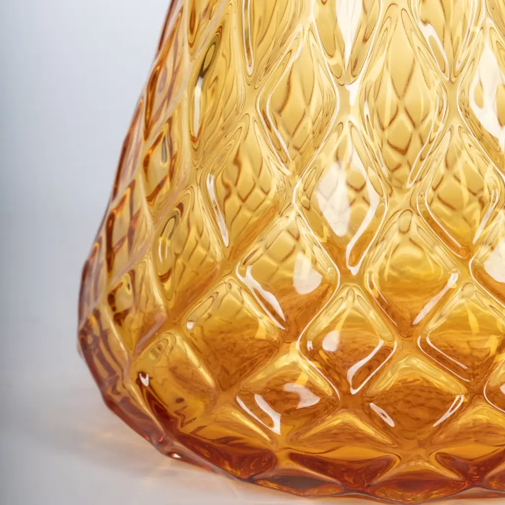 A precious addition to modern homes, this set of two conical vases pairs clean geometry to the preciousness of mouth-blown glass. A diamond texture - resulting from a deft following of the balloton technique - characterizes their bodies, marked by amber hues and sealed by thin rims incorporating green glass. They measure 20cm and 14cm in height and 24cm and 10cm in diameter, respectively.