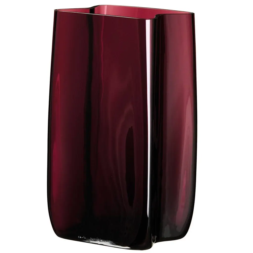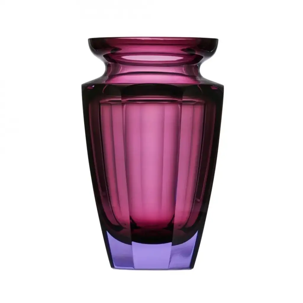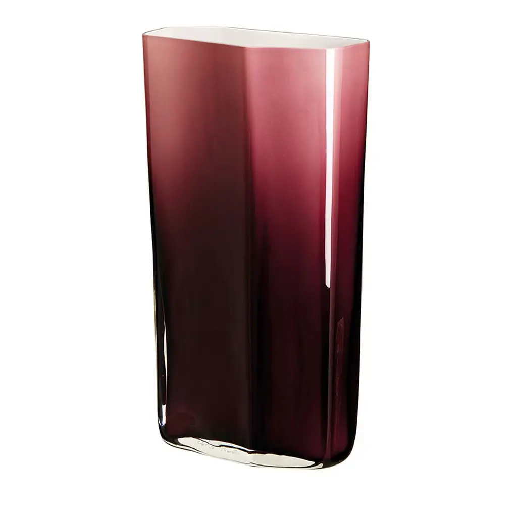 The geometry of a hexagon reinterpreted in a creative and irregular perspective distinguishes the artful personality of this vase, deftly mouth-blown from Murano crystal and minutely finished by hand. The clean whiteness of the inner surface is counterbalanced by the delightful, shaded tone of plum accenting the exterior.