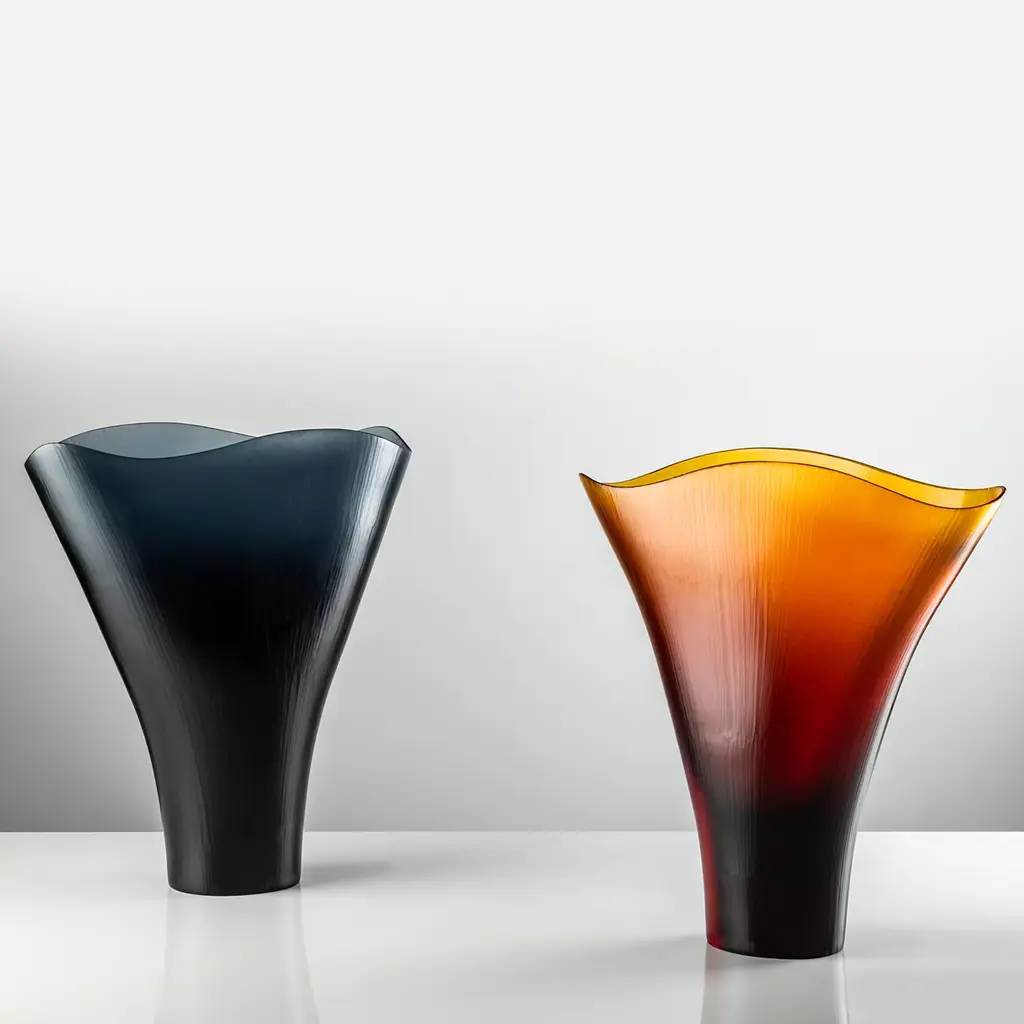 A celebration of the elegance of Murano glass, this splendid vase was designed in 1962 by Tobia Scarpa and Ludovico Diaz de Santillana and is now part of a Limited Edition of 99 artworks. Handcrafted of mouth-blown Murano glass, it boasts a dark tone on the bottom, which slowly lightens into warm shades of amber towards the vase's widening silhouette, to end in a wavy and dynamic rim.