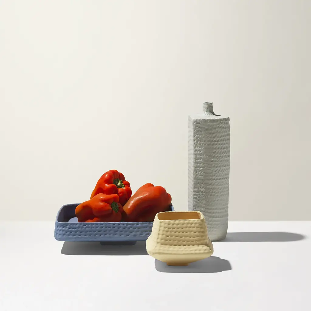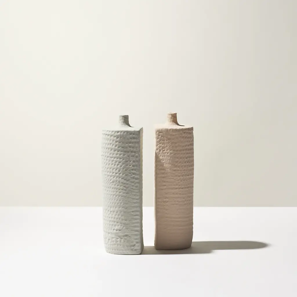 Part of the Battuti Collection by Andrea Anastasio, this contemporary ceramic vase features a tall, bottle-shaped silhouette. The rough hammered textured is obtained with a special technique and is enhanced by the snow-white color with a matte finish. This slender vase will look stunning either by itself or when paired with a colorful flower bouquet.