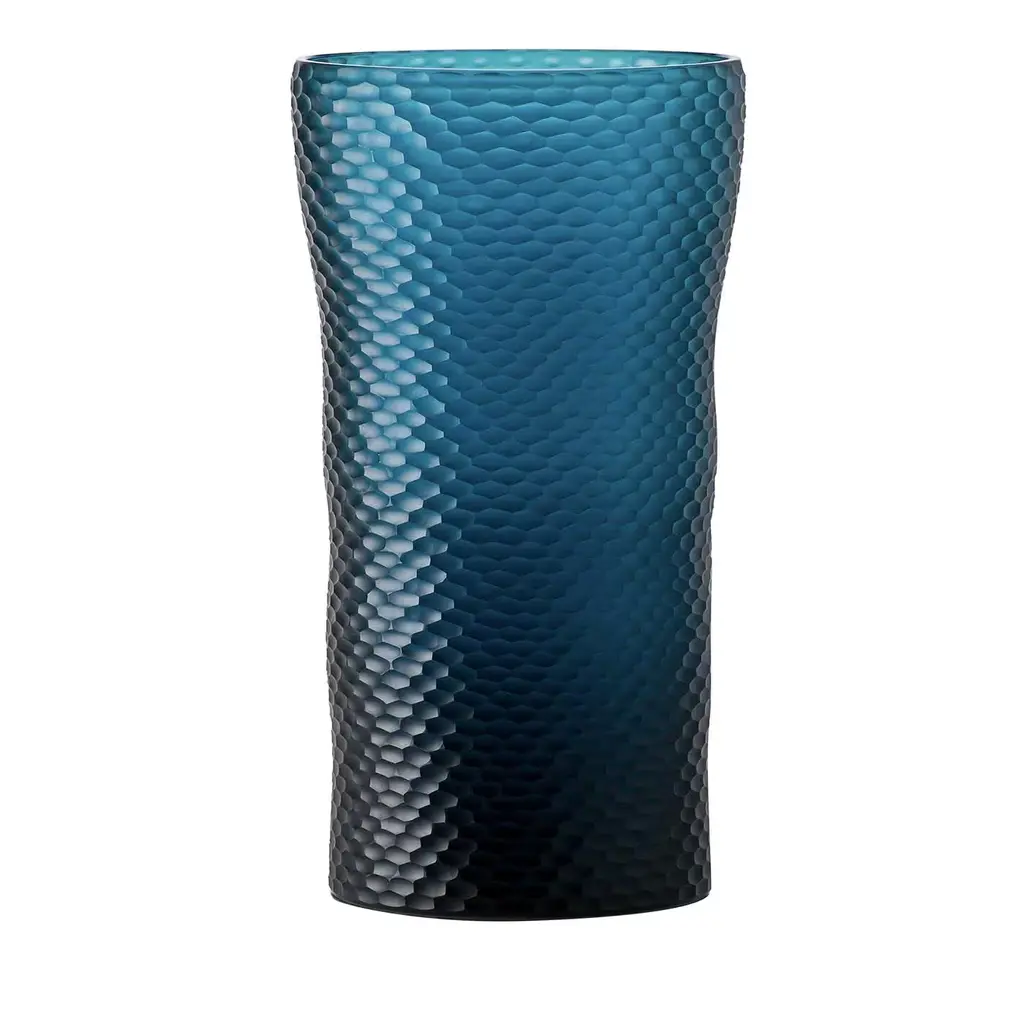 That delicate yet suprising shapes drawn by nature inspired the enthralling aesthetic of this singular glass vase by Carlo Scarpa. Gently flaring to a broader mouth, the body stands out for its extensive matte-finished beehive texture obtained from a minute cold-etching carried out by master glassmiths. Harmonious profiles and evocative flair define this elegant design.