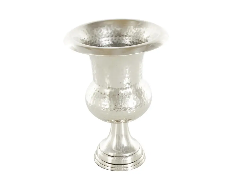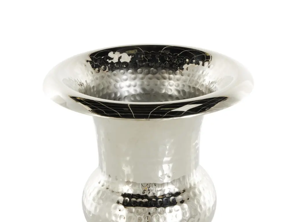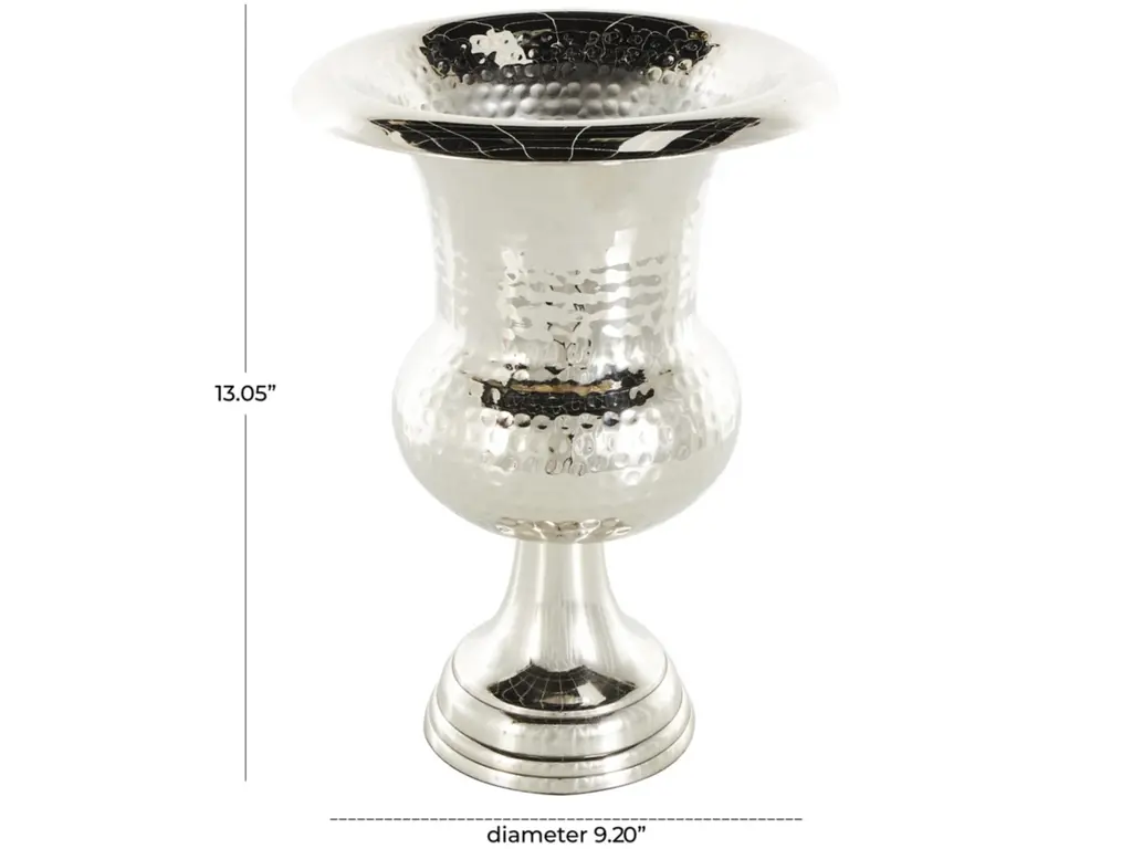 This silver centerpiece vase can be displayed in your living room as a standalone decor item or filled with dried flowers for an elegant look. Designed with felt or rubber stoppers at the base that prevent scratching furniture and table tops, as well as sliding around. This item ships in 1 carton. Aluminum vase makes a great gift for any occasion. Suitable for indoor use only. This item ships fully assembled in one piece. Made in India. This is a single silver colored vase. Glam style. Vase has a 5 in mouth opening.