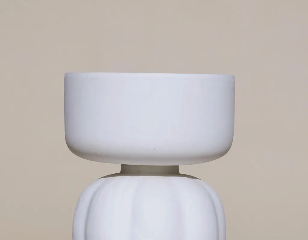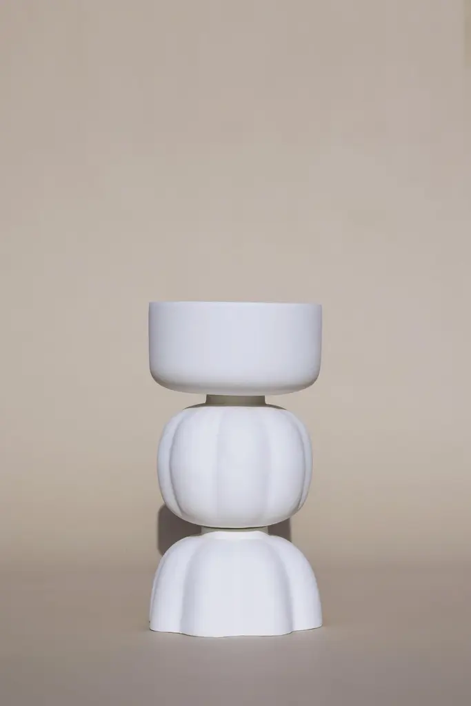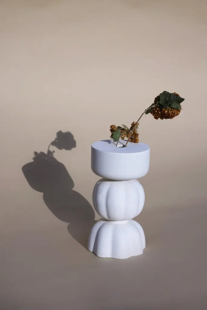 Bead And A Skirt Vase Side Table by NewblueUnique PieceDimensions: D 30 x W 30 x H 53 cm.Materials: Patent-pending Newblue recycled ceramic material, recycled sanitary ware, recycled glass, quartz, and plant-based binders.All ceramic furniture and lighting are handmade, making each piece unique. Inconsistency in texture, shape, and color may occur due to its natural material and firing procedures. Available in satin glaze and glazed finishes. Please contact us.A table, that is also a vase decoration and utility, co-exists in this piece, like materials - old and new. The form draws from the oldest 'lotus' geometry used in the Jaipur Blue Pottery craft. This table is made of 3 stackable pieces, designed to hold dry flowers. For fresh flowers, please specify and opt for the glazed finish. New∙blue is a design and craft innovation company reinventing traditional Indian craft practices by recycling industrial waste to co-create contemporary collectibles.New∙blue is the second technological intervention in Jaipur Blue Pottery since the 1860s. Rooted in Indian craft’s legacy of making with local material abundance, we are connecting the largest craft concentration in the world to some of the largest landfill sites, creating value for ecology and economy alike.Based and born in Jaipur (India), we’re a team of material scientists, artisans, and designers reimagining the future of Indian craft by collaborating with industrial waste streams from sanitary ware and the steel industries. We aim to combine our expertise in craft research, product design, and material science to refocus climate action through traditional technologies.Newblue was founded by designer Disharee Mathur, a Jaipur-native, during her masters in Innovation Design Engineering (IDE) at the Royal College of Art and Imperial College, London. It is a result of conversations between 4 institutions across two countries- the Material Research Center at the Malviya National Institute of Technology (MNIT) and Neerja Blue Pottery in Jaipur, brought together with IDE at the Royal College of Art and Imperial College, London. It takes a participatory approach to rethinking craft from the particle level of the material to the mass of form and function; that is relevant, receptive, and innovates as an act of preservation.