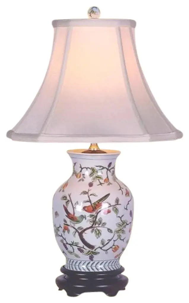 Please note : As most of our porcelain pieces are hand made and hand painted they may be slightly different from the photo in both shape and the way it is even colored! We do our best to find the one that is most common but sometimes they will be slightly different. Beautiful Chinese Vase Floral Peacock Bird Motif Porcelain Table Lamp 31" Country of Origin: China Dimensions (in inches): Height: 31" Length: 16" With shade (Max Watt 150) Number of Bulbs: 1 UL LISTED: YES Bulbs Not Included Comes with Shade and Finial