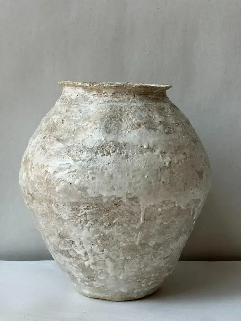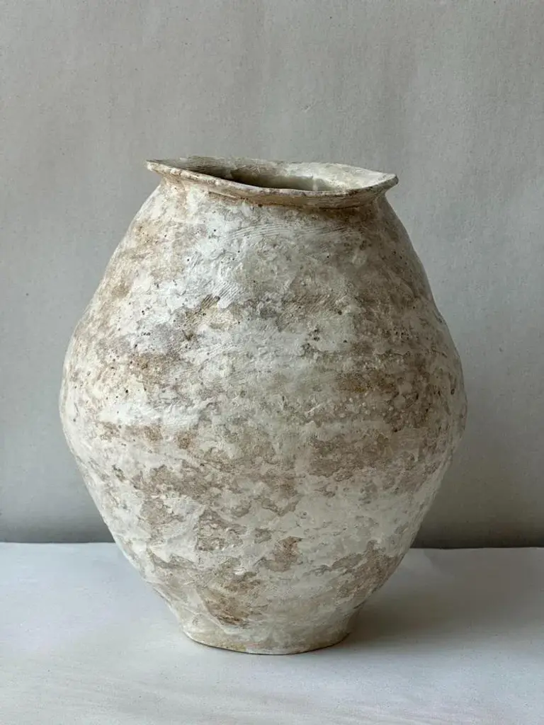 Beige Stoneware Sfondyli I Vase by Elena Vasilantonaki Unique Dimensions: ⌀ 30 x H 25 cm (Dimensions may vary) Materials: Stoneware Available finishes: Black, Beige, Brown, Red, White Patina