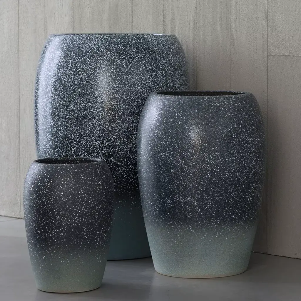 A bulging body vaguely reminiscent of a cocoon defines this precious ceramic vase, a singular handmade piece whose crafting process is under the supervision of master craftsmen. Naturally dried and fired at over 1000°, it sports a shaded dark coloring only interrupted by a motif of white speckles. Synthesizing traditional craftsmanship and contemporary style, each piece is unique.