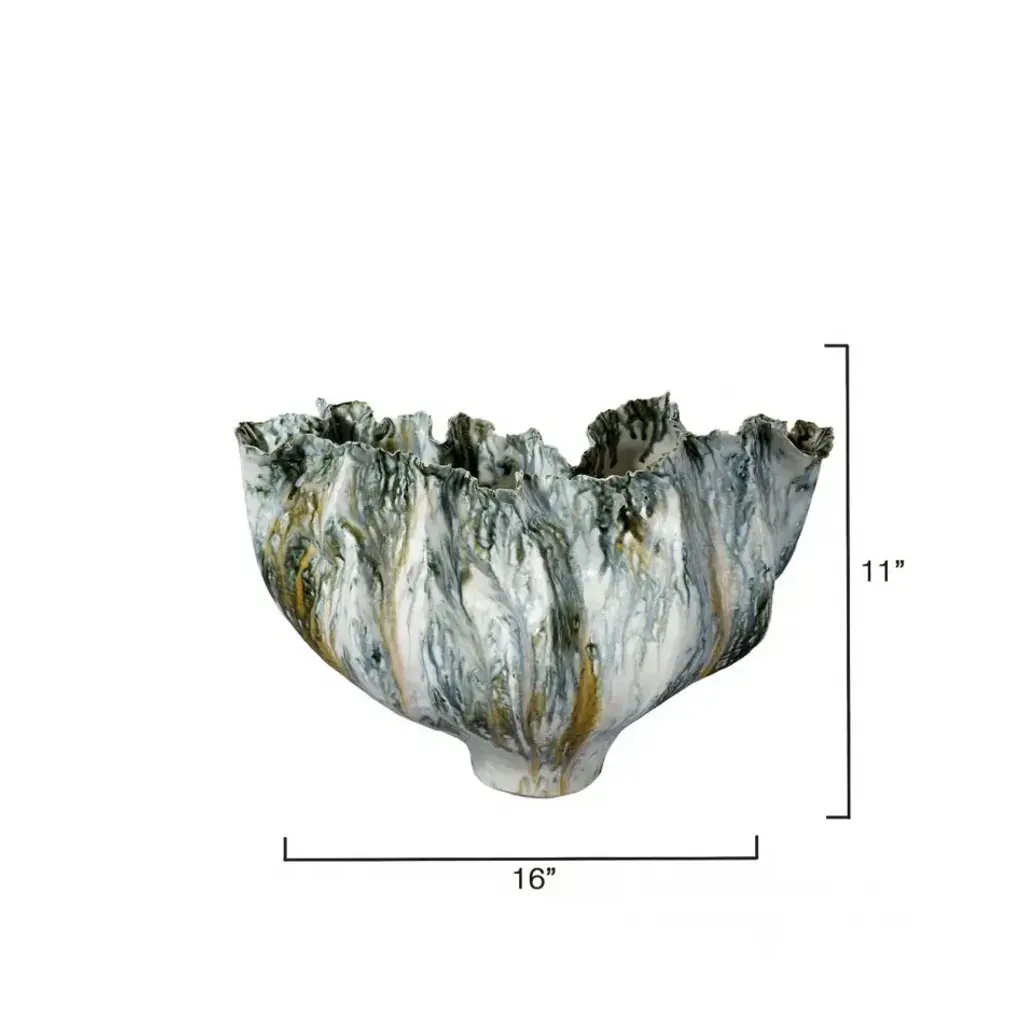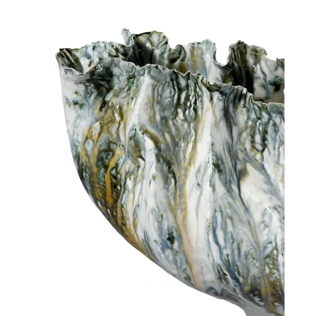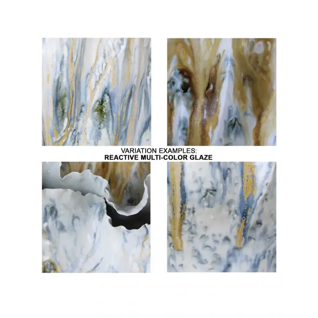 Inspired by the ocean spray created by a breaching whale, these vases capture, in ceramic, the exuberance of that moment. From the crimping in their openings to their expertly applied blue reactive glazes, each of these vessels is created and finished by hand. No two are identical.