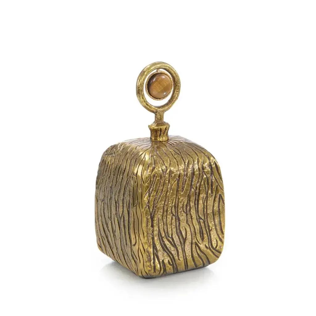The Bengali Vase is a chic, stylish accent piece that showcases a stunning variety of textures. Crafted from metal and finished in antique brass, the piece features wavy striations across the body. A gorgeous tiger’s eye stone is affixed to a rounded metal ornament at the top of the piece, completing the look.
