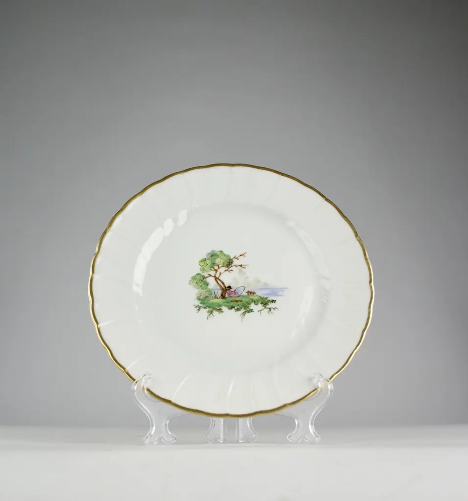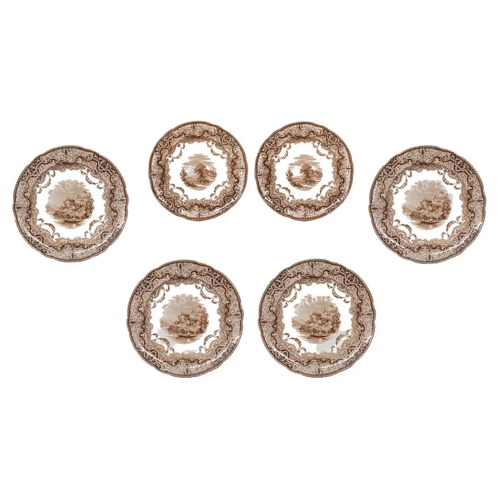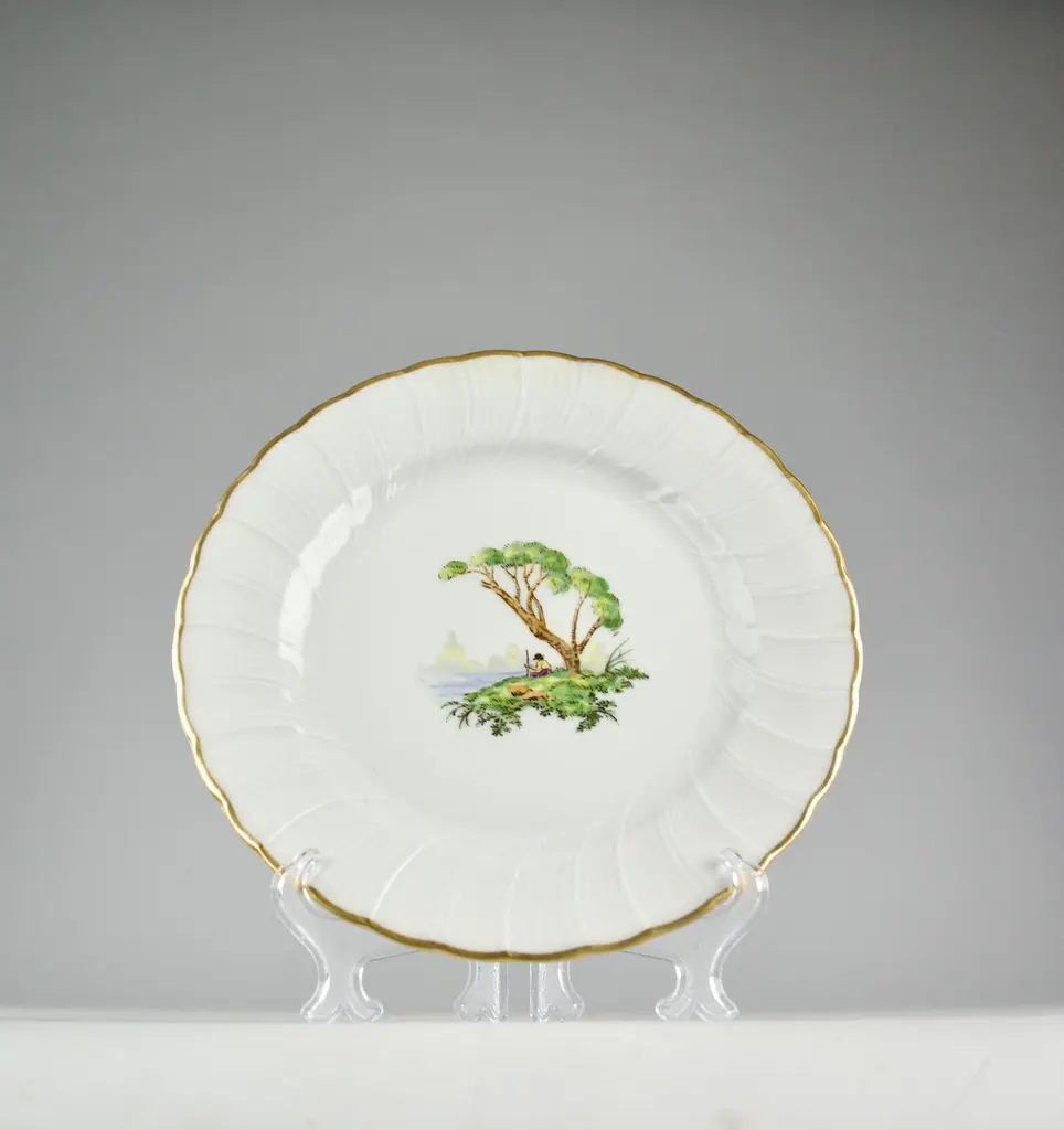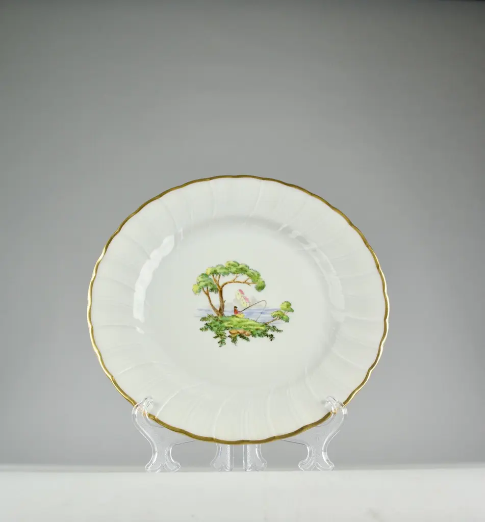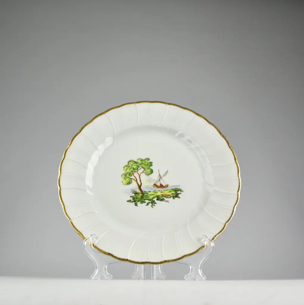Beautiful Bernardaud manufacture "Verlaine" dessert plates with a special collaboration with the Au Vase Étrusque workshop, France early 1900s. Different decorations of fishermen and boats peacefully fishing along the coast. Two sets of 6 plates available.Dimensions in cm ( H x D ) : 2 x 21.7In very good condition.Louis Damon (1860-1947) became the owner of the store "Au Vase Etrusque" at 20 rue Malesherbes in Paris in 1887, at the age of 27. A highly creative individual, he had a decoration workshop and personally designed his models to sell them.In 1889, the Daum Brothers entrusted him with the finishing of Berluz vases with long handles. These were crafted in his workshop, where they were finely engraved with cameo or intaglio techniques featuring vegetal ornaments, which Damon himself drew in the Art Nouveau style.He also distributed a range of glassware from Vallerysthal, Portieux, and Baccarat. Awarded a silver medal at the 1900 Universal Exhibition, he partnered with his brother-in-law Delente. From then on, his work was signed Damon and Delente/Au Vase Etrusque. In the 1920s, the store moved to 4 Avenue Pierre 1er de Serbie in Paris and became Etablissements Damon, with workshops at 13 Rue Verniquet in Paris, producing electrical devices and art glass.Louis Damon's creations from 1889 to 1905 were signed LDamon, LDamon/Paris, or DAMON/PARIS, sometimes followed by the address 20, bd Malesherbes.
