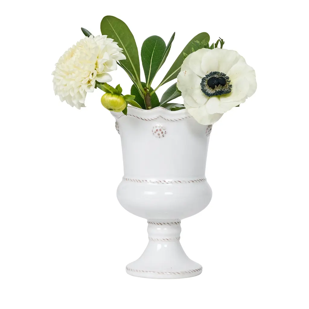 Put those gorgeous blooms on a pedestal, where they belong. Trimmed with Juliska's iconic Berry & Thread motif and gleaming with a signature whitewash glaze, this classic vase is your go-to, versatile vessel for everything—from wildflowers on your desk to garden roses for brunch. Use alone or in combination with other parterre sculptural pieces to create your own fantasy tabletop garden. Lovely for fresh arrangements or small potted plants.
