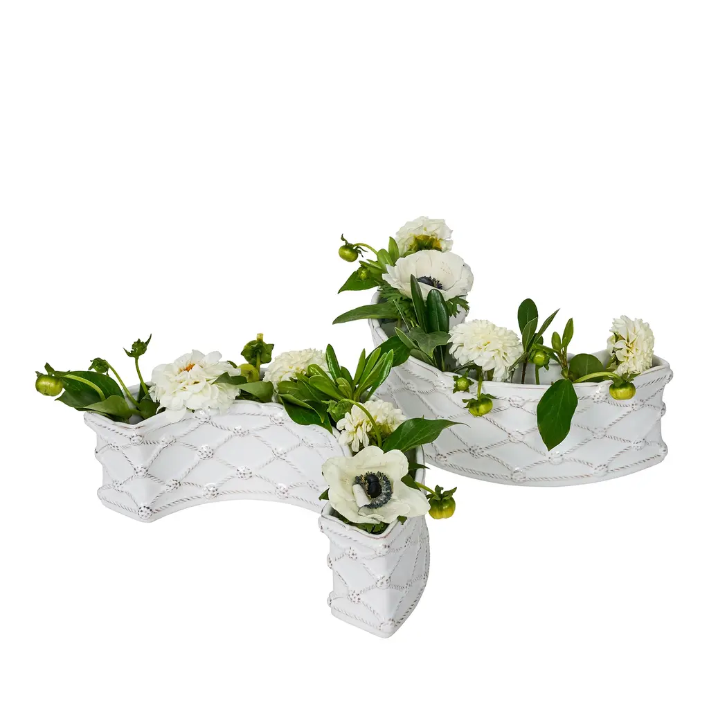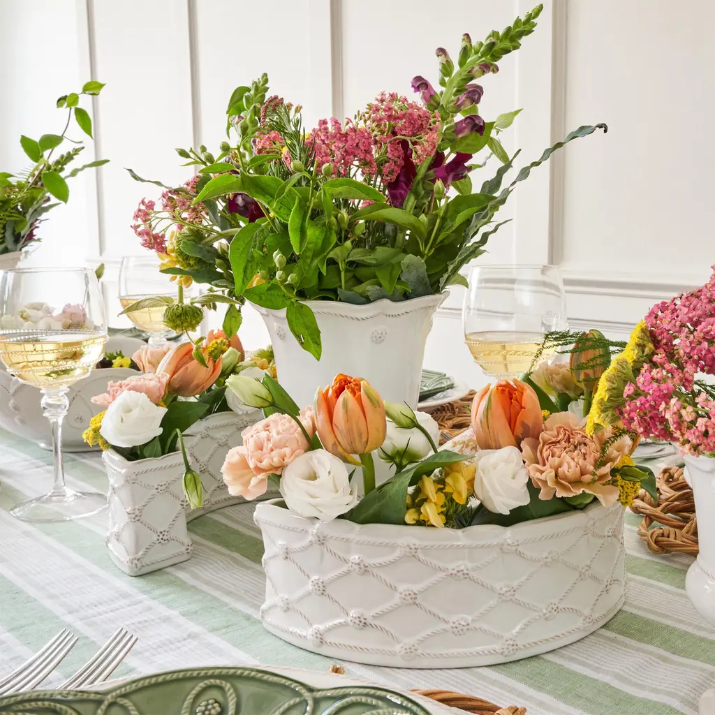 Create your own fantasy tabletop garden inspired by the formal parterre gardens of Château du Villandry in France. Juliska's fabulously unique set of two ceramic vases in a signature Whitewash glaze and Berry & Thread lattice work motif can be endlessly configured to display your beautiful blooms, whether they're forever florals or picked freshly from your garden. Use them to encircle the base of a vase, or in combination with other parterre sculptural pieces.