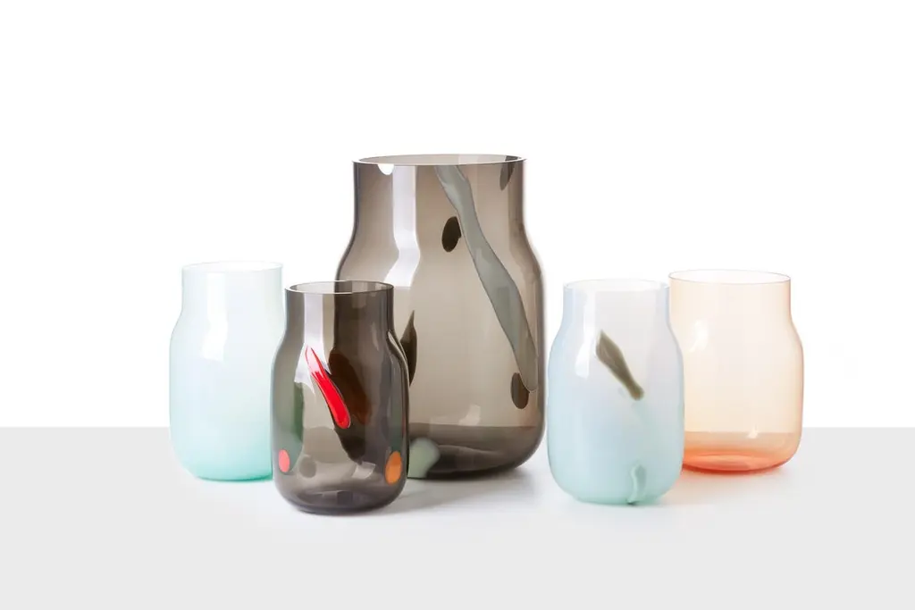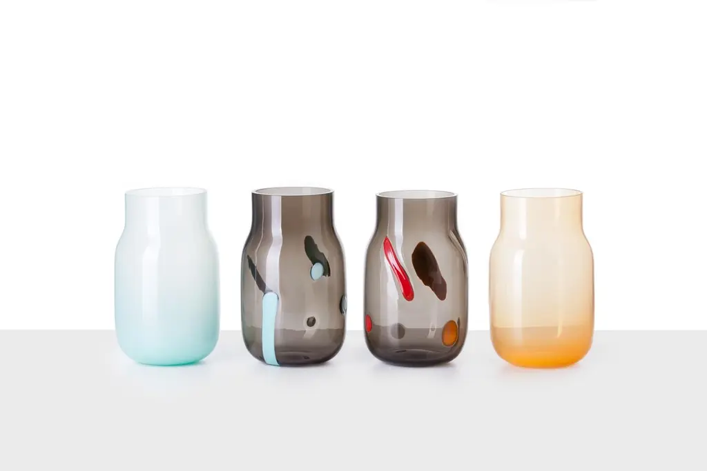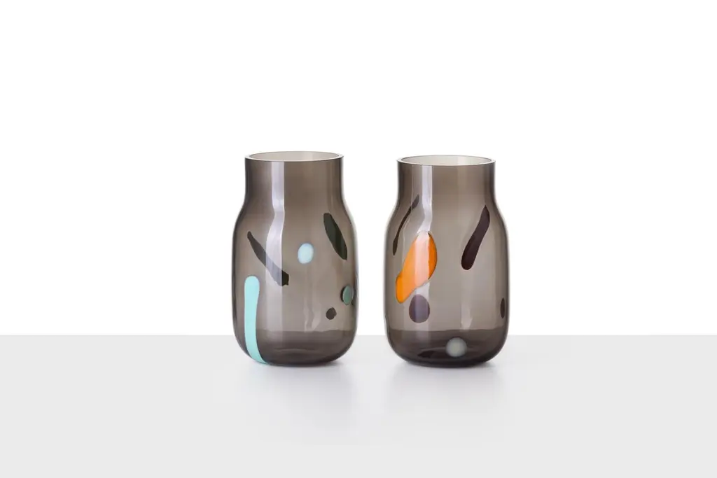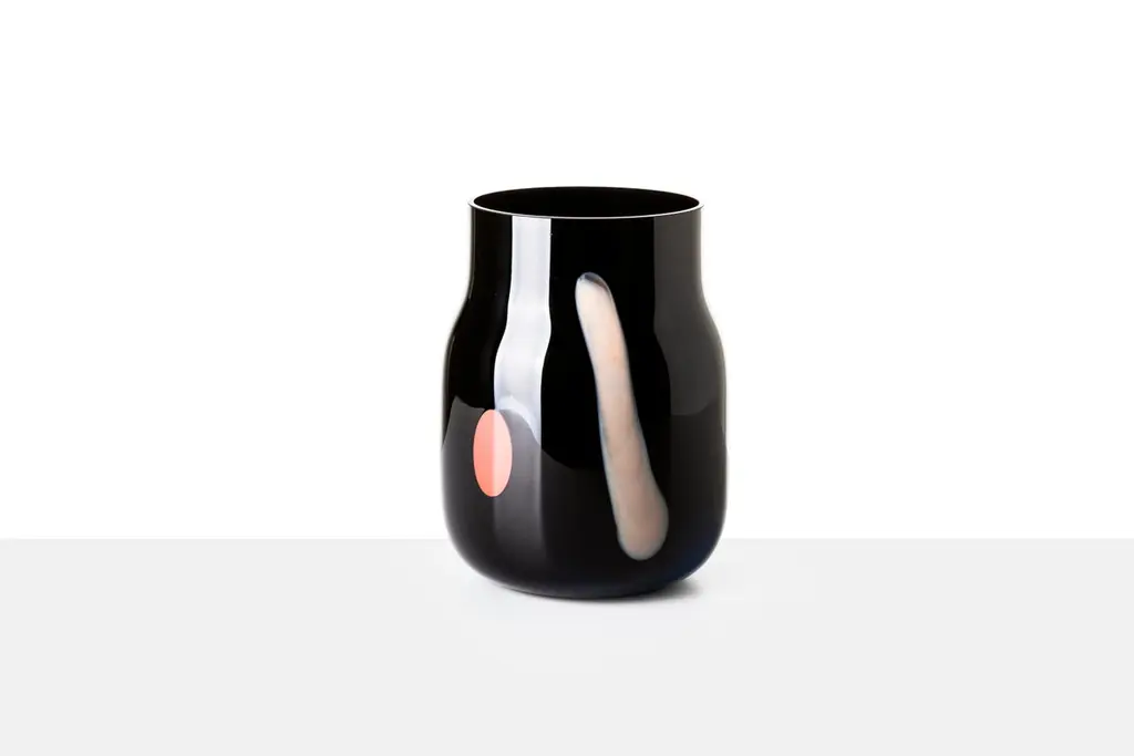 Big Bandaska Postmodern vase by Dechem Studio.Dimensions: D 15 x H 25 cm.Materials: glass.Available in 2 sizes: D15 x H25, D22 x H33 cm.Another version of the highly successful Bandaska vase pays tribute to the Italian Postmodern movement of the 1980s. Each of the unique pieces is decorated with coloured inlays on the dark black surface, reminiscent of the iconic playful work of Alessandro Mendini and Ettore Sottsass, among others.We are DECHEM.We are Michaela and Jakub, designers and storytellers in Bohemian glass. Our work is based on contemporary design combined with a mastery of production and a healthy respect for old Central European craft and traditions.We design, produce and sell our collections of lights and decorative glass products. We produce unique light fixtures made from a combination of mouth-blown glass and handcrafted brass. Our glamorous chandeliers light up any space with a playful yet elegant appearance.A significant component of our work is blowing glass into a colour gradient. The wide range of fresh gradient colours is a distinctive feature of the Bandaska vase from our collection. It draws inspiration from traditional milk containers, well-known in Czech village households, and their elegant lines are now coming into modern homes in the form of our glass vases and lights.In addition to our normal production, we love to devise bespoke luminous objects for interiors. They arise from experimenting with unconventional materials and unusual combinations.Along with our own work, we like to be part of special collaborations and exhibitions. We have collaborated with renowned galleries and institutions, and curated and exhibited projects in Milano, London, Frankfurt, Istanbul and several other cities around the world.All of our creations are manufactured with care in Czech workshops using unique methods, including hand-blowing, snapping, cutting, grinding, firing, engraving and glass painting.We founded DECHEM studio in Prague in 2012 as partners in both work and life after years of studying glass craft and design, and we have grown it into a renowned and award-winning design studio.