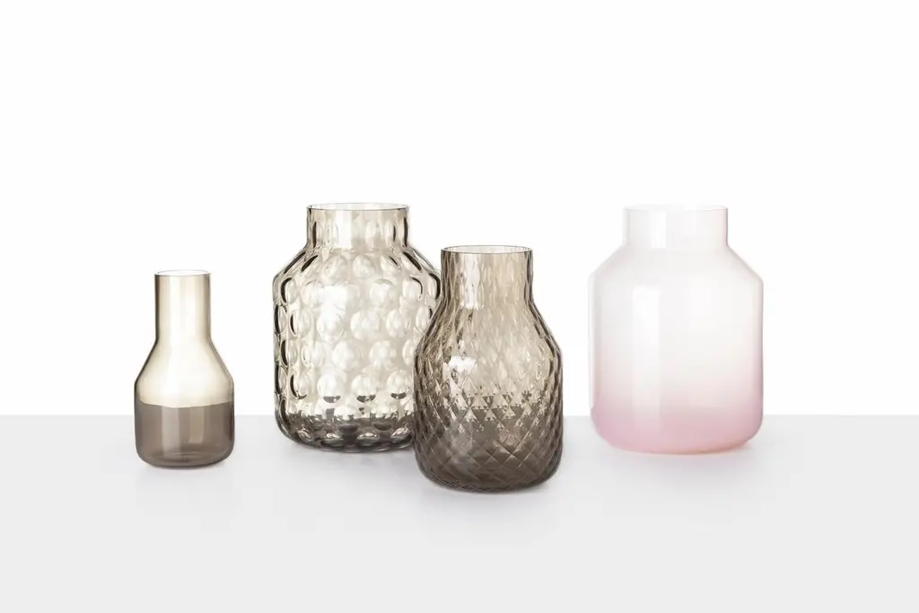 Big Glass Container vase by Dechem Studio.Dimensions: D 17.5 x H 25 cm.Materials: glass.Available in 4 sizes: D9.5 x H19/ D13.5 x W21.5/ D17.5 x H25 cm.Available in smoke, black, gradient pink, red, pine green.The archetypal shape of this hollow object serves as a storage for various liquids and substances in three different sizes. The austere functionality contrasts with the diamond and olive optical decorations on the surface.We are DECHEM.We are Michaela and Jakub, designers and storytellers in Bohemian glass. Our work is based on contemporary design combined with a mastery of production and a healthy respect for old Central European craft and traditions.We design, produce and sell our collections of lights and decorative glass products. We produce unique light fixtures made from a combination of mouth-blown glass and handcrafted brass. Our glamorous chandeliers light up any space with a playful yet elegant appearance.A significant component of our work is blowing glass into a colour gradient. The wide range of fresh gradient colours is a distinctive feature of the Bandaska vase from our collection. It draws inspiration from traditional milk containers, well-known in Czech village households, and their elegant lines are now coming into modern homes in the form of our glass vases and lights.In addition to our normal production, we love to devise bespoke luminous objects for interiors. They arise from experimenting with unconventional materials and unusual combinations.Along with our own work, we like to be part of special collaborations and exhibitions. We have collaborated with renowned galleries and institutions, and curated and exhibited projects in Milano, London, Frankfurt, Istanbul and several other cities around the world.All of our creations are manufactured with care in Czech workshops using unique methods, including hand-blowing, snapping, cutting, grinding, firing, engraving and glass painting.We founded DECHEM studio in Prague in 2012 as partners in both work and life after years of studying glass craft and design, and we have grown it into a renowned and award-winning design studio.