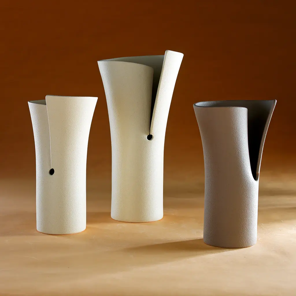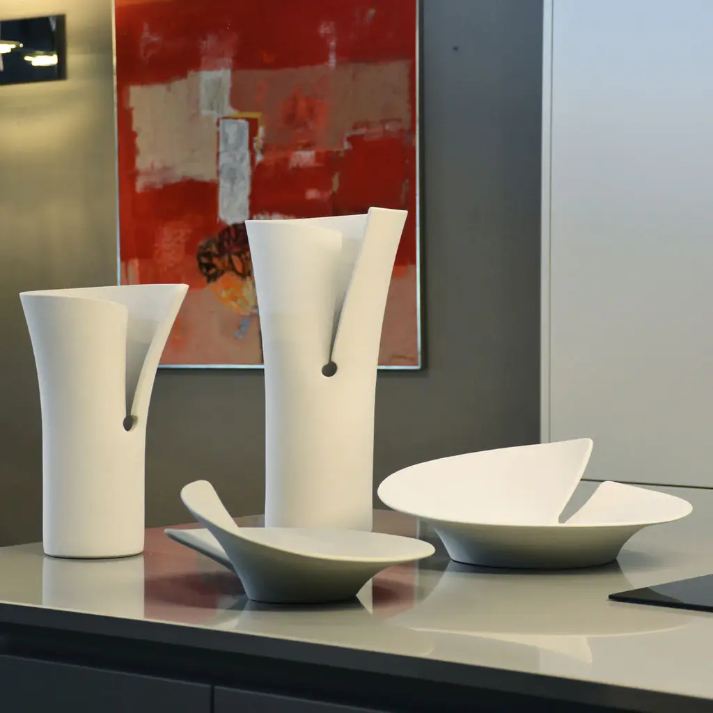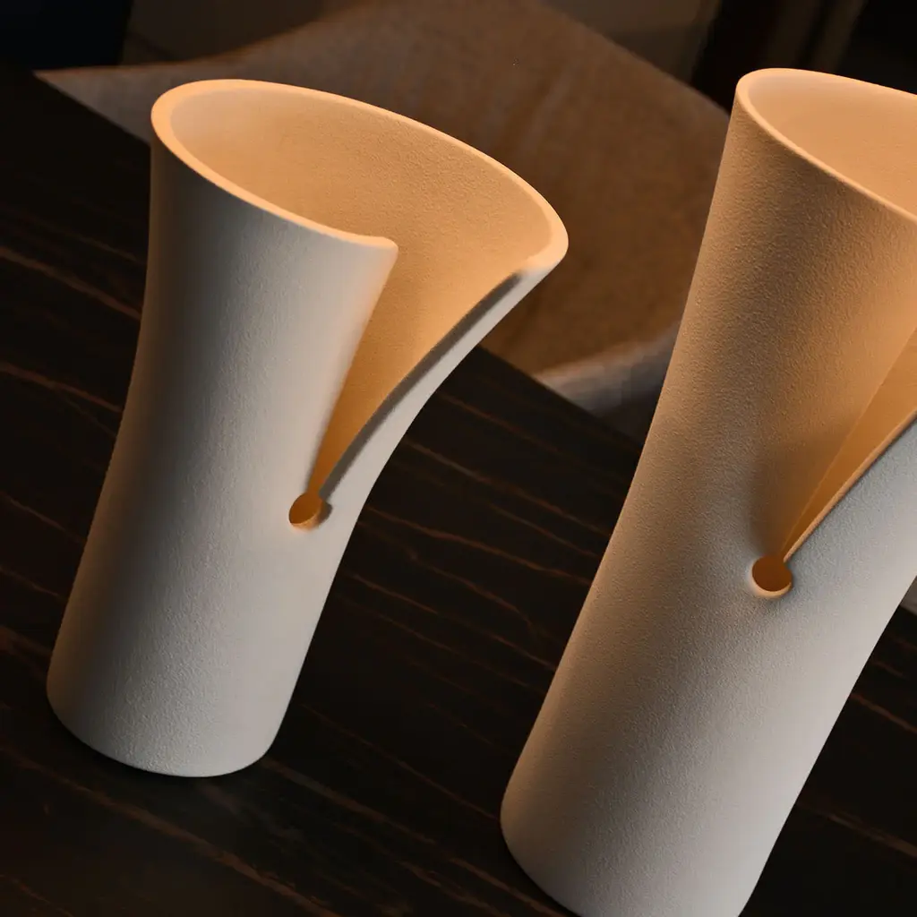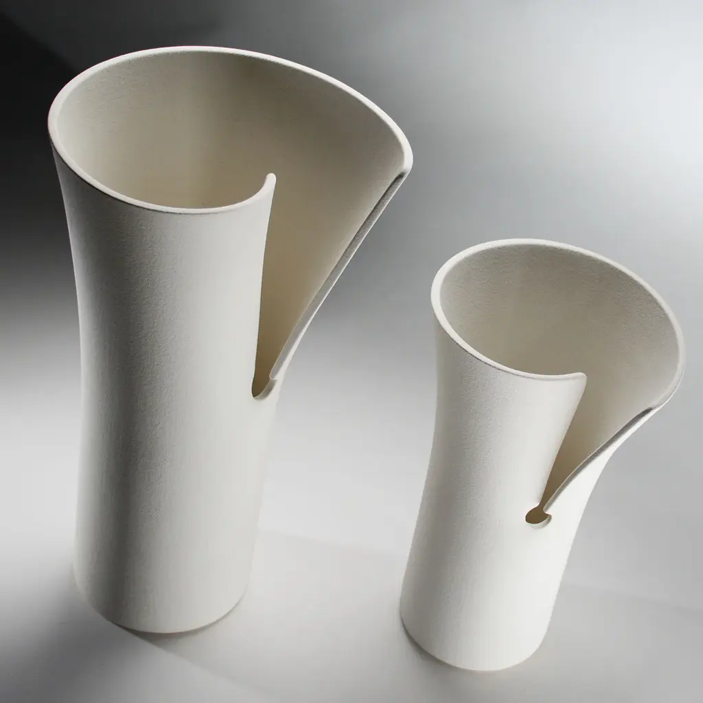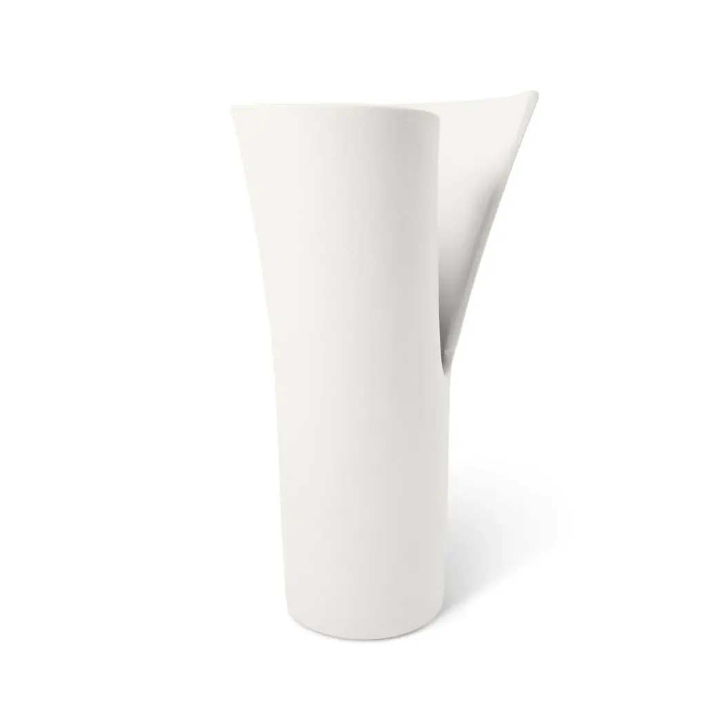 An elegant and refined presence is given by the design of this vase: its original helix opening, inspired by a sheet of paper rolled up on itself, gives particular lightness and originality to the work.