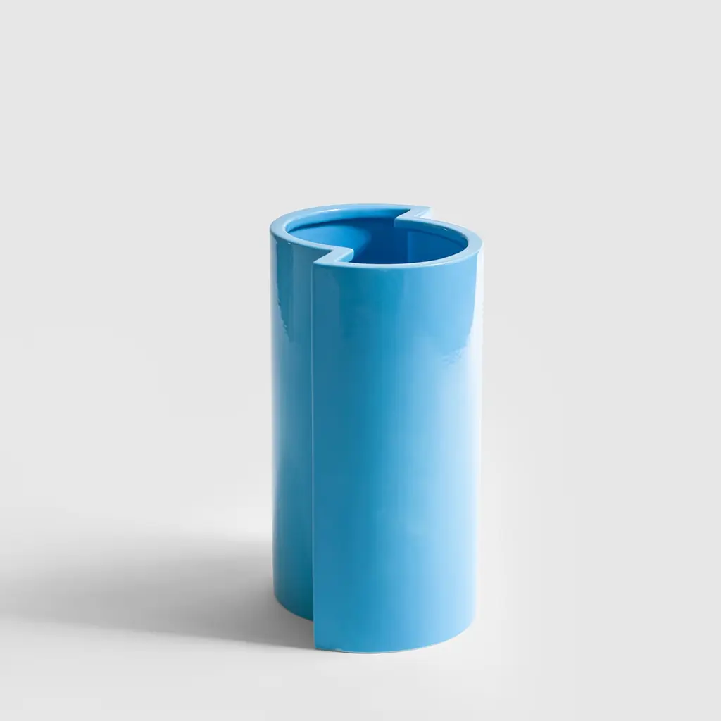 The Bishop Vase from Sara Khamisi's Kish o Mat collection features a cylindrical body with two slightly offset halves, inspired by the bishop's diagonal chess moves. Handcrafted in Milan from slipcast ceramic, it boasts a blue turquoise glaze with charming imperfections. Its clean, contemporary design suits any interior, adding sophistication and artistic flair. Inspired by Persian heritage, this piece blends cultural and modern aesthetics.