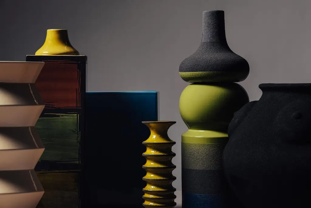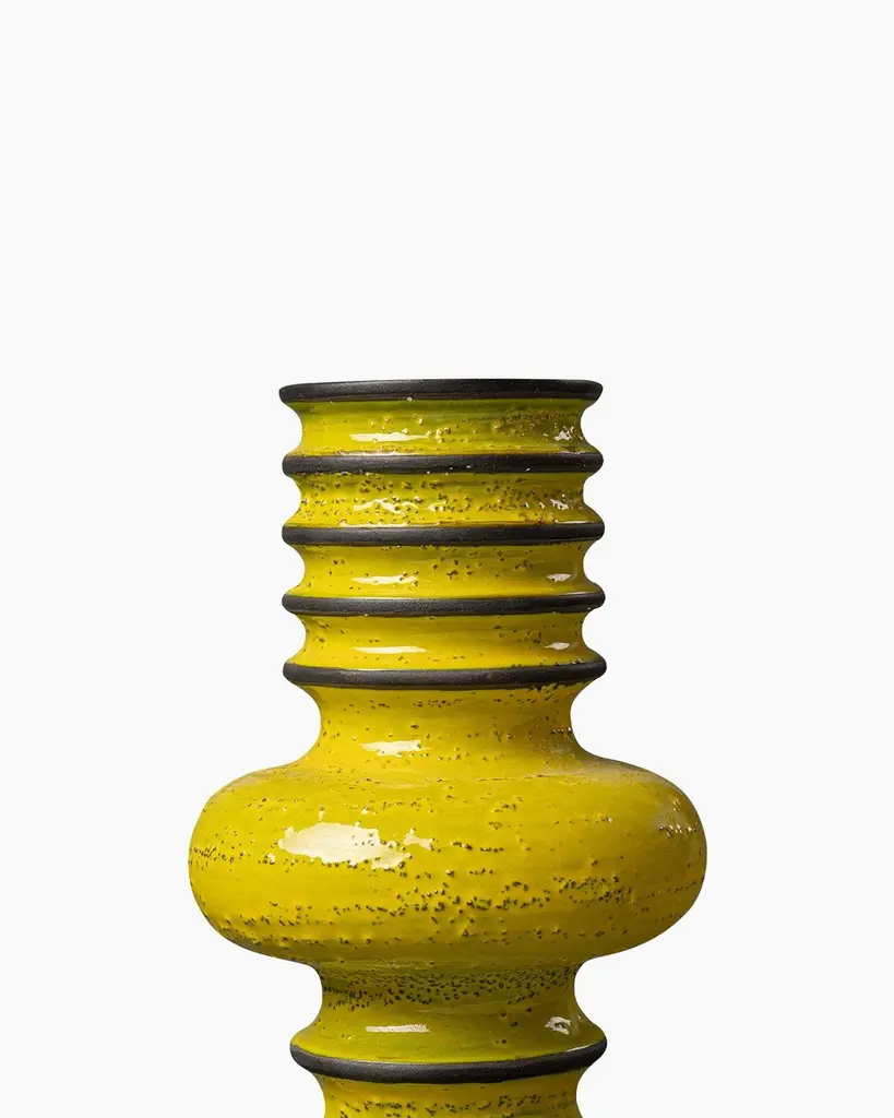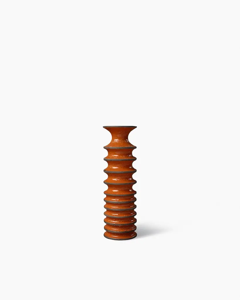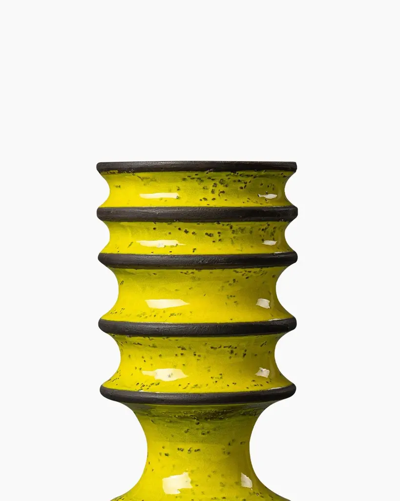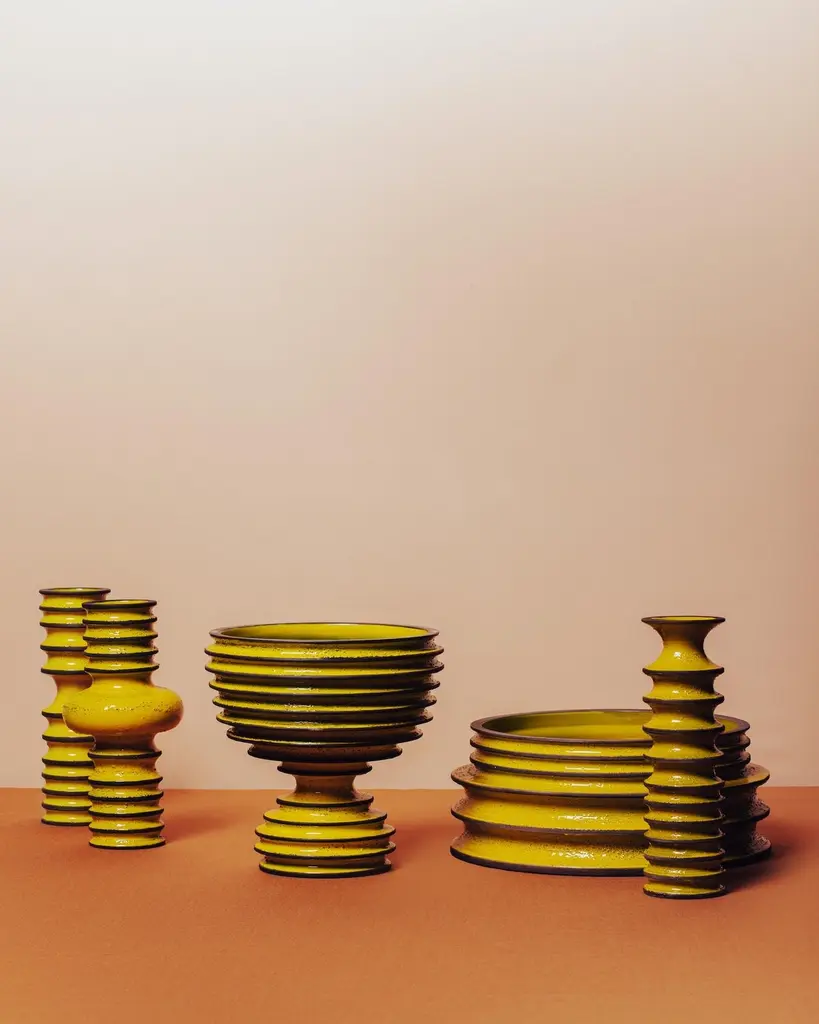 The collection features a sequence of spiral shapes evolving into various dimensions, presented in warm colors such as yellow and orange, interspersed with thin brown bands that emphasize the contours. Realized through the slip-casting technique in white clay, the pieces have textured surfaces created by mixing sand into the engobe (a clay-based slip color). Presented in 2019, Revolver includes three vases, a bowl, and a cup.RevolverA sequence of spiral shapes in various sizes, featuring warm tones such as yellow and orange, is interspersed with thin brown engobe bands that enhance the form. Revolver consists of three distinct designs: cylindrical vases, bowls, and cups.Design by Christoph RadlChristoph Radl (Switzerland, 1954) moved to Milan in 1977, where he met Ettore Sottsass and designed the identity of Memphis. In 1993, he founded RADL, a studio specializing in art direction, communication, and graphic design, working across fashion, design, publishing, and art. Since 2014, he has been the creative director of Cabana magazine.