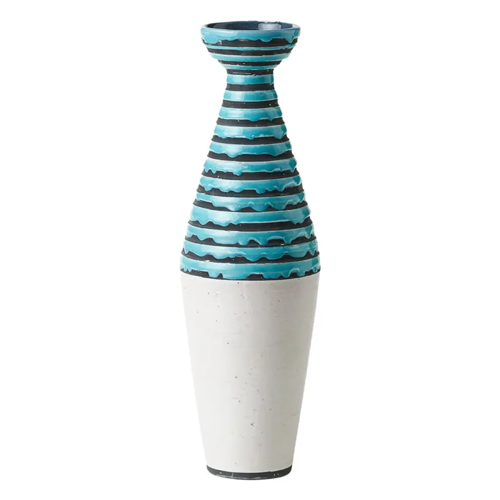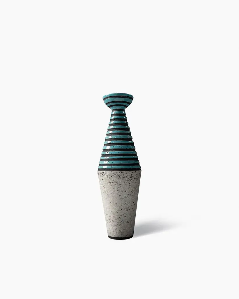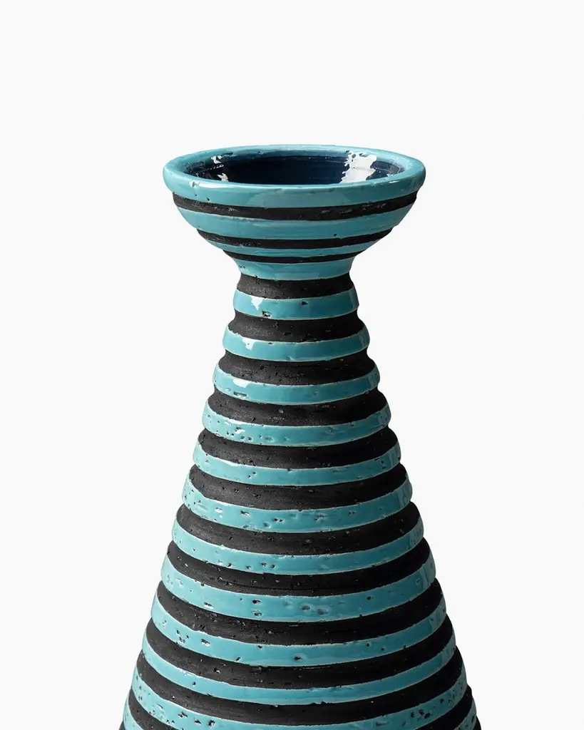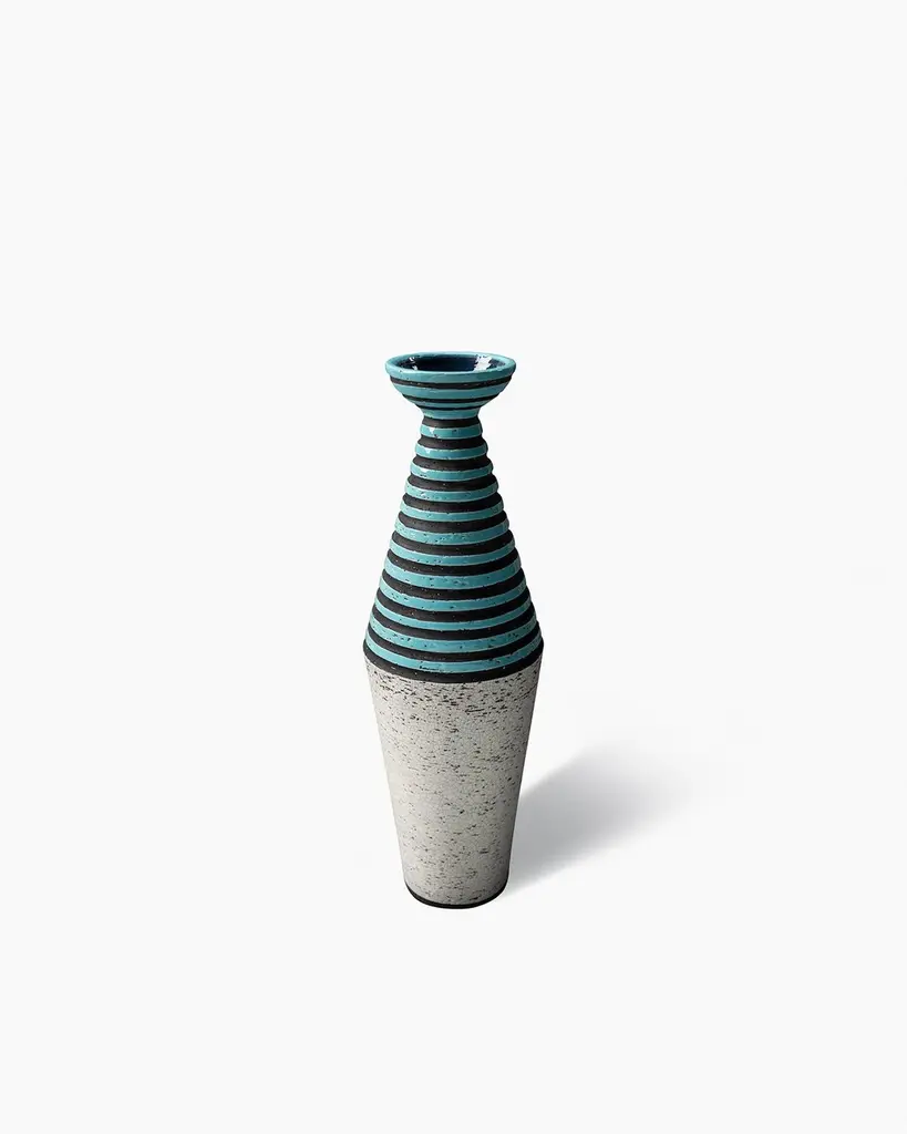 Hand-thrown in refractory red clay. Decorated with horizontal stripes painted in wax and glossy turquoise glaze, with a craquelé white base.Production year: 1953.Re-edition year: 2004 – Limited edition of 199 pieces.All Bitossi ceramics are entirely handmade by our artisans at every stage of the production process.Riedizione Archivio StoricoThe Riedizioni collection recreates Aldo Londi’s ceramic works from the 1950s, 60s, and 70s, preserved in the Bitossi Museum Archive. Produced in limited editions, each piece bears the original inventory number on its base, along with the name of the historic brand “Cav. G. Bitossi & Figli.”The Riedizioni collection was launchedin 2003, coinciding with the inauguralexhibition highlighting the history of Bitossiand Aldo Londi’s production. Each piece inthe collection is a faithful reproduction ofan original work preserved in the BitossiMuseum Archive. These limited‑editioncollectibles are meticulously crafted, andeach piece is identified with the inventorynumber of the original and the name of thehistoric brand “Cav. G. Bitossi & Figli” at thebase. The ceramic pieces in the collectionwere created between the 1950s and 1970sand represent Aldo Londi’s modern artistry.