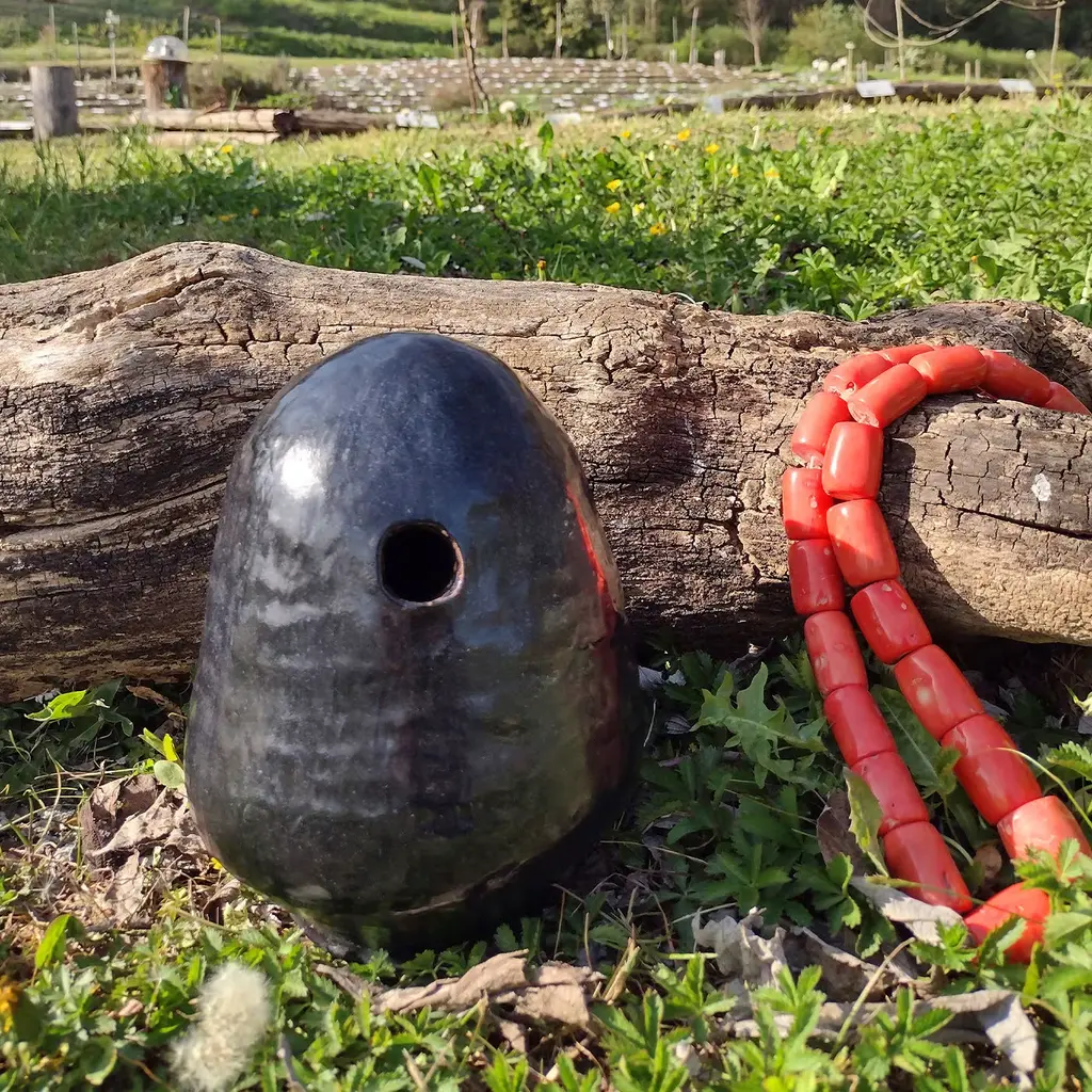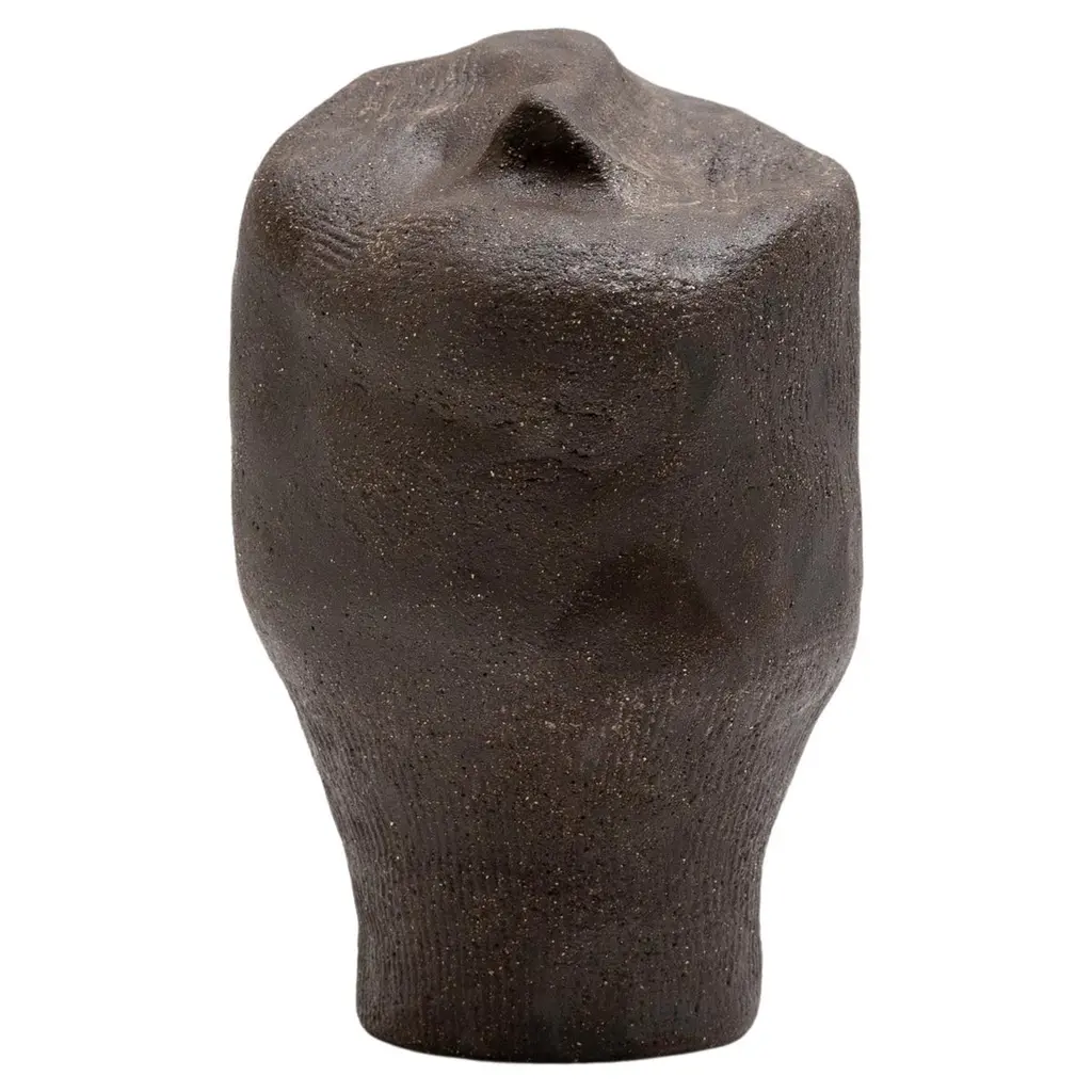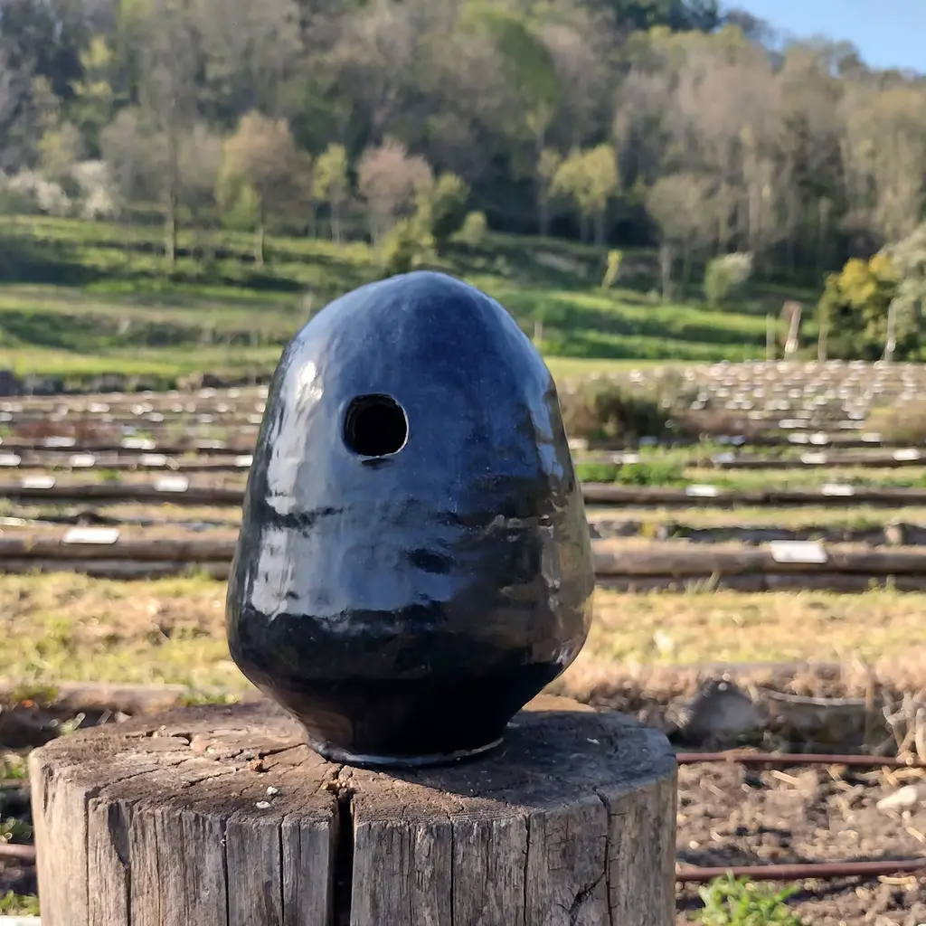 Part of a 1981 collection of vases by artist Maurizia Carantani, this piece flaunts an intriguing shape reminiscent of a birdhouse. Sleek and polished, it is defined by an oval silhouette enriched with a small hole on the front. Handcrafted of single-fining terracotta, it is lacquered in a timeless combination of blue and black hues.