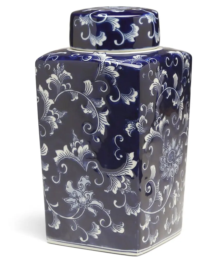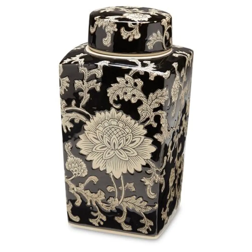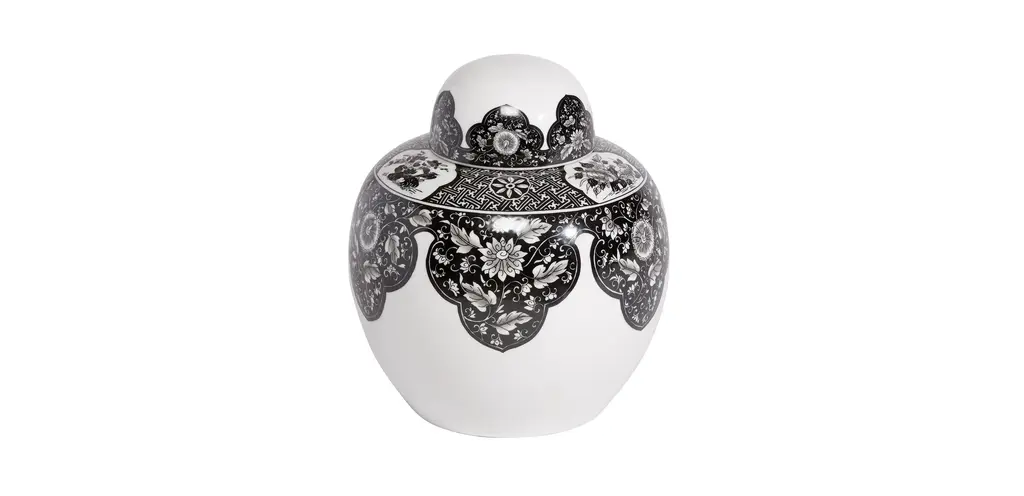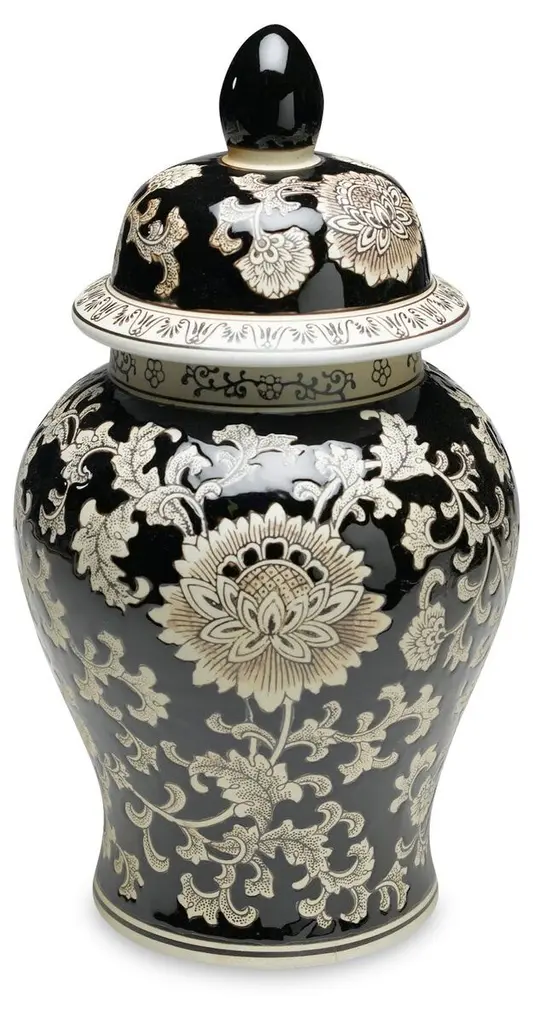 This porcelain vase is artfully adorned with cream-colored flourishes against a glossy black finish for a timeless look that we love.