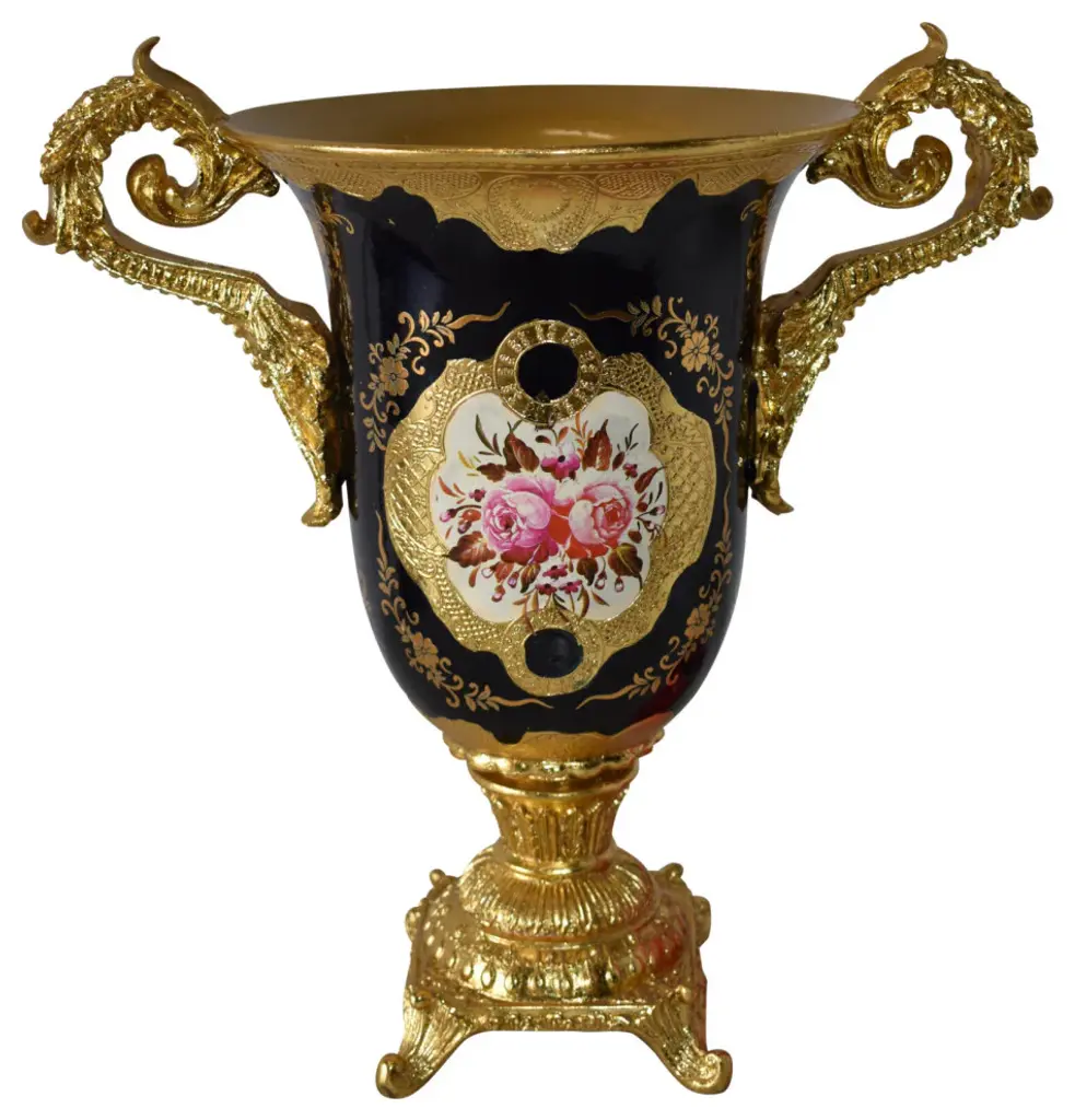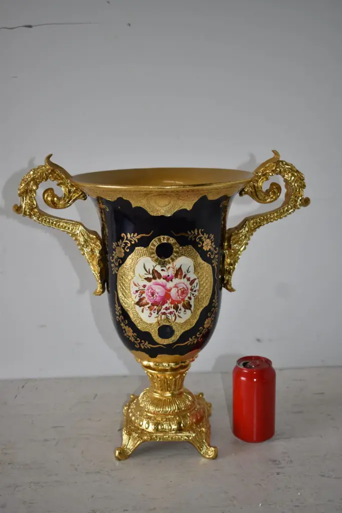 This resin vase was created with a krater design in mind. With a gold base and handles and a central pink flower design, the contrasting and beautiful colors add value to the impact this piece will make in any room of your home. Size: 17"L x 10"W x 16"H. Weight is: 8Lb