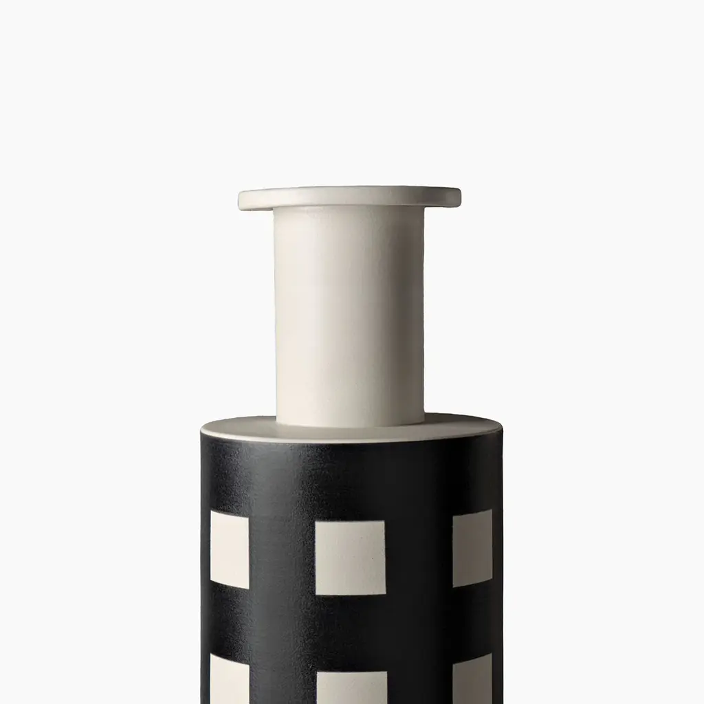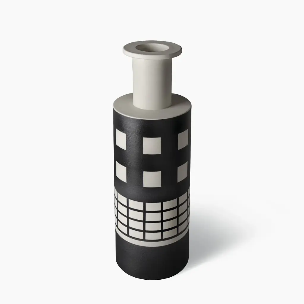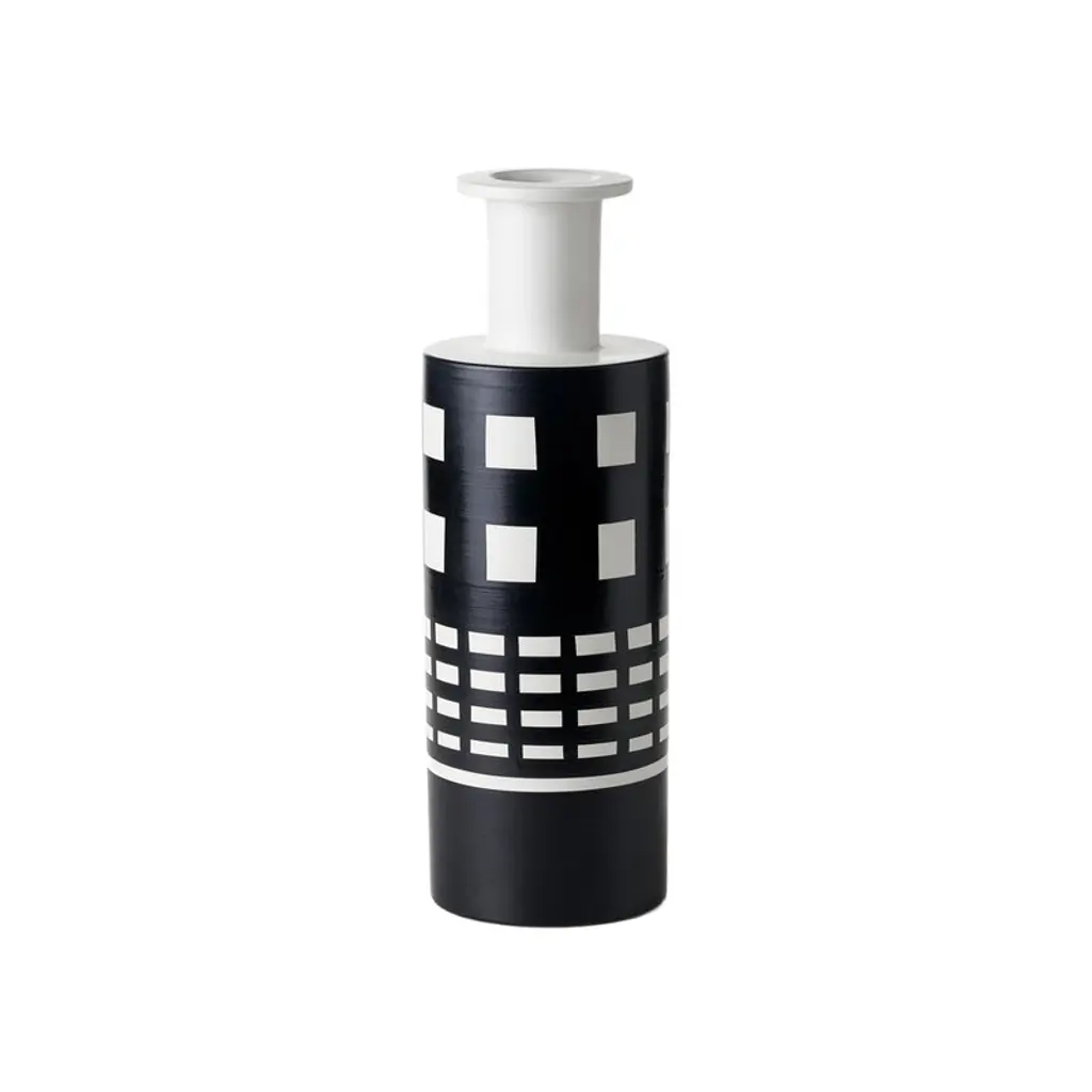 This vase's simple shape is complemented by its geometric decoration that features striking motifs in black on the white background of the cylindrical shape. This piece was designed by renowned architect Ettore Sottsass in 1962.
