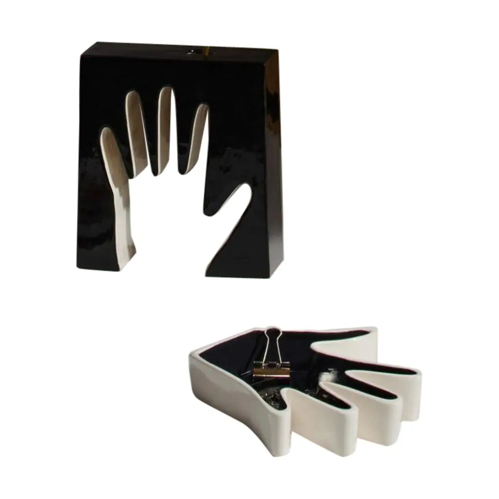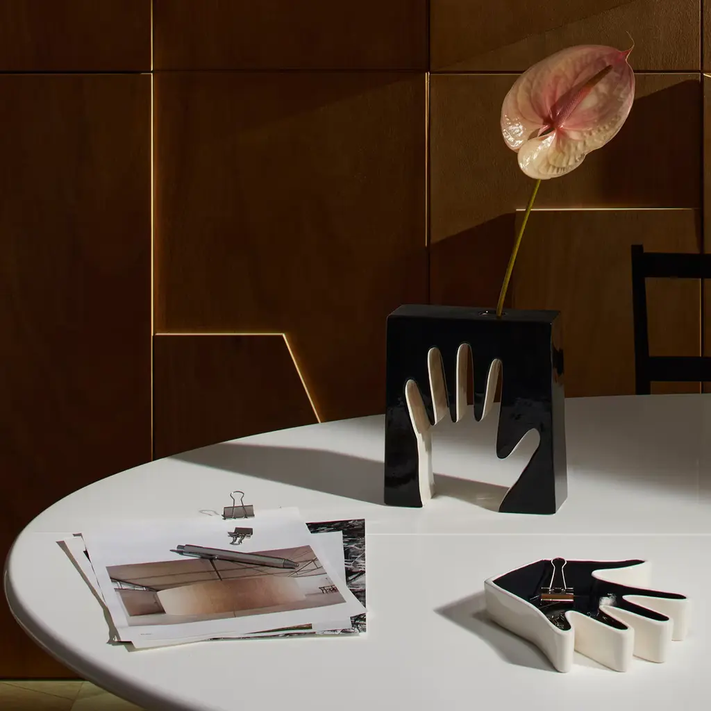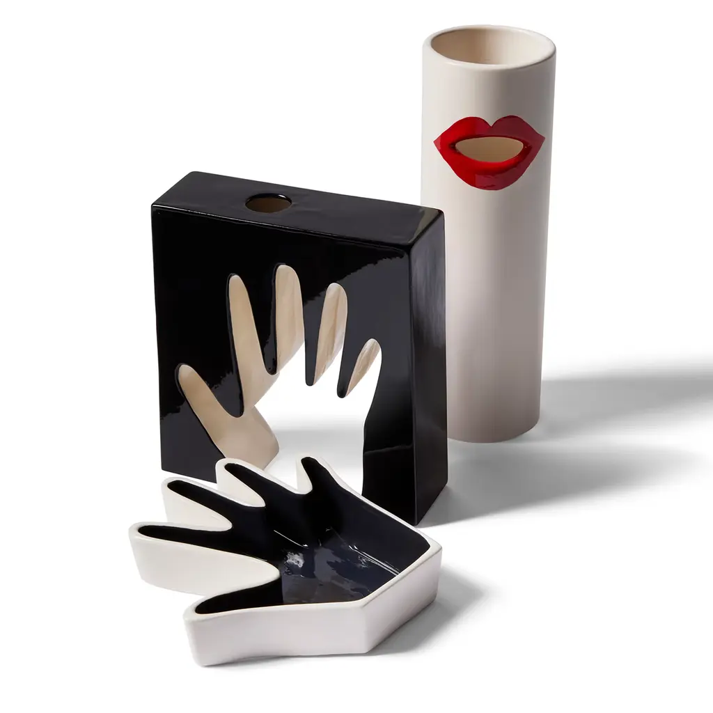 The vases and pin trays in the Impronta ceramics collection grew out of the creative talent of Ico and Luisa Parisi. Conceived in the 1960s by the designer and his wife as a sophisticated series of home accessories, the pop-art influence is clear. Cassina re-edits a cylindrical vase with an opening in the shape of a mouth, a single-stem vase characterized by a hollow contour in the shape of a hand, and a pin tray that reproduces the cast of an open hand, poised to receive small everyday items.