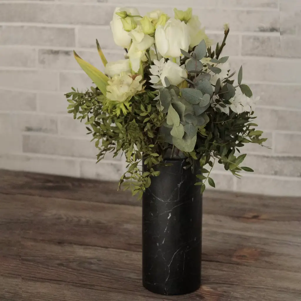 Used to hold flower arrangements or simply as a decorative object d'art alongside other pieces from the same series showcasing prized marbles, this cylindrical vase will make a statement in a modern decor thanks to its pure and minimal design skillfully handcrafted of matte-finished black Marquina marble.