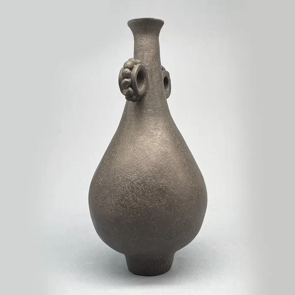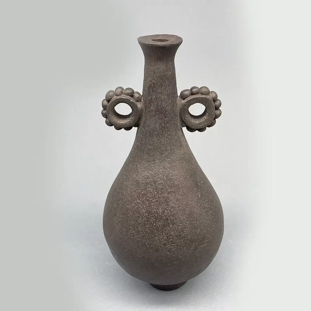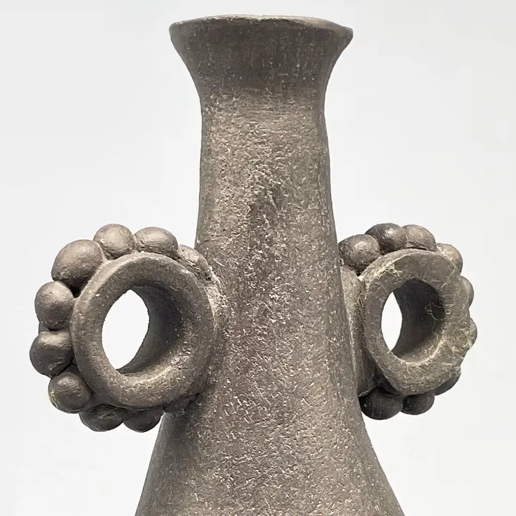 A striking piece that showcases the beauty of crafted ceramics. Made from a rich black stoneware with 20% fine chamotte, this vase is expertly shaped using sheet and coil techniques, resulting in a unique, slightly textured finish. Fired at medium temperatures, its surface remains unglazed, accentuating the authenticity of the material. Finished with shellac applied by pad and polished with beeswax, it highlights both its elegant silhouette and raw aesthetic. Ideal for complementing a variety of decorative styles, this versatile vase serves as a standalone statement piece in any home decor setting. One-of-a-kind piece.