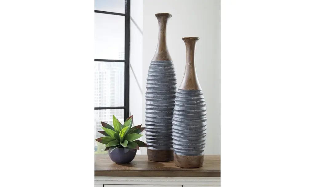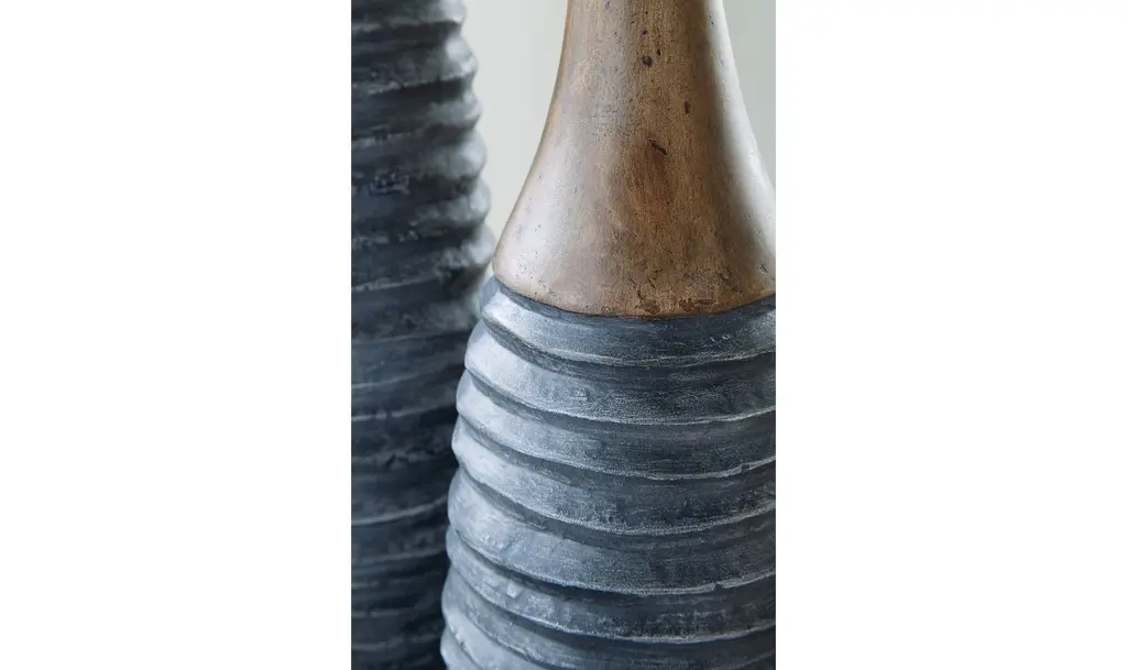 Elevate your home décor with the Blayze Vase Set, a tasteful ensemble designed to infuse texture and character into any space. Crafted from composite paper materials, these vases offer a contemporary twist on traditional design. The set comprises two distinct pieces, each showcasing an antiqued gray finish that exudes timeless elegance, complemented by subtle brown accents for added depth. With their sculptural form and refined aesthetic, these vases serve as versatile accent pieces, effortlessly blending into a variety of interior styles. Whether placed together on a mantel or separately adorning different corners of your home, they make a statement that is both understated and sophisticated. The Blayze Vase Set not only enhances the visual appeal of your living space but also provides a canvas for your creative expression. Experiment with different floral arrangements or let them stand alone as striking art objects – the possibilities are endless. Add a touch of design brilliance to your home décor with the Blayze Vase Set, where contemporary craftsmanship meets timeless allure.