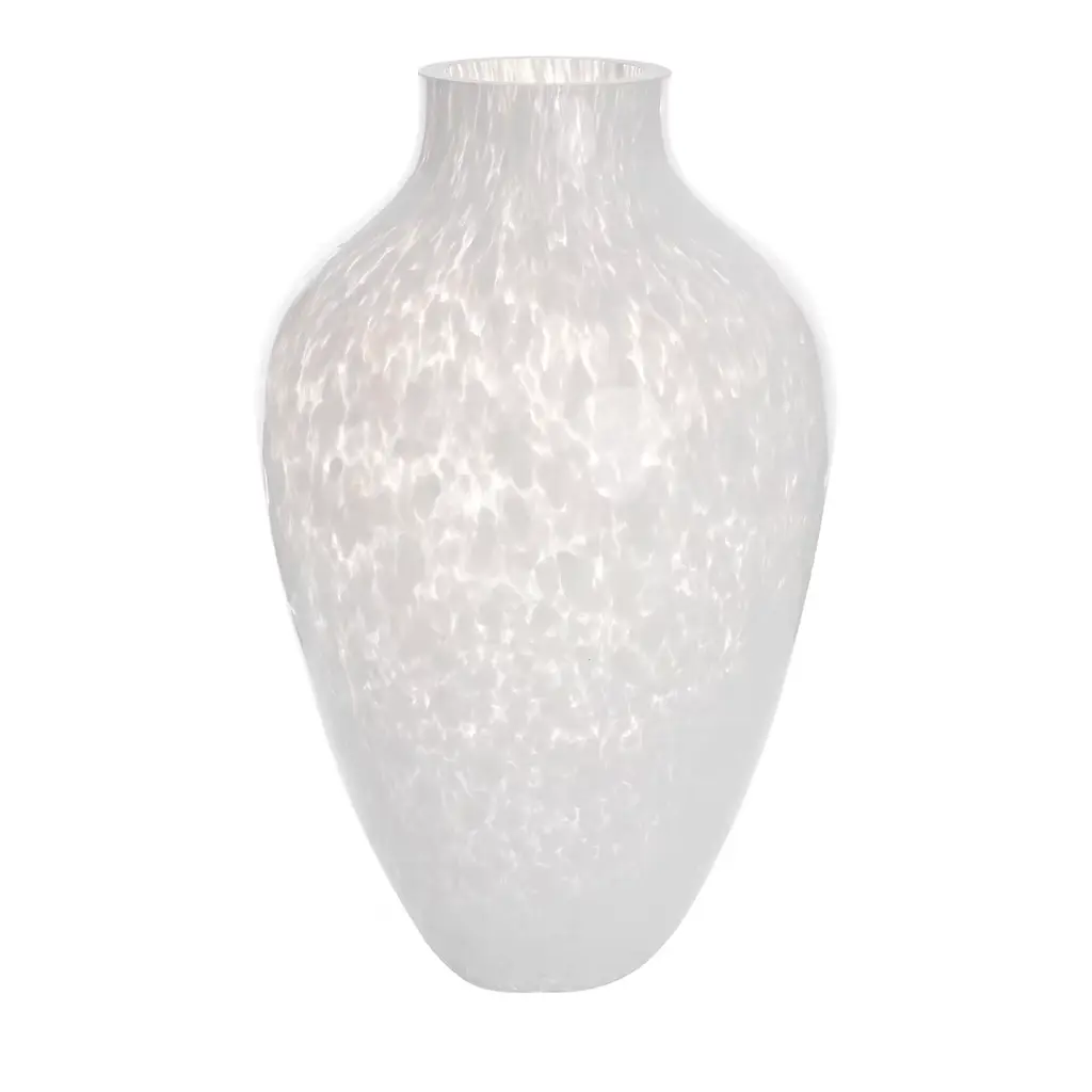 The Blizzard Vase is a gorgeous decorative accent with a pristine look, showcasing a curvy silhouette and a pristine white hue. Crafted from white art glass, the vase is overlain with swirling winter tones that evoke imagery of a howling blizzard.