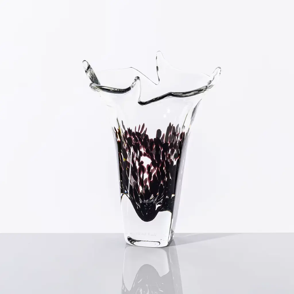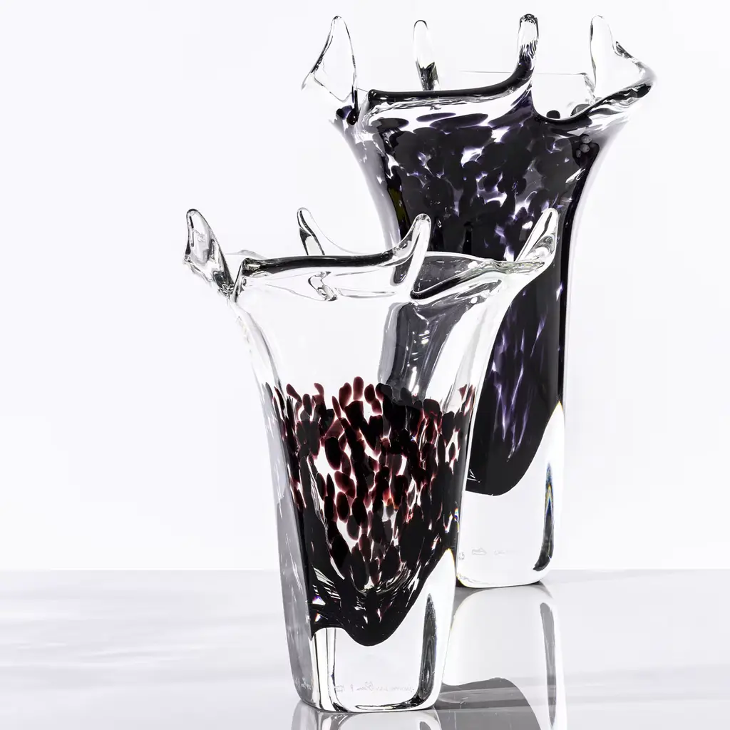 A collection of vases and centerpieces bearing Marco Piva's signature signifies sustainability and the revival of the practically eternal material—glass. The Bloom vase, guided by Marco Piva, is crafted by expert glassmakers in an exclusive blend of differently colored and granulated crystals and glass, forming a limited and numbered series. Each piece, unique in its form and decorative essence, stems from a meticulous fusion of selected materials reclaimed from prior works.