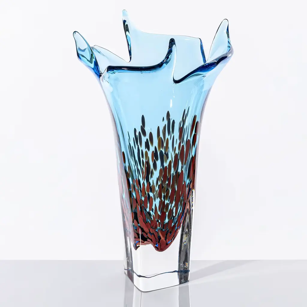 A collection of vases and centerpieces bearing Marco Piva's signature signifies sustainability and the revival of the practically eternal material—glass. The Bloom vase, guided by Marco Piva, is crafted by expert glassmakers in an exclusive blend of differently colored and granulated crystals and glass, forming a limited and numbered series. Each piece, unique in its form and decorative essence, stems from a meticulous fusion of selected materials reclaimed from prior works.