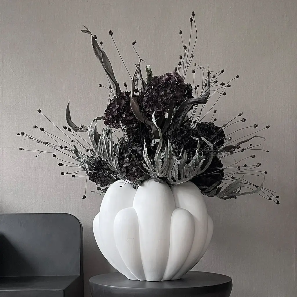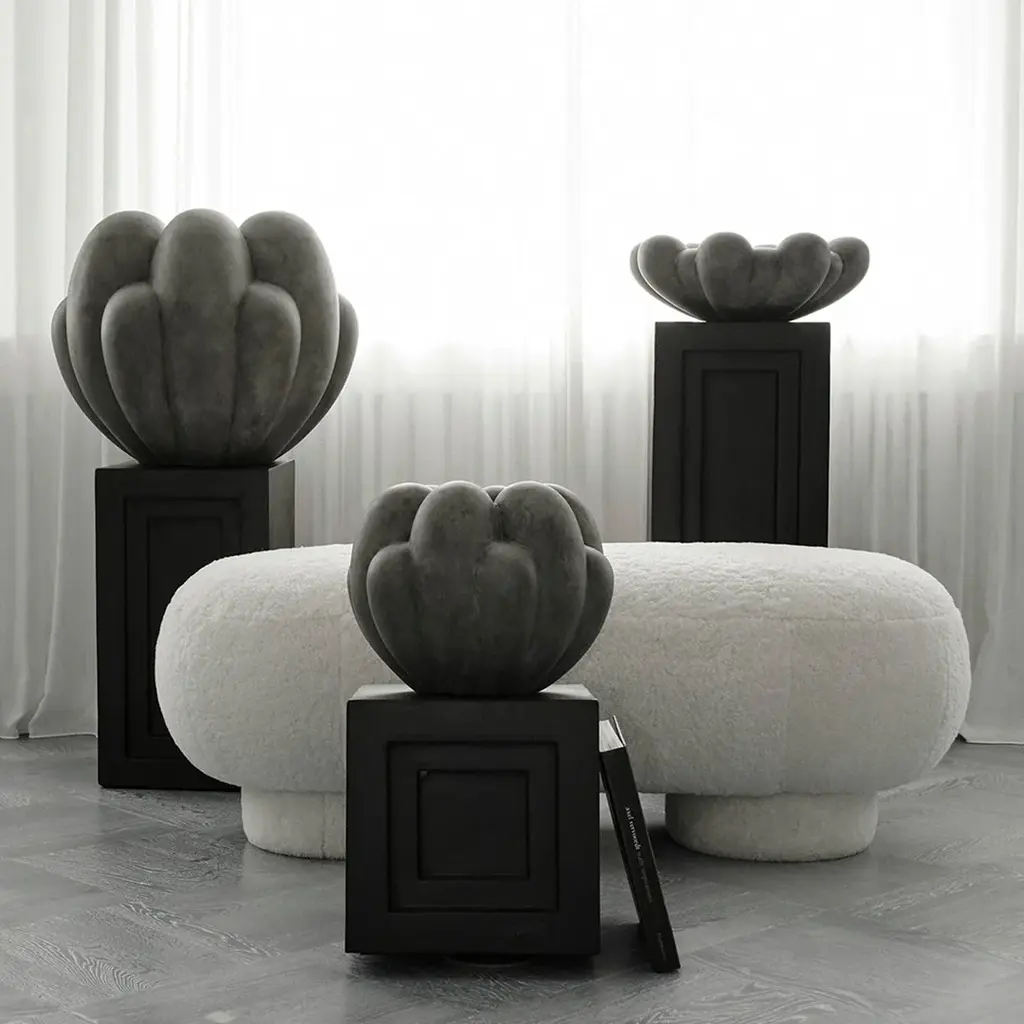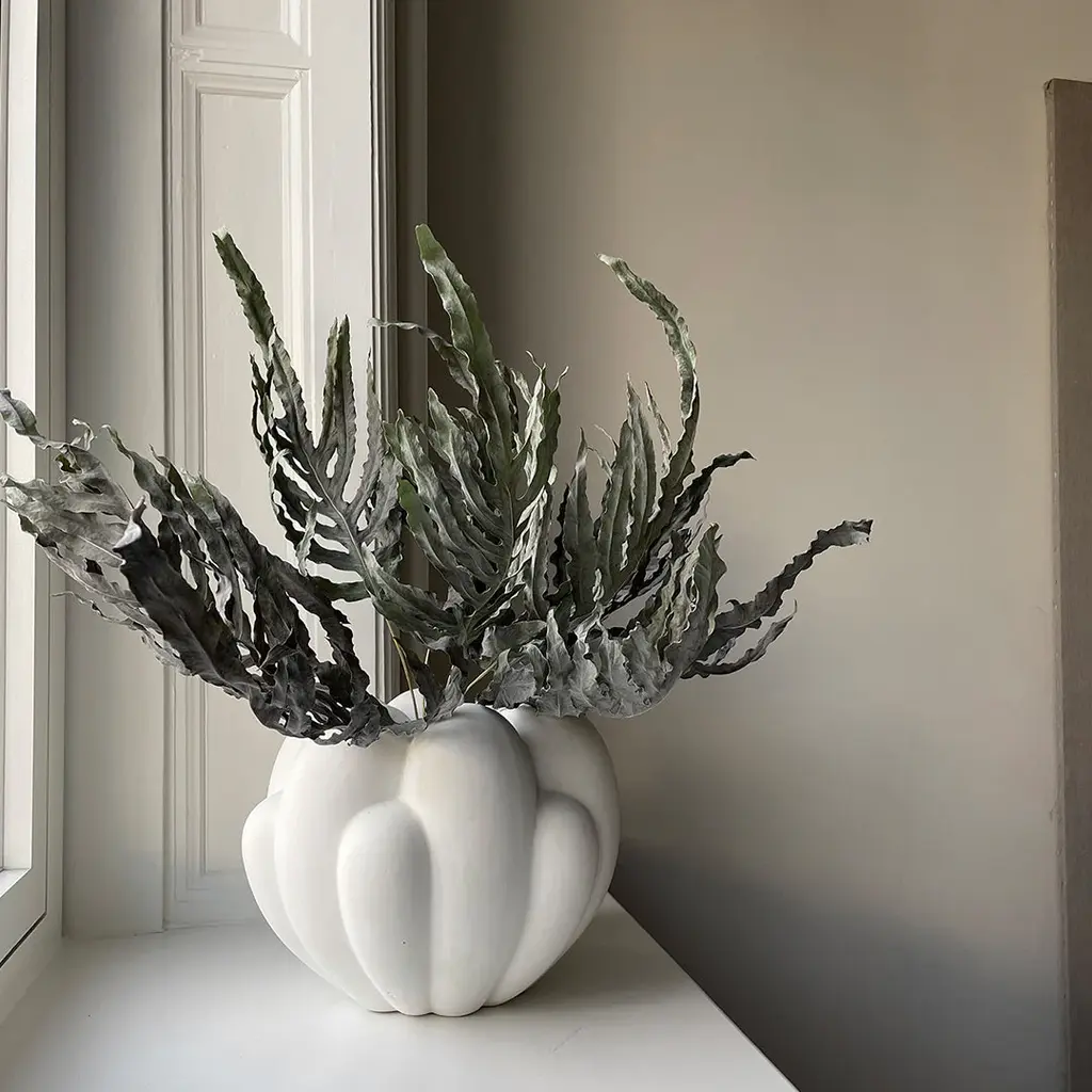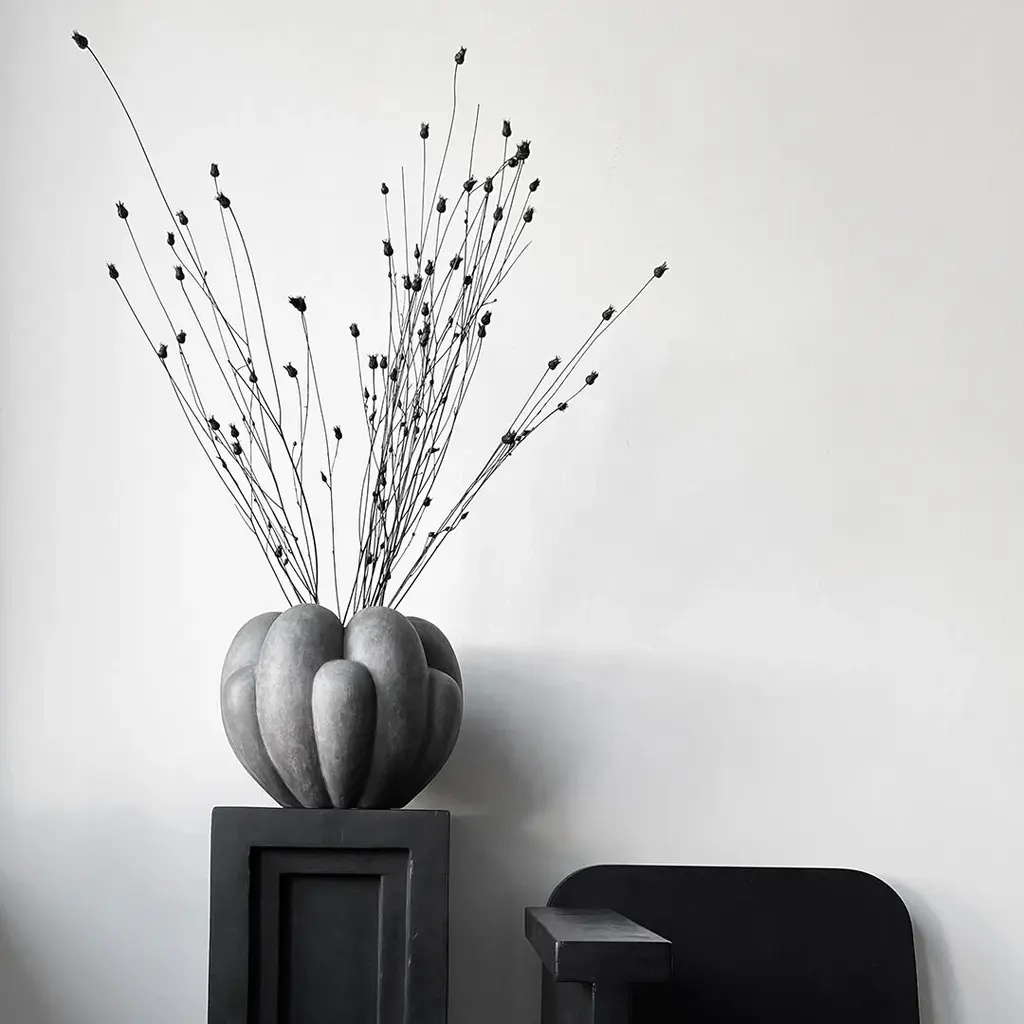 Inspired by floral shapes, Bloom emphasizes soft and organic shapes into a collection of sculptural ceramic vases and bowls. Elegantly sculpted, each Bloom ceramic is characterized by several flower leaves fading into each other, reminiscing the different stages of a flower from closed to open. Bloom is an interpretation of 70s floral inspired design. But with a more raw and clean expression. The smoothly curved surface is contrasted by a strong underlying geometry and is enriched by a beautiful play of shadows around the depths of the surface. Due to its expressive design, the Bloom vases changes experience throughout the day, according to the position of light and shadows. Bloom comes in both vases and bowls and is made from ceramic or fiber concrete. The surface is hand glazed in order to achieve the unique surface texture. The colours may vary slightly, due to that it is a handmade product. The vase is not 100% waterproof, therefore a bag for fresh flowers is included. Designed by Kristian Sofus Hansen & Tommy Hyldahl.
