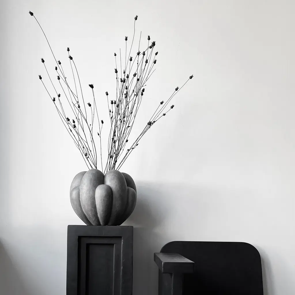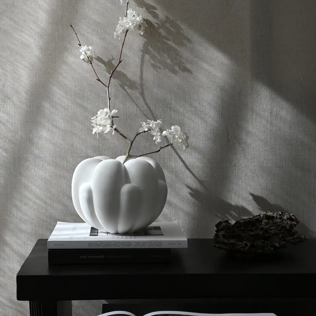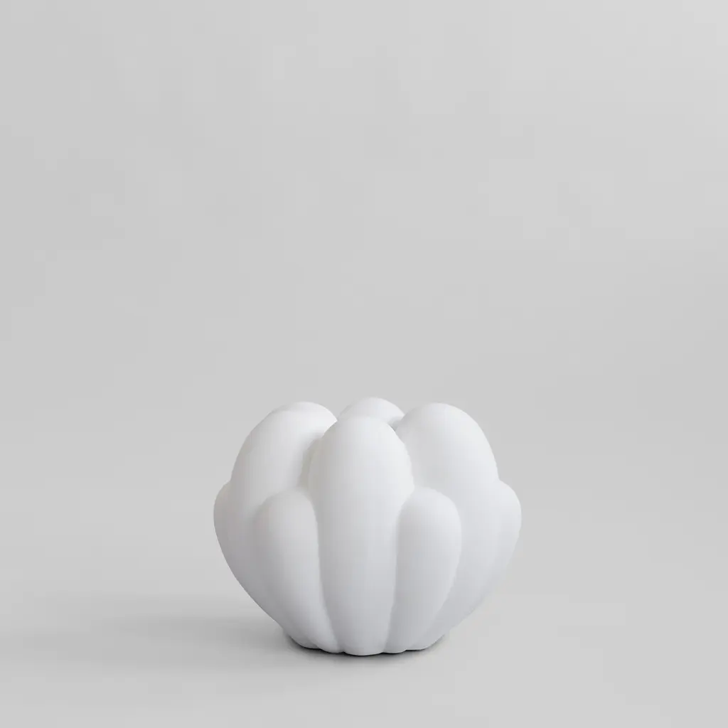 The 101 Copenhagen Bloom Vase is a sculptural piece that celebrates organic forms, with fluid shapes resembling flower petals gently merging into one another. Inspired by floral designs from the 1970s, the vase offers a raw, minimalist take on these natural elements. Its appearance transforms throughout the day, as light and shadows play across its surface, highlighting its dynamic form. Hand-glazed for a unique texture, each Bloom Vase features subtle color variations, making every piece distinct. While not fully waterproof, the vase comes with a bag for displaying fresh flowers, adding both function and artistry to any space.