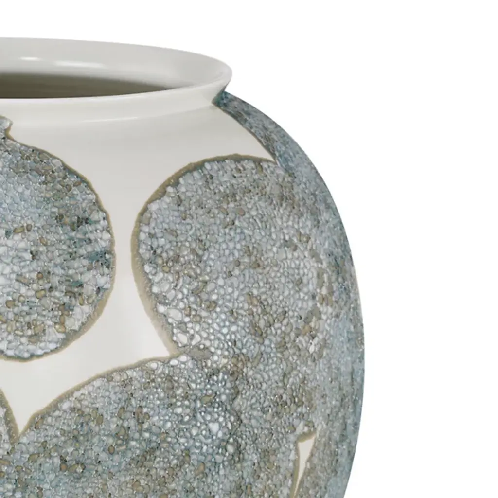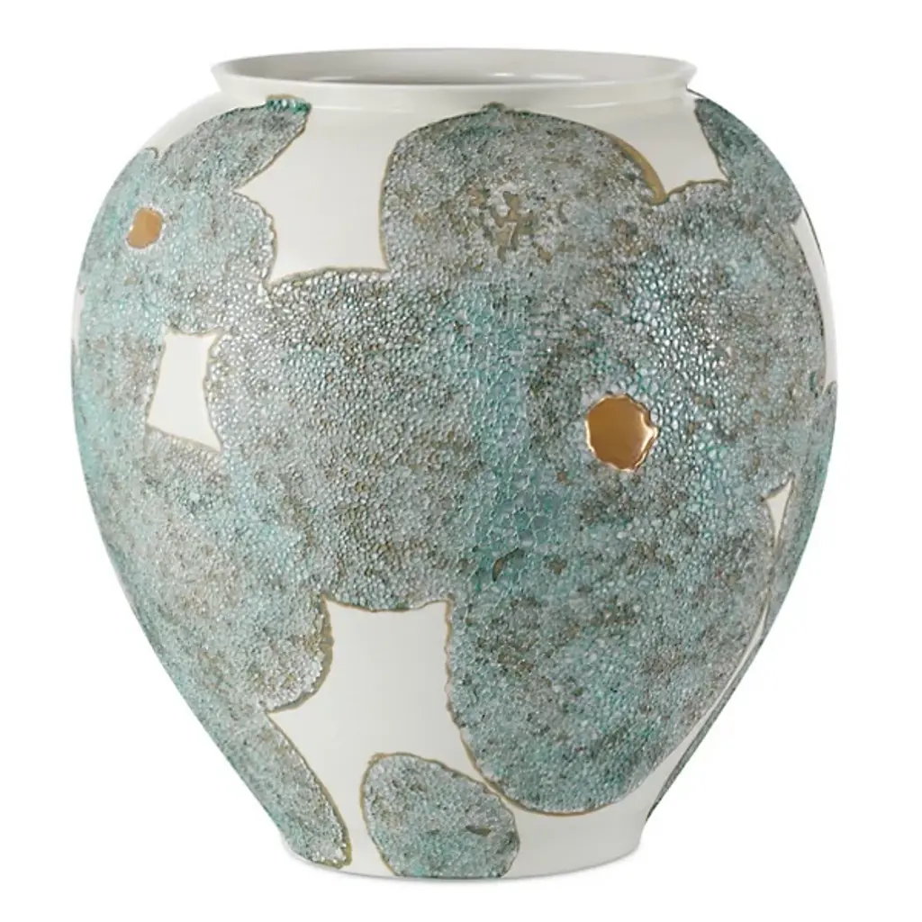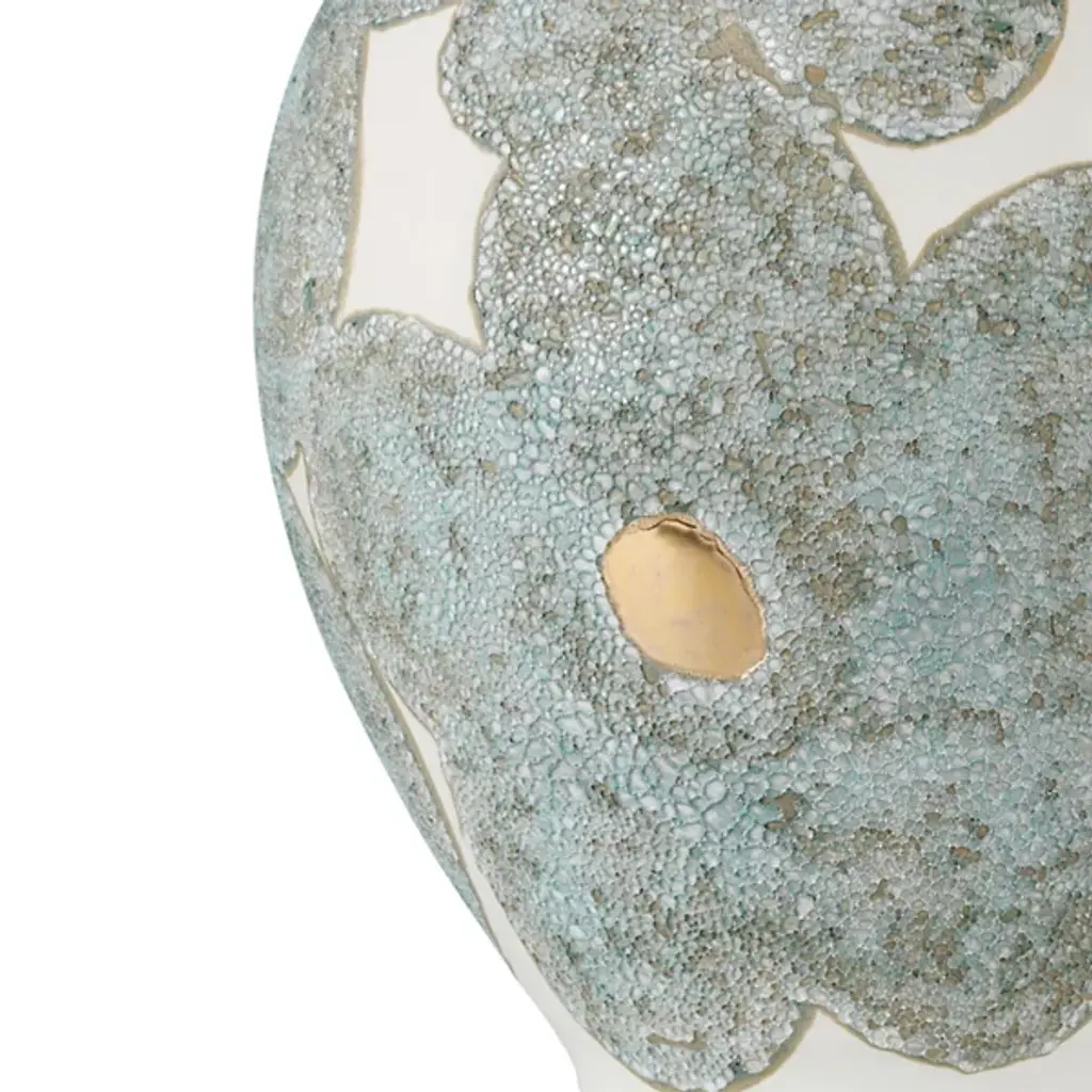 The Bloom Vase from Currey & Company incorporates hand-painted poppy motifs rendered in textured blue, ivory, and gold glazes across fine porcelain. A reactive bubble glaze technique creates rich surface texture, ensuring no two vases are identical. Metallic gold centers accent each poppy bloom, adding subtle shimmer that catches light from different angles. The classical vase form provides a timeless backdrop for the botanical design, while the high-quality porcelain construction ensures durability.