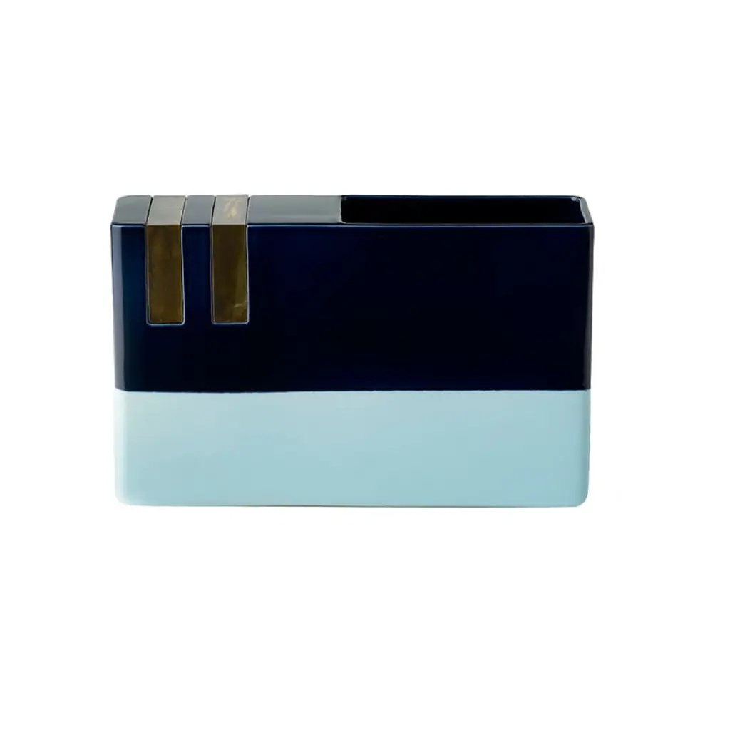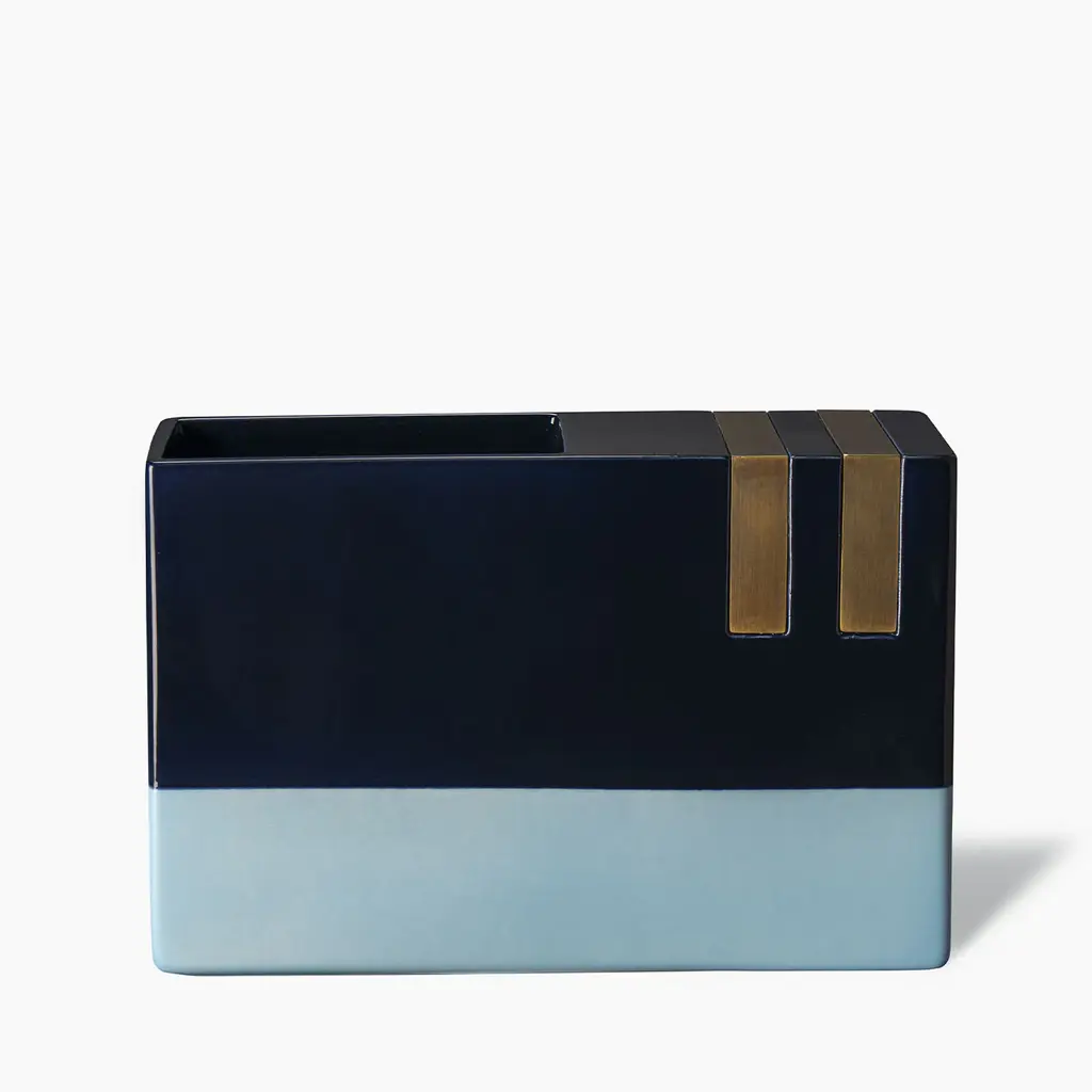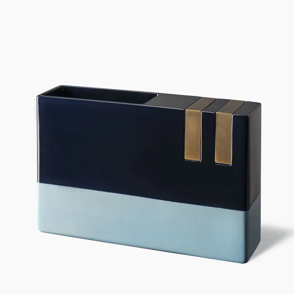 This rectangular vase in white clay has a geometric design highlighted by a simple color block decoration: pale blue at the bottom and black at the top. Two brass brackets hold the top on one side, creating a striking contrast with the dark color of the finish. This piece was created for Bitossi by Dimore Studio in 2016.