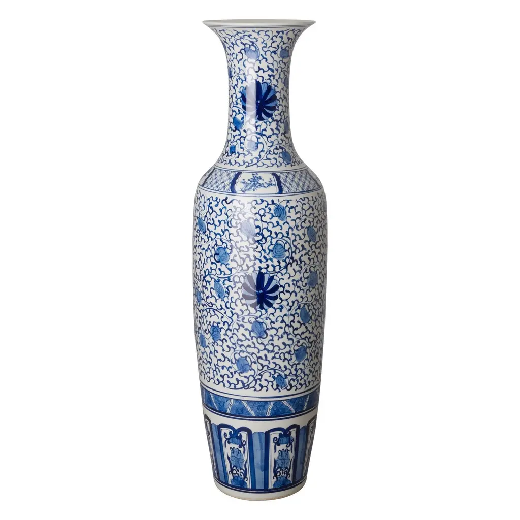 Featuring a floral design this tall floor vase will bring elegance into your home. Material: Porcelain Dimensions: 16"Ø x 56"H Finish: Blue and White Hand Painted Glaze