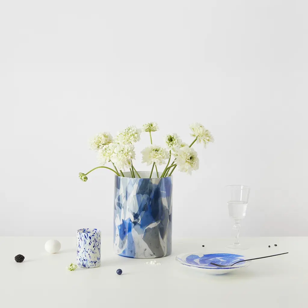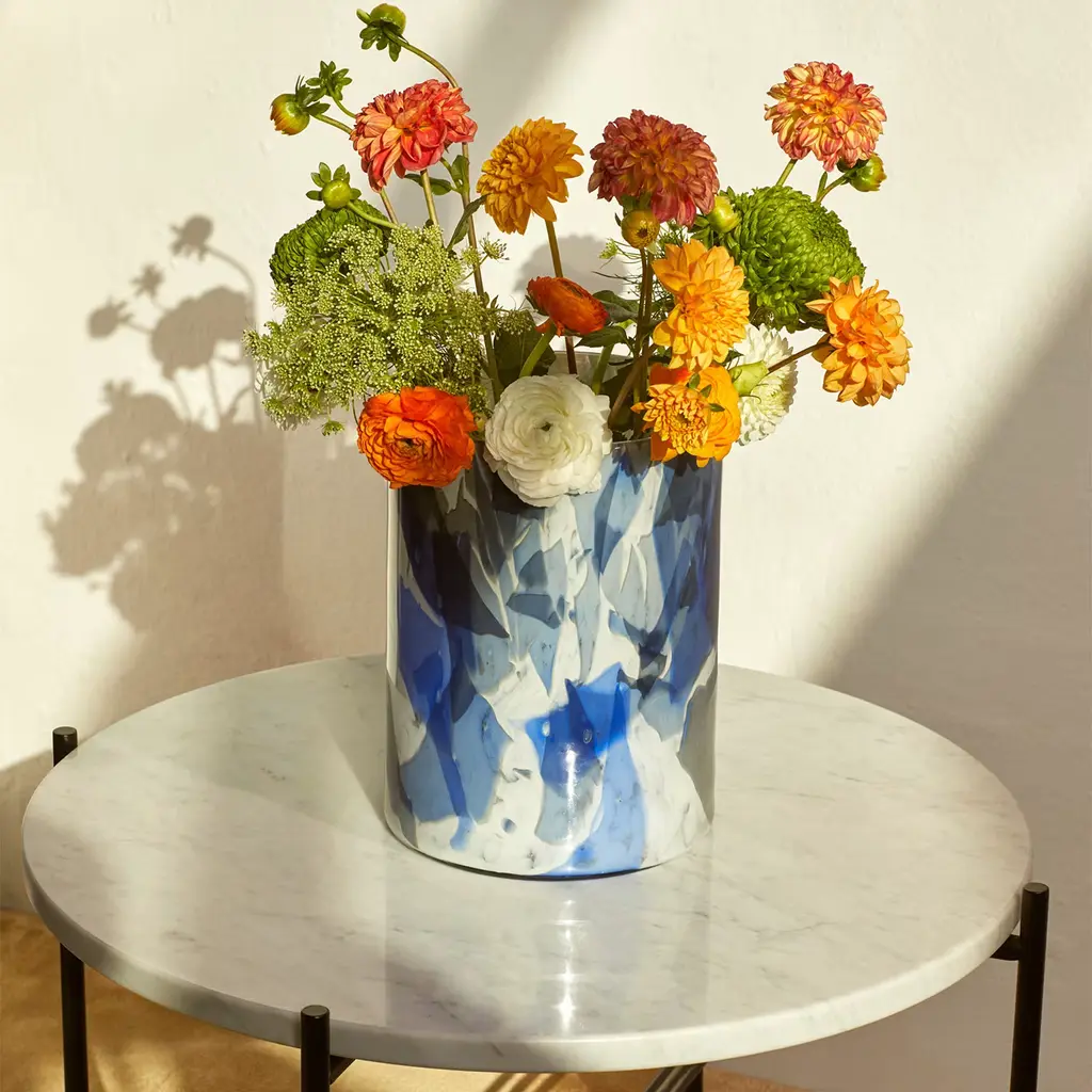 The Blue Large Vase in Murano blown glass, crafted using the Nougat technique, features a captivating fusion of ever-changing hues on an ivory base. Its classic proportions make it perfect for large floral arrangements or as a stunning centerpiece. Handcrafted with precision, each vase is one of a kind, showcasing the timeless elegance of Italian craftsmanship. This unique piece elevates any space, bringing artistry and sophistication to your home decor.